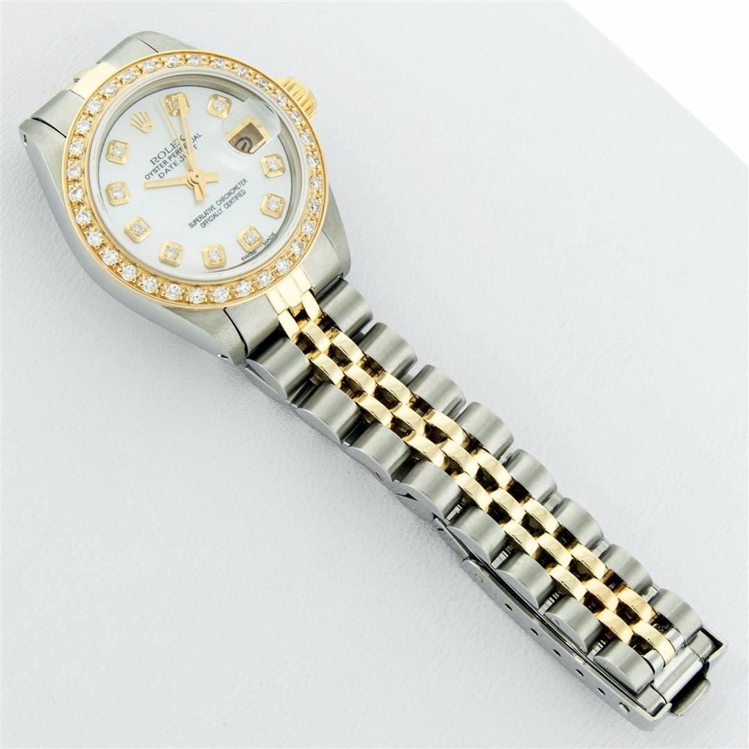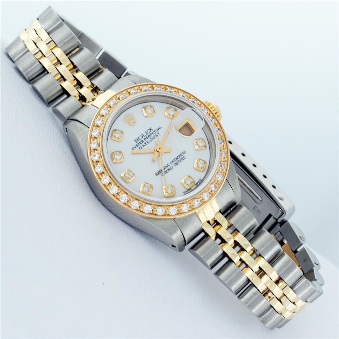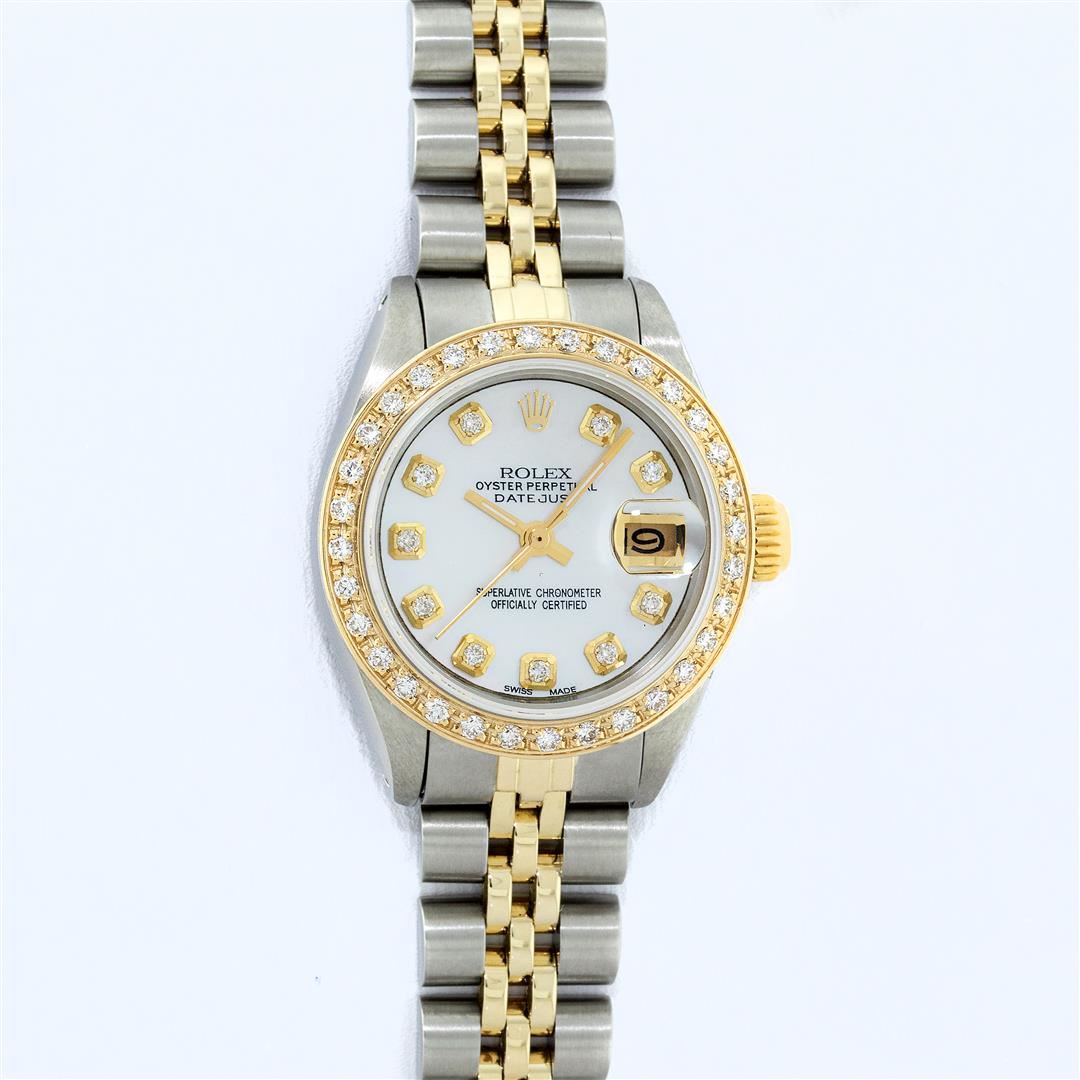 One Ladies Two Tone Yellow Gold Rolex Datejust Polished, Serviced & Electronically Tested, Yellow Gold & Stainless Steel Case: 26mm, Yellow Gold Crown, Custom Bezel: 18K Yellow Gold Beadset Diamond Bezel, Diamond Count: 32 Diamonds Total Weight.70 Carat, Clarity: Si-VS, Color: G to H. Custom Crystal: Synthetic Sapphire Cyclops Lens. Custom Hands: New Luminescent Hands. Movement: Automatic Winding Movement. Custom Dial: Mother Of Pearl Dial Set With Diamond Hour Markers, 10 Diamond in Dial G To H In Color, SI-VS Clarity. Date Window: 3 O'Clock Position Date Display, Model: Datejust. Condition: G-6 Extra Fine. Bracelet: Two Tone Yellow Gold Yellow Gold & Stainless Steel Jubilee. Bright Polish. 6.0 Inch Length, Adjustable. Standard Clasp, With Rolex Logo. This Watch Has Been Serviced Time Tested And Is In Excellent Condition It Is Free Of All Scratches And Dents.