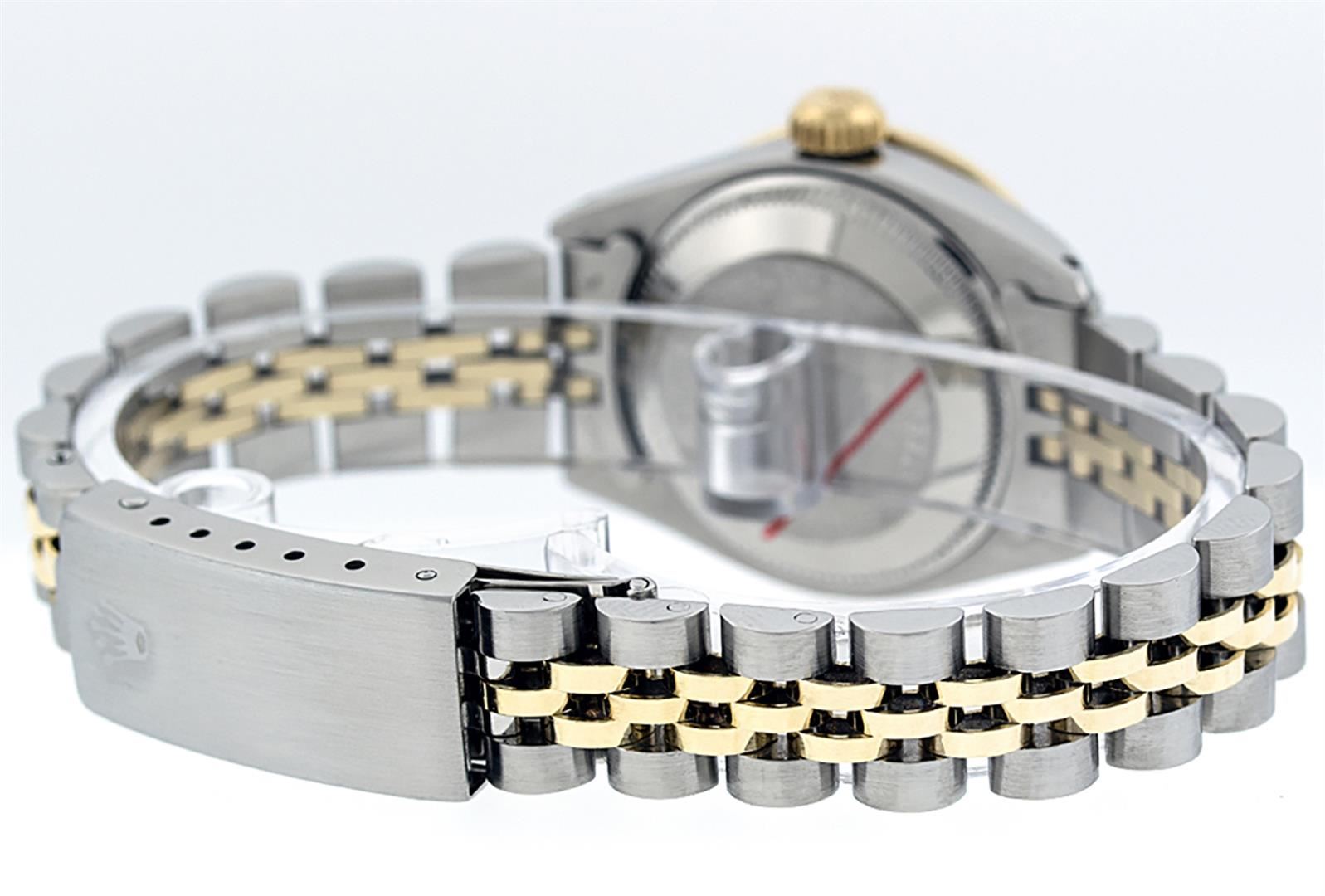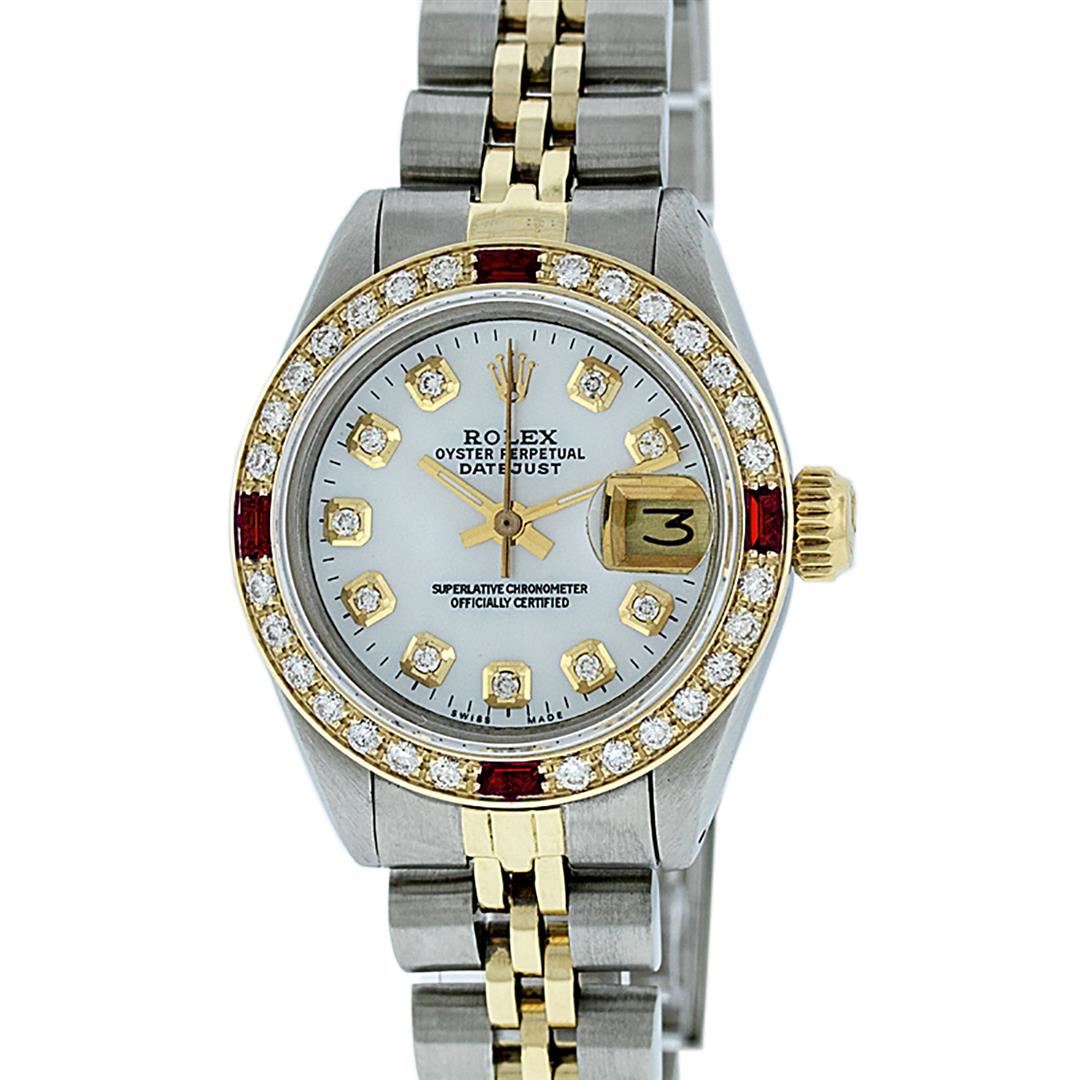 One Ladies Two Tone Yellow Gold Rolex Datejust Polished, Serviced & Electronically Tested, Yellow Gold & Stainless Steel Case: 26mm, Yellow Gold Crown, Custom Bezel: New 18K Yellow Gold Ruby Beadset Diamond Bezel, Diamond + Gem Count: 28 Diamonds + 4 Rubies Total Weight.70 Carat, Clarity: Si-VS, Color: G to H. Custom Crystal: New Scratch Resistant Synthetic Sapphire Cyclops Lens. Custom Hands: New Luminescent Hands. Movement: Automatic Winding Movement. Custom Dial: Mother Of Pearl Set With Diamond Hour Markers & Dash Track, Diamond Count: 10 Diamond in Dial, G To H In Color, SI-VS Clarity. Date Window: 3 O'Clock Position Date Display, Model: Datejust, Condition: G-6 Extra Fine. Bracelet: Two Tone Yellow Gold Yellow Gold & Stainless Steel Jubilee Band. Bright Polish. 6.0 Inch Length, Adjustable. Standard Clasp, With Rolex Logo. This Watch Has Been Serviced Time Tested And Is In Excellent Condition It Is Free Of All Scratches And Dents.