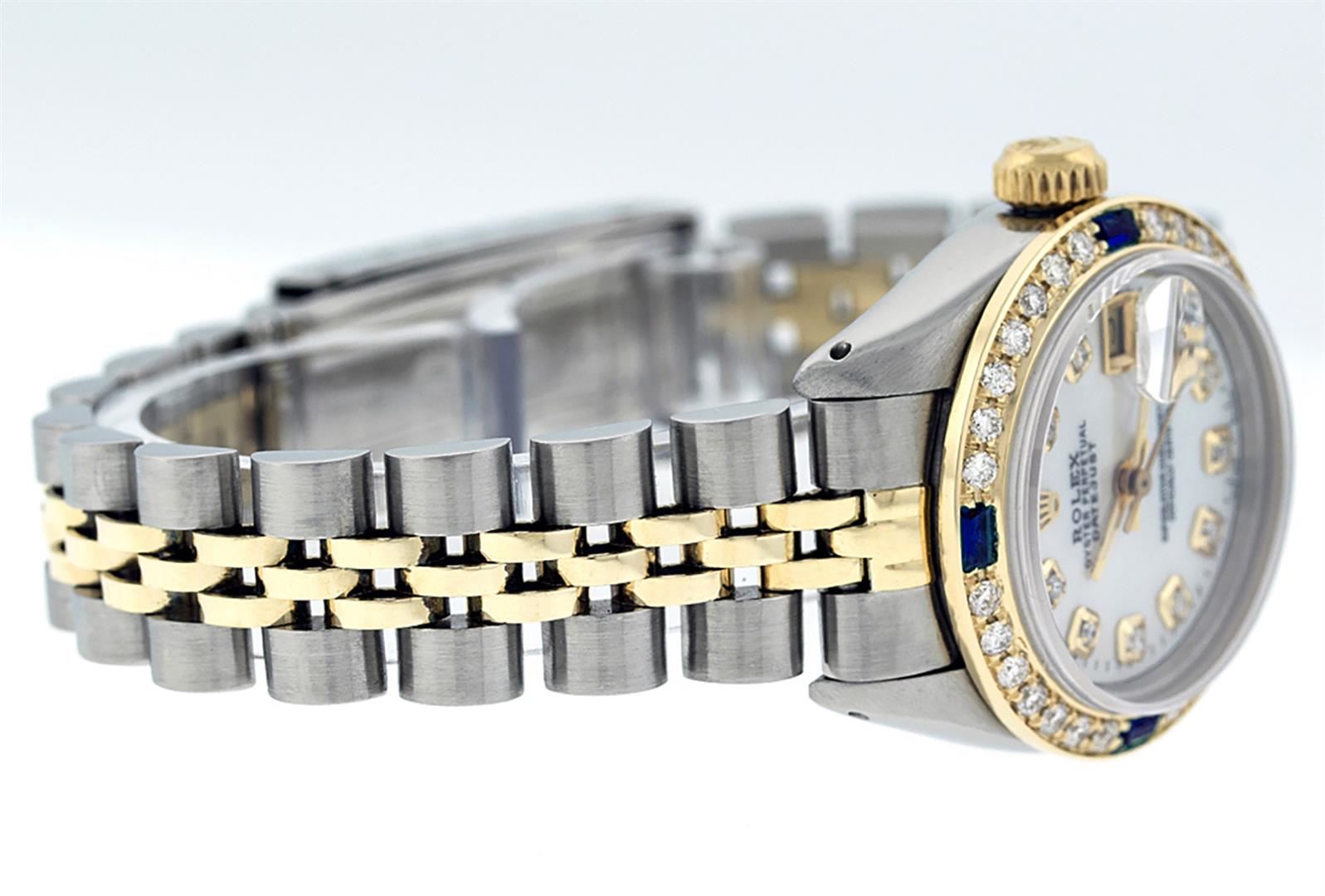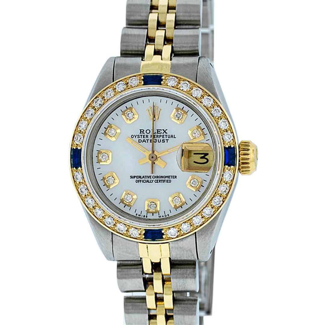 One Ladies Two Tone Yellow Gold Rolex Datejust Polished, Serviced & Electronically Tested, Yellow Gold & Stainless Steel Case: 26mm, Yellow Gold Crown, Custom Bezel: New 18K Yellow Gold Sapphire Beadset Diamond Bezel, Diamond + Gem Count: 28 Diamonds + 4 Sapphires Total Weight.70 Carat, Clarity: SI-VS, Color: G to H. Custom Crystal: New Synthetic Sapphire Cyclops Lens. Custom Hands: New Luminescent Hands. Movement: Automatic Winding Movement. Custom Dial: Mother Of Pearl Set With Diamond Hour Markers & Dash Track, Diamond Count: 10 Diamond in Dial, G To H In Color, SI-VS Clarity. Date Window: 3 O'Clock Position Date Display, Model: Datejust, Condition: G-6 Extra Fine. Bracelet: Two Tone Yellow Gold Yellow Gold & Stainless Steel Jubilee Band. Bright Polish. 6.0 Inch Length, Adjustable. Standard Clasp, With Rolex Logo. This Watch Has Been Serviced Time Tested And Is In Excellent Condition It Is Free Of All Scratches And Dents.