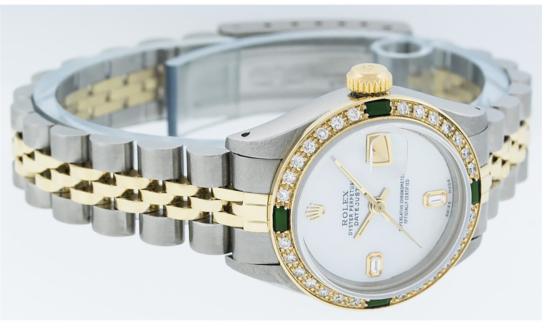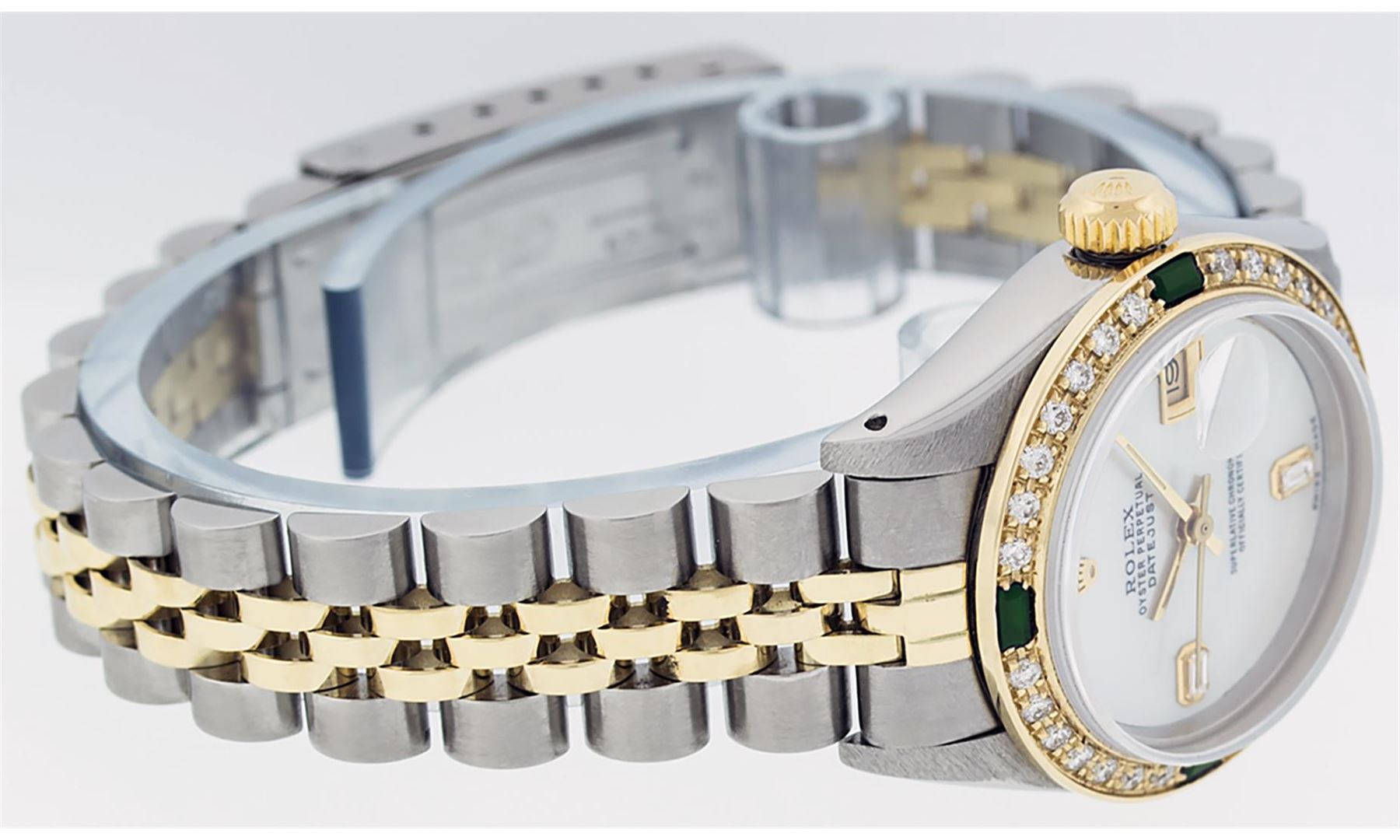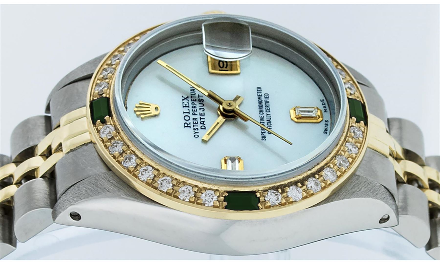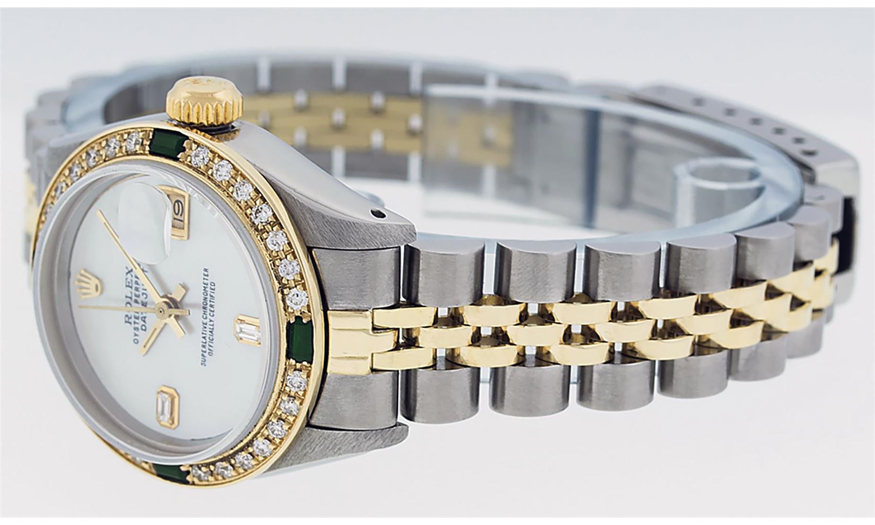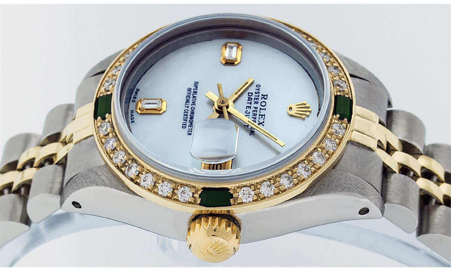 One Ladies Two Tone Yellow Gold Rolex Datejust Polished, Serviced & Electronically Tested, Yellow Gold & Stainless Steel Case: 26mm, Yellow Gold Crown, Custom Bezel: New 18K Yellow Gold Emerald Beadset Diamond Bezel, Diamond Count: 28 Diamonds + 4 Emeralds In Bezel. Total Bezel Weight.70 Carat, Clarity: SI-VS, Color: G to H. Custom Crystal: New Scratch Resistant Synthetic Sapphire Cyclops Lens. Custom Hands: New Luminescent Hands. Movement: Automatic Winding Movement. Custom Dial: Mother Of Pearl With Baguette Diamonds, STone Yellow Gold Count: 2 Baguettes. Date Window: 3 O'Clock Position Date Display, Model: Datejust. Condition: G-6 Extra Fine. Bracelet: Two Tone Yellow Gold Yellow Gold & Stainless Steel Jubilee Band. Bright Polish. 6.0 Inch Length, Adjustable. Standard Clasp, With Rolex Logo. This Watch Has Been Serviced Time Tested And Is In Excellent Condition It Is Free Of All Scratches And Dents.