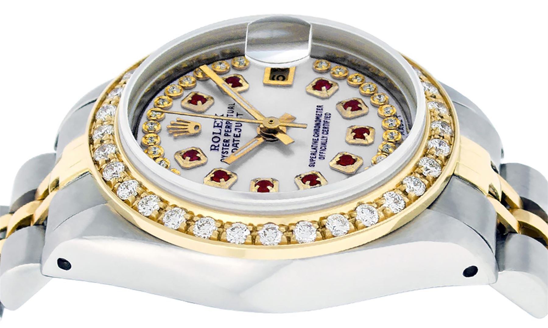One Ladies Two Tone Yellow Gold Rolex Datejust Polished, Serviced & Electronically Tested, Yellow Gold & Stainless Steel Case: 26mm, Yellow Gold Crown, Custom Bezel: New 18K Yellow Gold Beadset Diamond Bezel, Diamond Count: 32 Diamonds In Bezel, Total Weight.70 Carat, Clarity: SI-VS, Color: G to H. Custom Crystal: New Synthetic Sapphire Cyclops Lens. Custom Hands: New Luminescent Hands. Movement: Automatic Winding Movement. Custom Dial: Mother Of Pearl Ruby String Diamond Dial, STone Yellow Gold Count: 10 Rubies + 33 Diamonds In Dial. Clarity: SI-VS, Color: G to H. Date Window: 3 O'Clock Position Date Display, Model: Datejust. Condition: G-6 Extra Fine. Bracelet: Two Tone Yellow Gold Yellow Gold & Stainless Steel Jubilee. Bright Polish. 6.0 Inch Length, Adjustable. Standard Clasp, With Rolex Logo. This Watch Has Been Serviced Time Tested And Is In Excellent Condition It Is Free Of All Scratches And Dents.