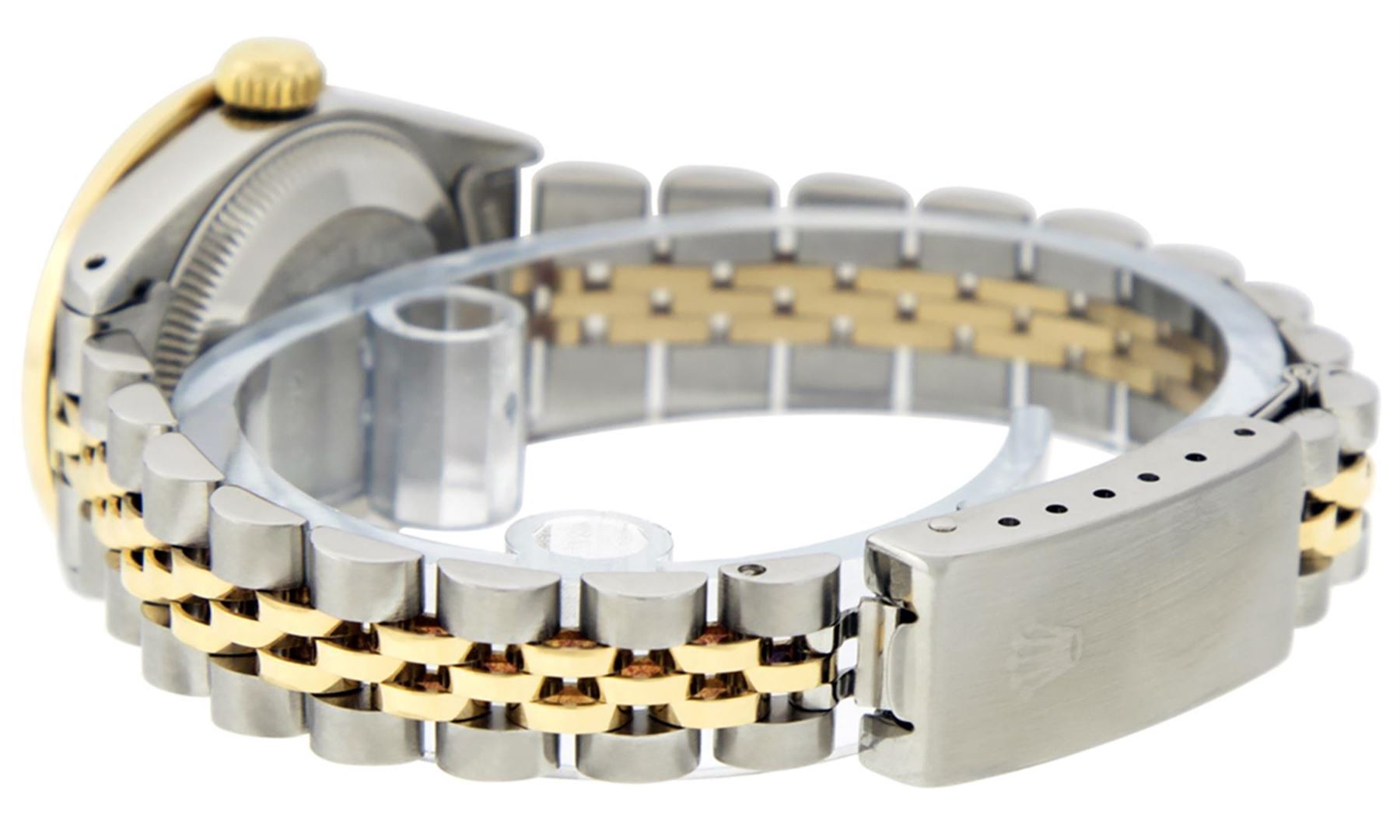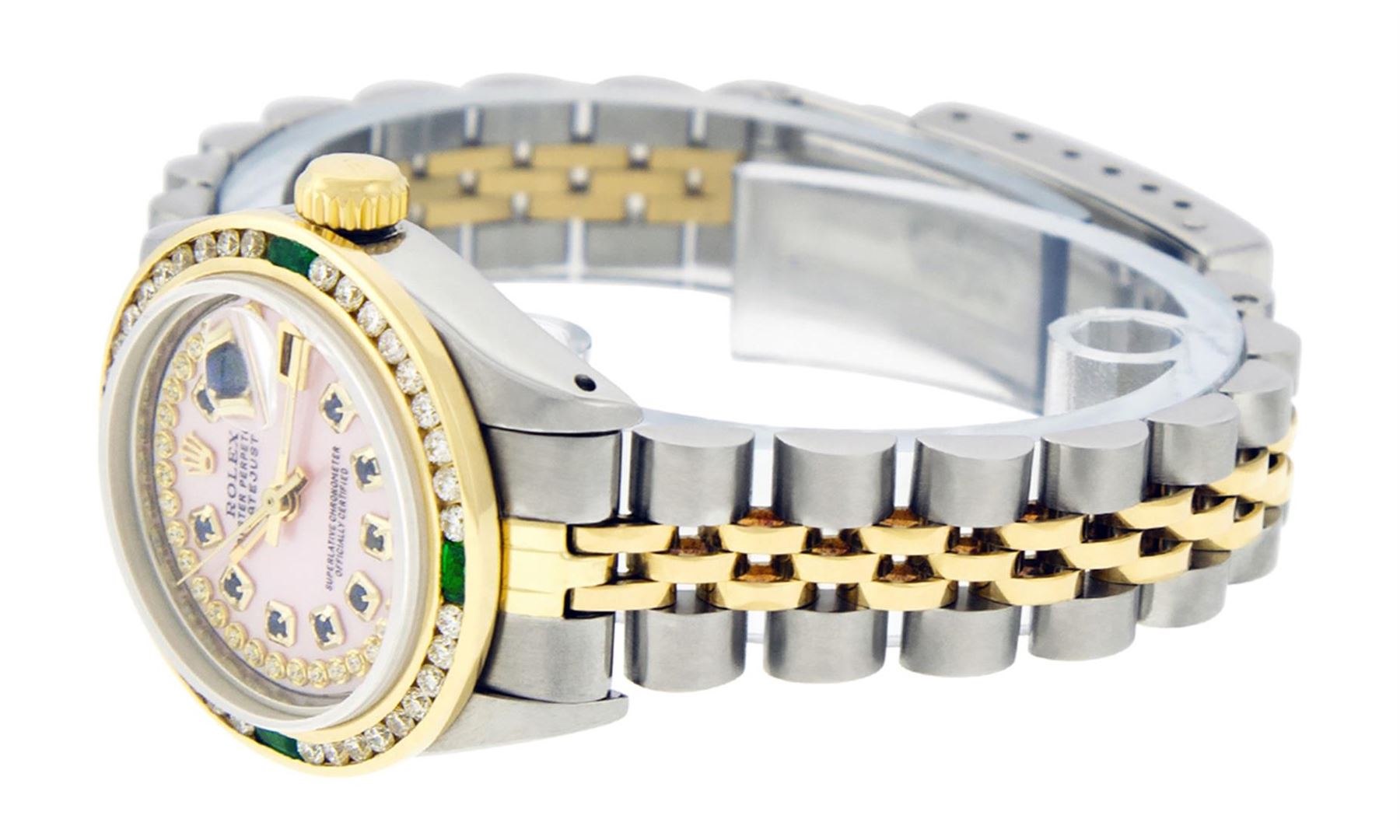 One Ladies Two Tone Yellow Gold Rolex Datejust Polished, Serviced & Electronically Tested, Yellow Gold & Stainless Steel Case: 26mm, Yellow Gold Crown, Custom Bezel: New 18K Yellow Gold Emerald Channel Set Diamond Bezel, Diamond + Gem Count: 36 Diamonds + 4 Synthetic Emeralds, Total Weight 1.00 Carat, Clarity: SI-VS, Color: G to H. Custom Crystal: New Synthetic Sapphire Cyclops Lens. Custom Hands: New Luminescent Hands. Movement: Automatic Winding Movement. Custom Dial: Pink Mother Of Pearl with Sapphire Diamond Hour Markers, STone Yellow Gold Count: 10 Sapphires + 33 Diamonds In Dial. Date Window: 3 O'Clock Position Date Display, Model: Datejust, Condition: G-6 Extra Fine. Bracelet: Two Tone Yellow Gold Yellow Gold & Stainless Steel Jubilee. Bright Polish. 6.0 Inch Length, Adjustable. Standard Clasp, With Rolex Logo. This Watch Has Been Serviced Time Tested And Is In Excellent Condition It Is Free Of All Scratches And Dents.