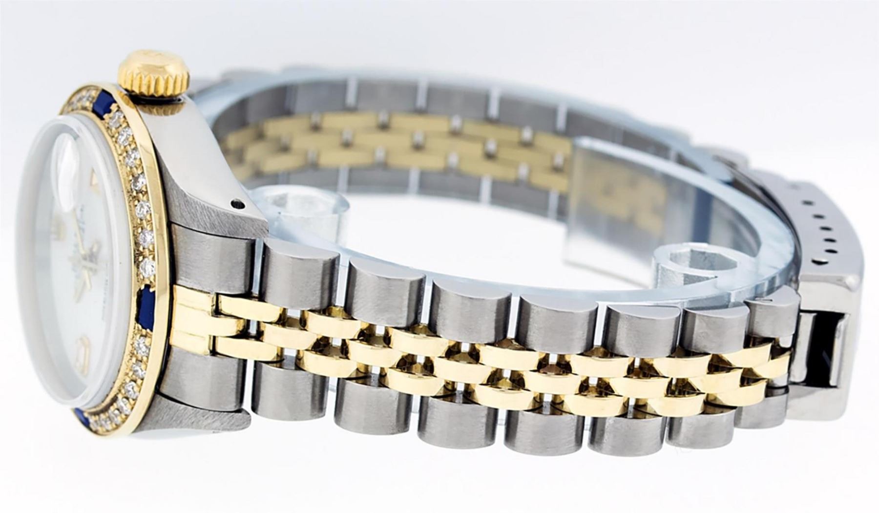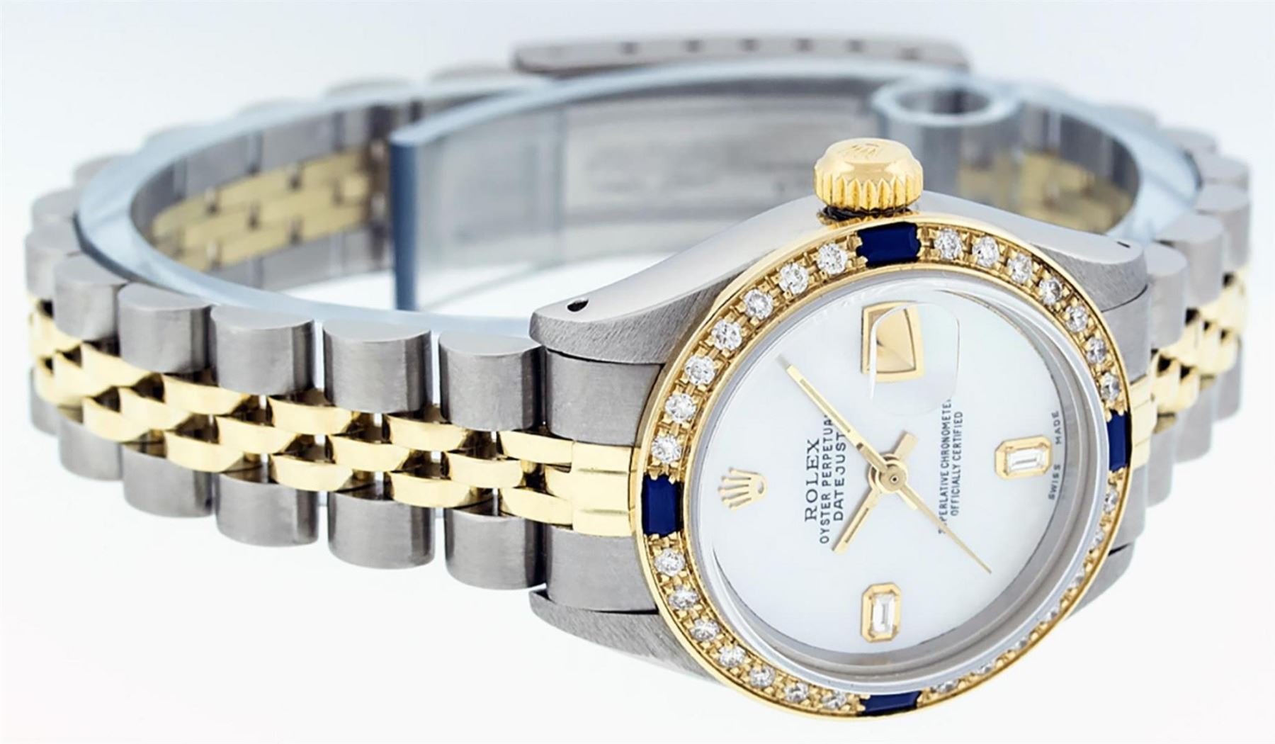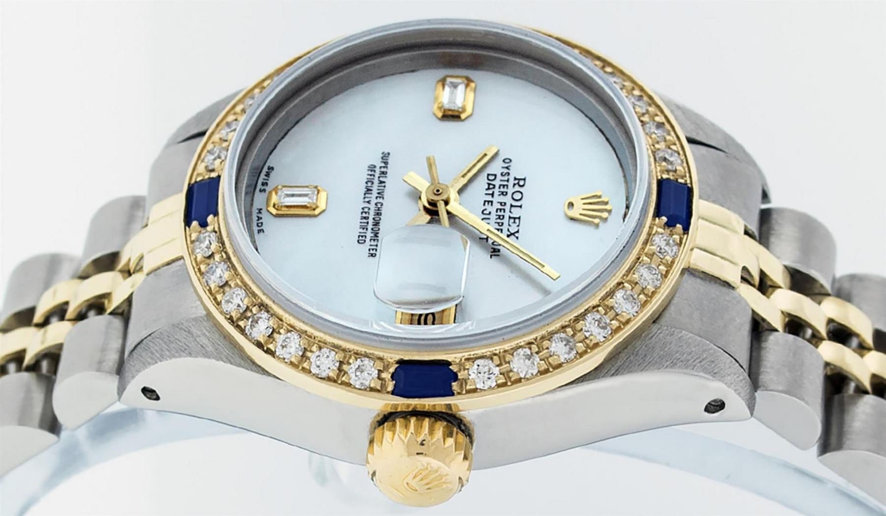 One Ladies Two Tone Yellow Gold Rolex Datejust Polished, Serviced & Electronically Tested, Yellow Gold & Stainless Steel Case: 26mm, Yellow Gold Crown, Custom Bezel: New 18K Yellow Gold Sapphire Beadset Diamond Bezel, Diamond Count: 28 Diamonds + 4 Sapphires In Bezel. Total Weight.70 Carat, Clarity: SI-VS, Color: G to H. Custom Crystal: New Scratch Resistant Synthetic Sapphire Cyclops Lens. Custom Hands: New Luminescent Hands. Movement: Automatic Winding Movement. Custom Dial: Mother Of Pearl With Baguette Diamonds, STone Yellow Gold Count: 2 Baguettes. Date Window: 3 O'Clock Position Date Display, Model: Datejust. Condition: G-6 Extra Fine. Bracelet: Two Tone Yellow Gold Yellow Gold & Stainless Steel Jubilee Band. Bright Polish. 6.0 Inch Length, Adjustable. Standard Clasp, With Rolex Logo. This Watch Has Been Serviced Time Tested And Is In Excellent Condition It Is Free Of All Scratches And Dents.