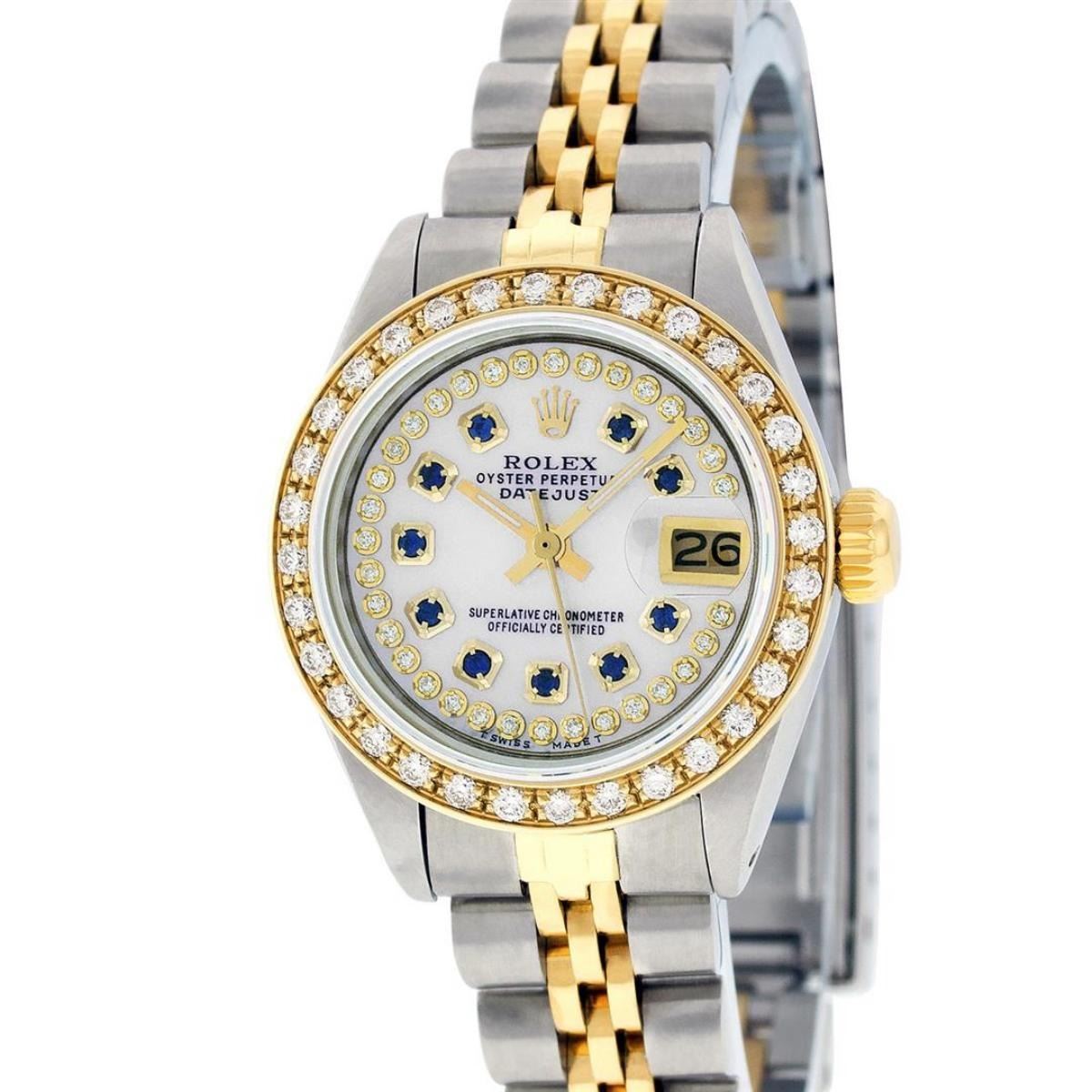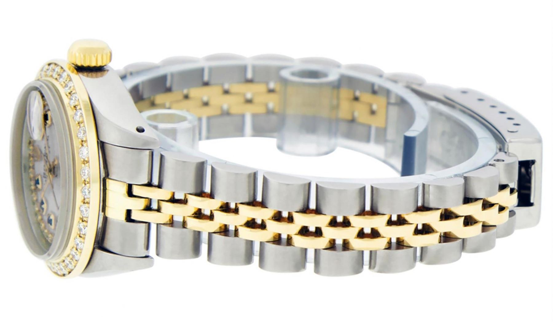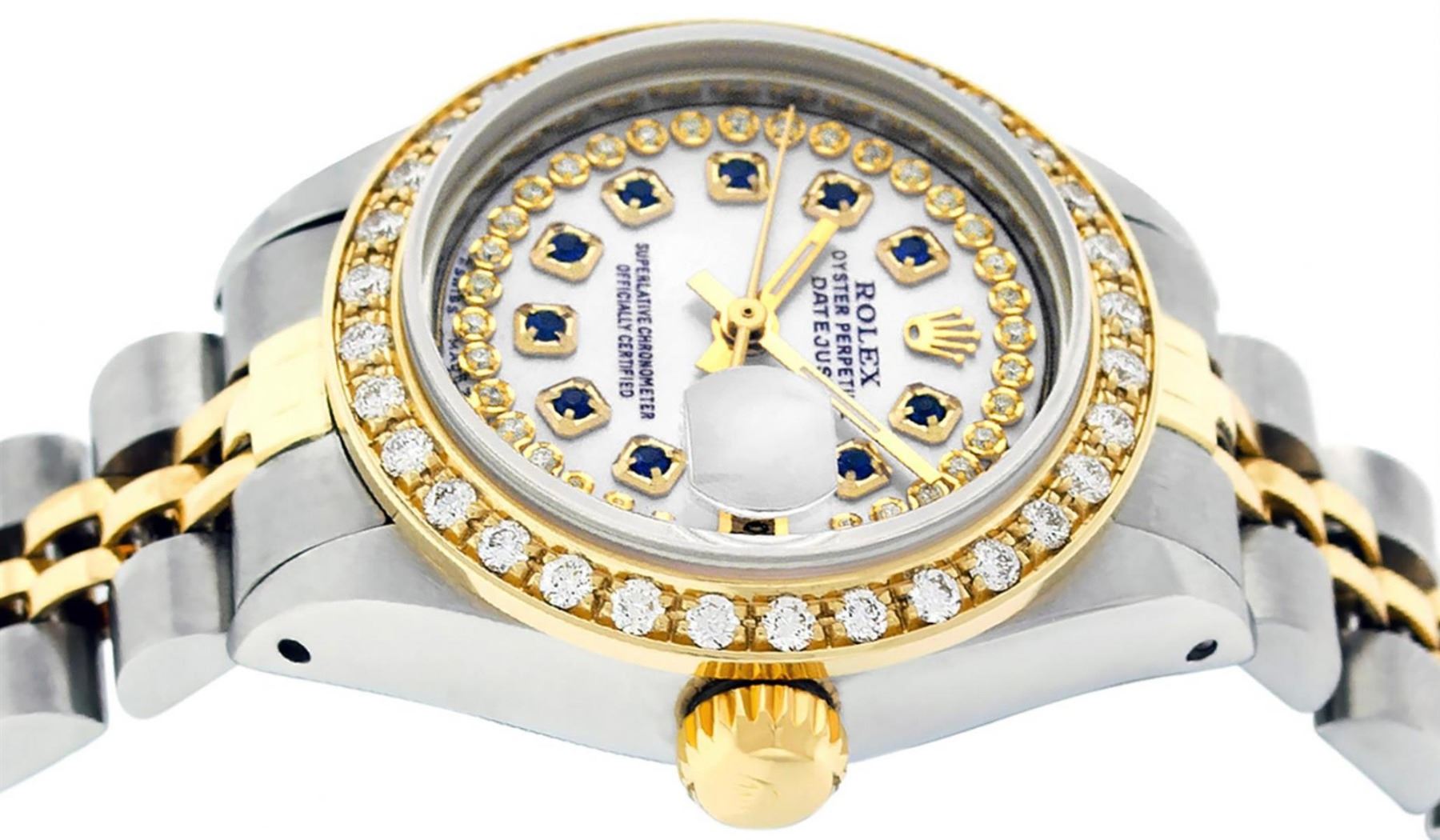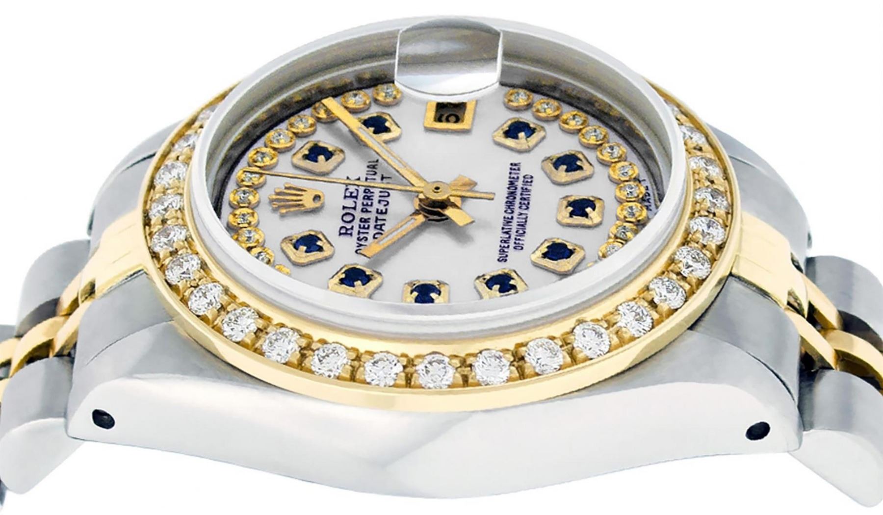 One Ladies Two Tone Yellow Gold Rolex Datejust Polished, Serviced & Electronically Tested, Yellow Gold & Stainless Steel Case: 26mm, Yellow Gold Crown, Custom Bezel: New 18K Yellow Gold Beadset Diamond Bezel, Diamond Count: 32 Diamonds In Bezel, Total Weight.70 Carat, Clarity: SI-VS, Color: G to H. Custom Crystal: New Synthetic Sapphire Cyclops Lens. Custom Hands: New Luminescent Hands. Movement: Automatic Winding Movement. Custom Dial: Mother Of Pearl Sapphire String Diamond Dial, STone Yellow Gold Count: 10 Sapphires + 33 Diamonds In Dial. Clarity: SI-VS, Color: G to H. Date Window: 3 O'Clock Position Date Display, Model: Datejust. Condition: G-6 Extra Fine. Bracelet: Two Tone Yellow Gold Yellow Gold & Stainless Steel Jubilee. Bright Polish. 6.0 Inch Length, Adjustable. Standard Clasp, With Rolex Logo. This Watch Has Been Serviced Time Tested And Is In Excellent Condition It Is Free Of All Scratches And Dents.