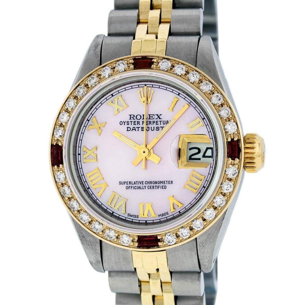 One Ladies Two Tone Yellow Gold Rolex Datejust Polished, Serviced & Electronically Tested, Yellow Gold & Stainless Steel Case: 26mm, Yellow Gold Crown, Custom Bezel: New 18K Yellow Gold Ruby Beadset Diamond Bezel, Diamond + Gem Count: 28 Diamonds + 4 Rubies Total Weight.70 Carat, Clarity: SI-VS, Color: G to H. Custom Crystal: New Synthetic Sapphire Cyclops Lens. Custom Hands: New Luminescent Hands. Movement: Automatic Winding Movement. Custom Dial: Pink Mother Of Pearl Roman Dial With Square Track. Date Window: 3 O'Clock Position Date Display, Model: Datejust, Condition: G-6 Extra Fine. Bracelet: Two Tone Yellow Gold Yellow Gold & Stainless Steel Jubilee. Bright Polish. 6.0 Inch Length, Adjustable. Standard Clasp, With Rolex Logo. This Watch Has Been Serviced Time Tested And Is In Excellent Condition It Is Free Of All Scratches And Dents.