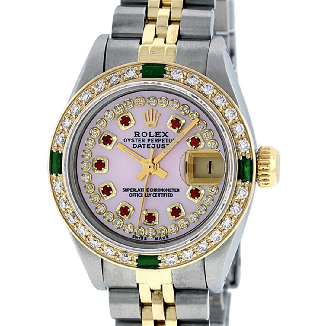One Ladies Two Tone Yellow Gold Rolex Datejust Polished, Serviced & Electronically Tested, Yellow Gold & Stainless Steel Case: 26mm, Yellow Gold Crown, Custom Bezel: New 18K New Yellow Gold Beadset + Emerald Diamond Bezel, STone Yellow Gold Count: 28 Diamonds + 4 Emeralds On Bezel, Total Weight.70 Carat, Clarity: SI-VS, Color: G to H. Custom Crystal: New Scratch Resistant Synthetic Sapphire Cyclops Lens. Custom Hands: New Luminescent Hands. Movement: Automatic Winding Movement. Custom Dial: Pink Mother Of Pearl Ruby String, Diamond Count: 10 Rubies + 33 Diamonds In Dial, Clarity: SI-VS, Color: G to H. Date Window: 3 O'Clock Position Date Display, Model: Datejust. Condition: G-6 Extra Fine. Bracelet: Two Tone Yellow Gold Yellow Gold & Stainless Steel Jubilee Band. Bright Polish. 6.0 Inch Length, Adjustable. Standard Clasp, With Rolex Logo. This Watch Has Been Serviced Time Tested And Is In Excellent Condition It Is Free Of All Scratches And Dents.