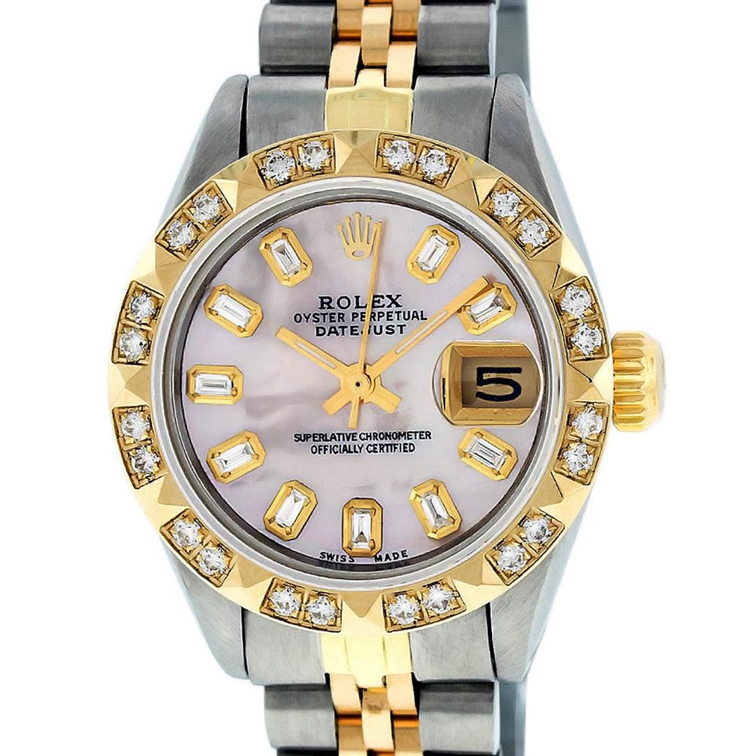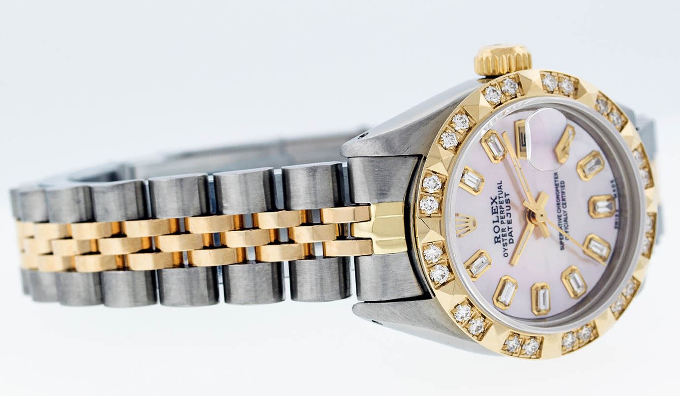 One Ladies 14 Two Tone Yellow Gold Rolex Datejust Polished, Serviced & Electronically Tested, Yellow Gold & Stainless Steel Case: 26mm, Yellow Gold Crown, Custom Bezel: 18K Yellow Gold Pyramid Diamond Bezel, Diamond Count: 24 Diamonds Total Weight.50 Carat, Clarity: Si-VS, Color: G to H. Custom Crystal: Synthetic Sapphire Cyclops Lens. Custom Hands: New Luminescent Hands. Movement: Automatic Winding Movement. Custom Dial: Pink Mother Of Pearl Baguette Diamond Hour Markers. 10 Baguette Diamonds In Dial, Clarity: SI-VS, Color: G to H. Date Window: 3 O'Clock Position Date Display, Model: Datejust. Condition: G-6 Extra Fine. Bracelet: Two Tone Yellow Gold Yellow Gold & Stainless Steel Jubilee. Bright Polish. 6.0 Inch Length, Adjustable. Standard Clasp, With Rolex Logo. This Watch Has Been Serviced Time Tested And Is In Excellent Condition It Is Free Of All Scratches And Dents.