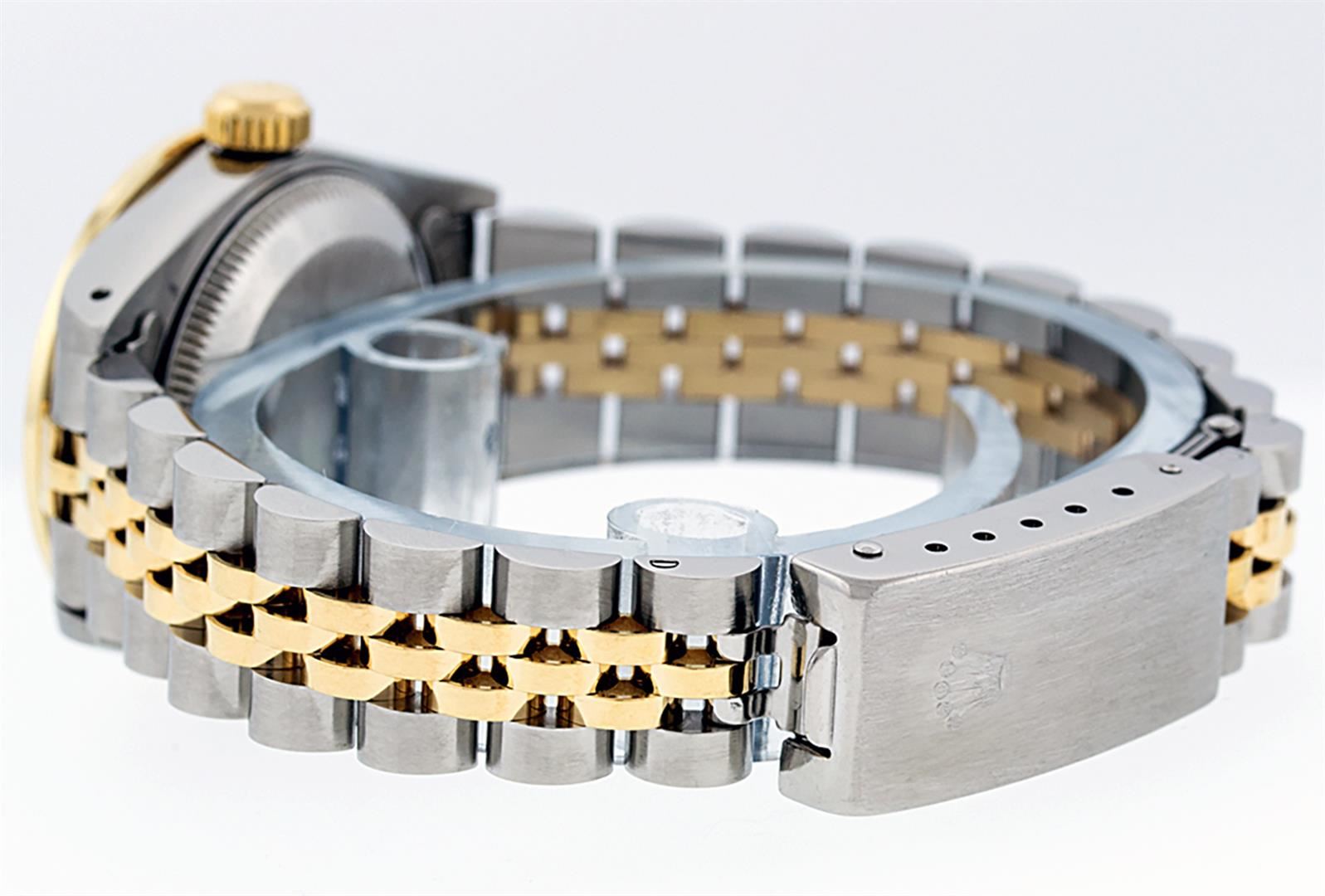 One Ladies Two Tone Yellow Gold Rolex Datejust Polished, Serviced & Electronically Tested, Yellow Gold & Stainless Steel Case: 26mm, Yellow Gold Crown, Custom Bezel: New 18K 1ctw Yellow Gold Beadset Diamond Bezel, Diamond Count: 42 Diamonds, Total Weight 1.00 Carat, Clarity: SI-VS, Color: G to H. Custom Crystal: New Synthetic Sapphire Cyclops Lens. Custom Hands: New Luminescent Hands. Movement: Automatic Winding Movement. Custom Dial: Red Vignette VS Diamond Dial, Diamond Count: 10 Single Cut Diamonds in Dial, G To H In Color, VS Clarity. Date Window: 3 O'Clock Position Date Display, Model: Datejust, Condition: G-6 Extra Fine. Bracelet: Two Tone Yellow Gold Yellow Gold & Stainless Steel Jubilee Band. Bright Polish. 6.0 Inch Length, Adjustable. Standard Clasp, With Rolex Logo. This Watch Has Been Serviced Time Tested And Is In Excellent Condition It Is Free Of All Scratches And Dents.