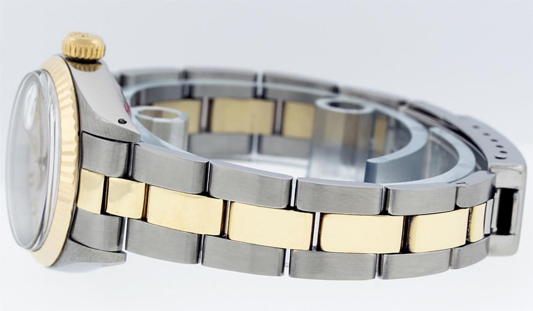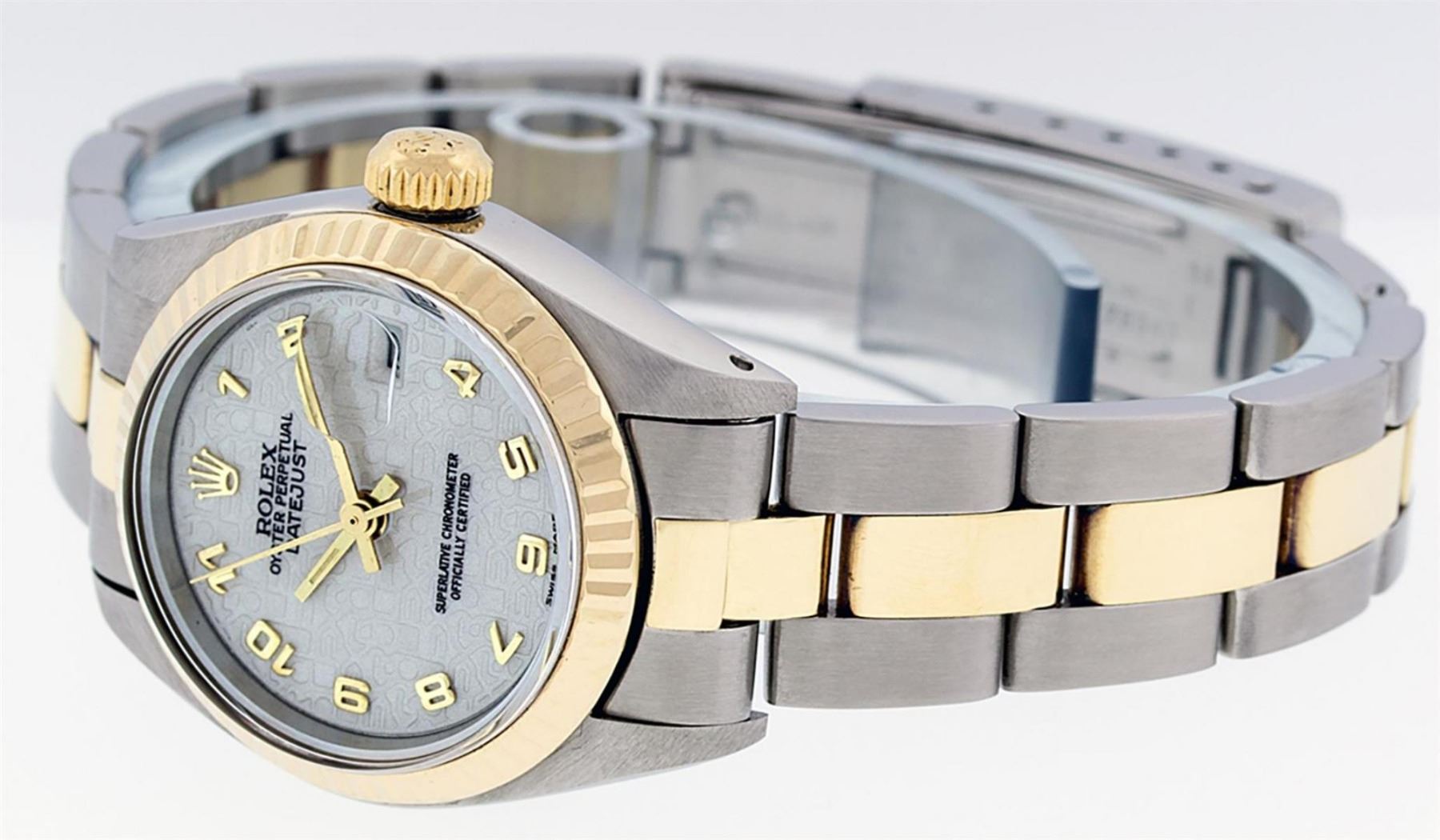 One Ladies Yellow Gold & Stainless Steel Two Tone Rolex Datejust Polished, Serviced & Electronically Tested, Yellow Gold & Stainless Steel Case: 26mm, Yellow Gold Crown, Bezel: Yellow Gold Fluted Bezel. Custom Crystal: New Acrylic Cyclops Lens. Hands: Luminescent Hands. Movement: Automatic Winding Movement. Dial: Cream Jubilee With Arabic Hour Markers. Date Window: 3 O'Clock Position Date Display, Model: Datejust. Condition: G-6 Extra Fine. Bracelet: Two Tone Yellow Gold & Stainless Steel Oyster Band. Bright Polish. 6.0 Inch Length, Adjustable. Standard Clasp, With Rolex Logo. This Watch Has Been Serviced Time Tested And Is In Excellent Condition It Is Free Of All Scratches And Dents.