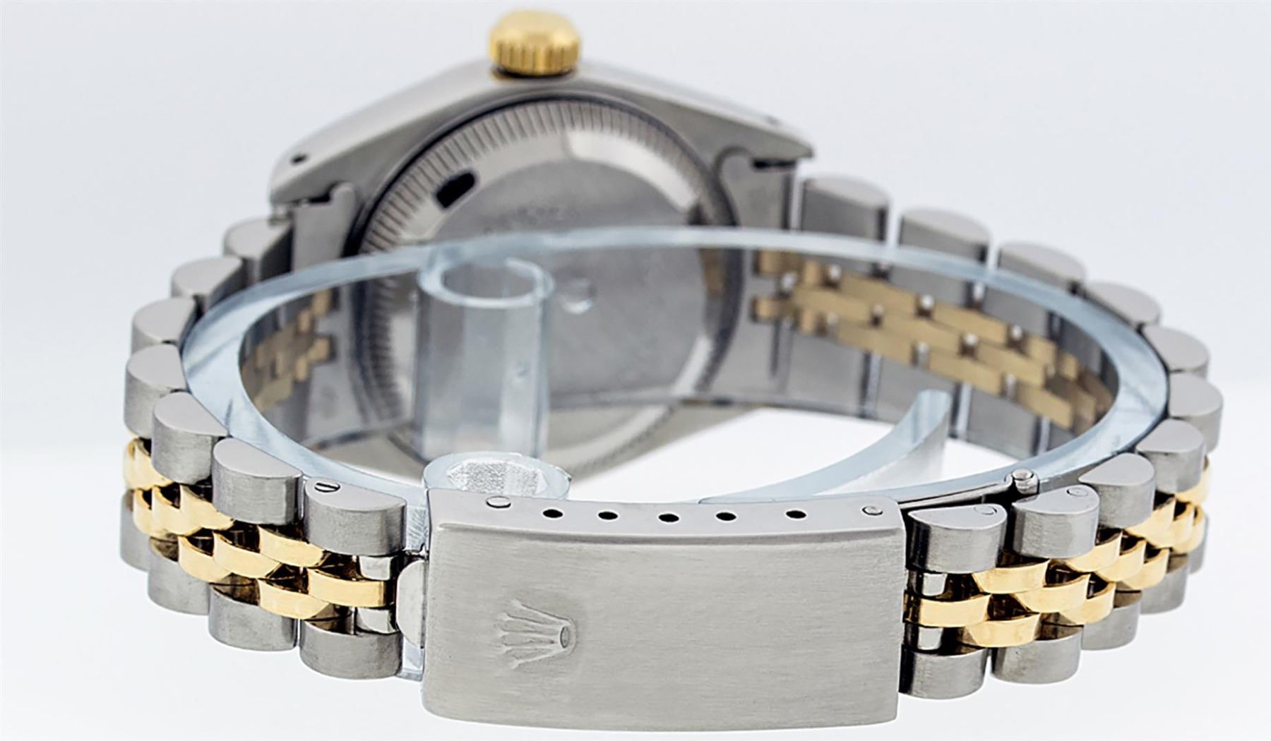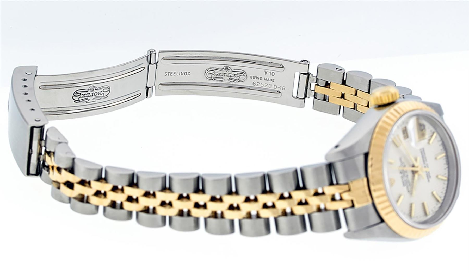 One Ladies Pre Owned Two Tone 14K Yellow Gold & Stainless Steel Rolex Polished, Serviced & Electronically Tested, 14 Yellow Gold & Stainless Steel Case: 26mm, Yellow Gold Crown, Bezel: 14K Yellow Gold Fluted Bezel. Crystal: Plastic With Magnified Date Window. Hands: Luminescent Hands. Rolex Movement: Automatic Winding Movement 2030. Rolex Dial: Silver Index Tapestry With Dash Track & Lumi Dots. Date Window: 3 O'Clock Position Date Display, Model: Datejust. Condition: G-6 Extra Fine. Rolex Bracelet: Two Tone 14K Yellow Gold & Stainless Steel Jubilee Band. Bright Polish. 6.0 Inch Length, Adjustable. Standard Clasp, With Rolex Logo. This Watch Has Been Serviced Time Tested And Is In Excellent Condition It Is Free Of All Scratches And Dents.