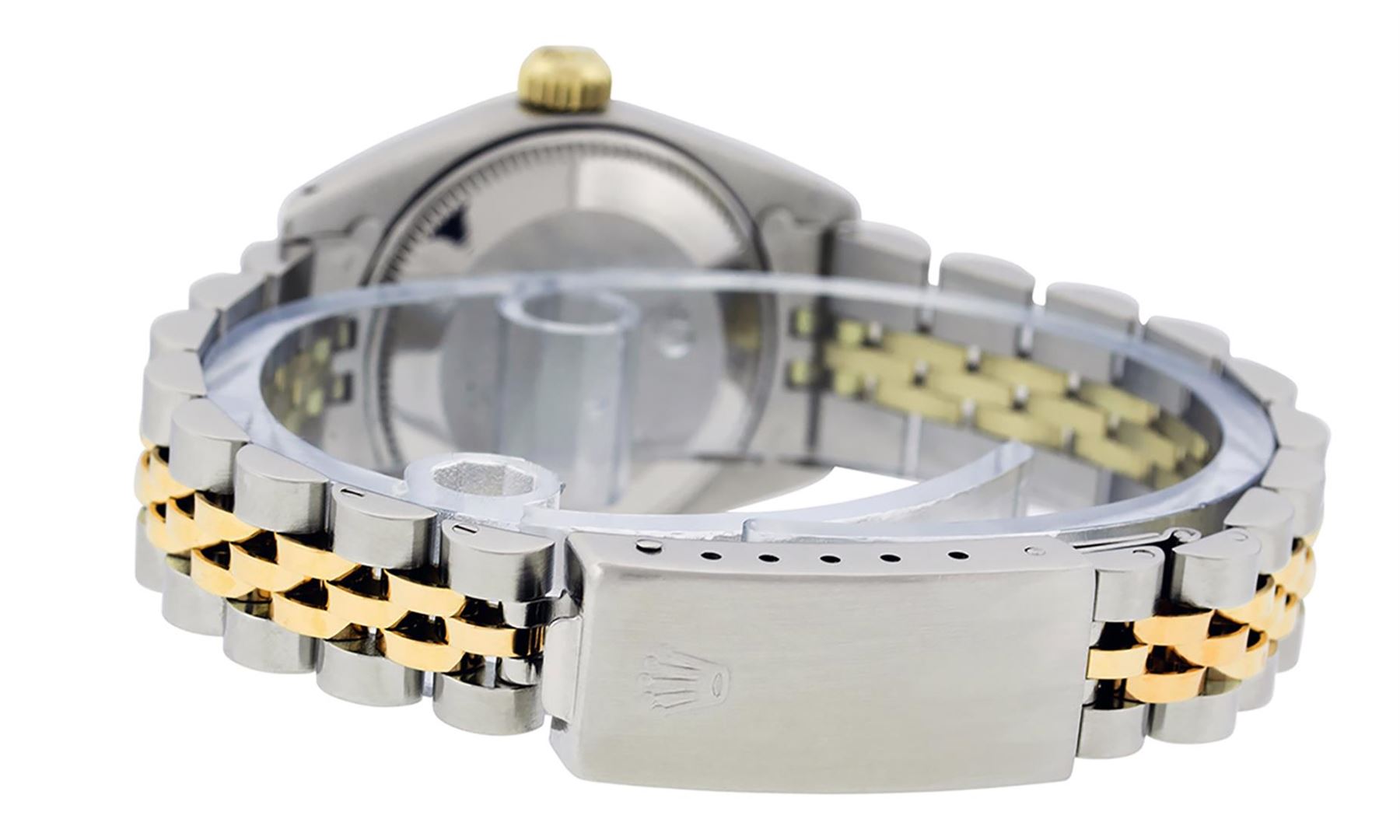 One Ladies Pre Owned Two Tone 14K Yellow Gold & Stainless Steel Rolex Polished, Serviced & Electronically Tested, Rolex 14K Yellow Gold & Stainless Steel, Rolex Case Size: 26mm, Rolex Yellow Gold Crown, Rolex Bezel: 14K Yellow Gold Fluted Bezel. Custom Crystal: New Plastic With Magnified Date Window. Hands: Luminescent Hands. Rolex Movement: Automatic Winding Movement 2030. Rolex Dial: Slate Grey Roman Dial With Square Track. Date Window: 3 O'Clock Position Date Display, Model: Date. Condition: G-6 Extra Fine. Rolex Bracelet: Two Tone 14K Yellow Gold & Stainless Steel Jubilee Band. Bright Polish. 6.0 Inch Length, Adjustable. Standard Clasp, With Rolex Logo. This Watch Has Been Serviced Time Tested And Is In Excellent Condition It Is Free Of All Scratches And Dents.