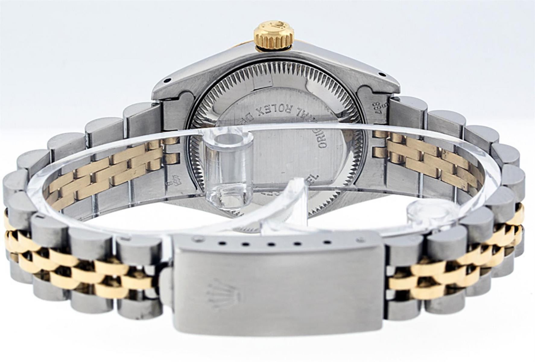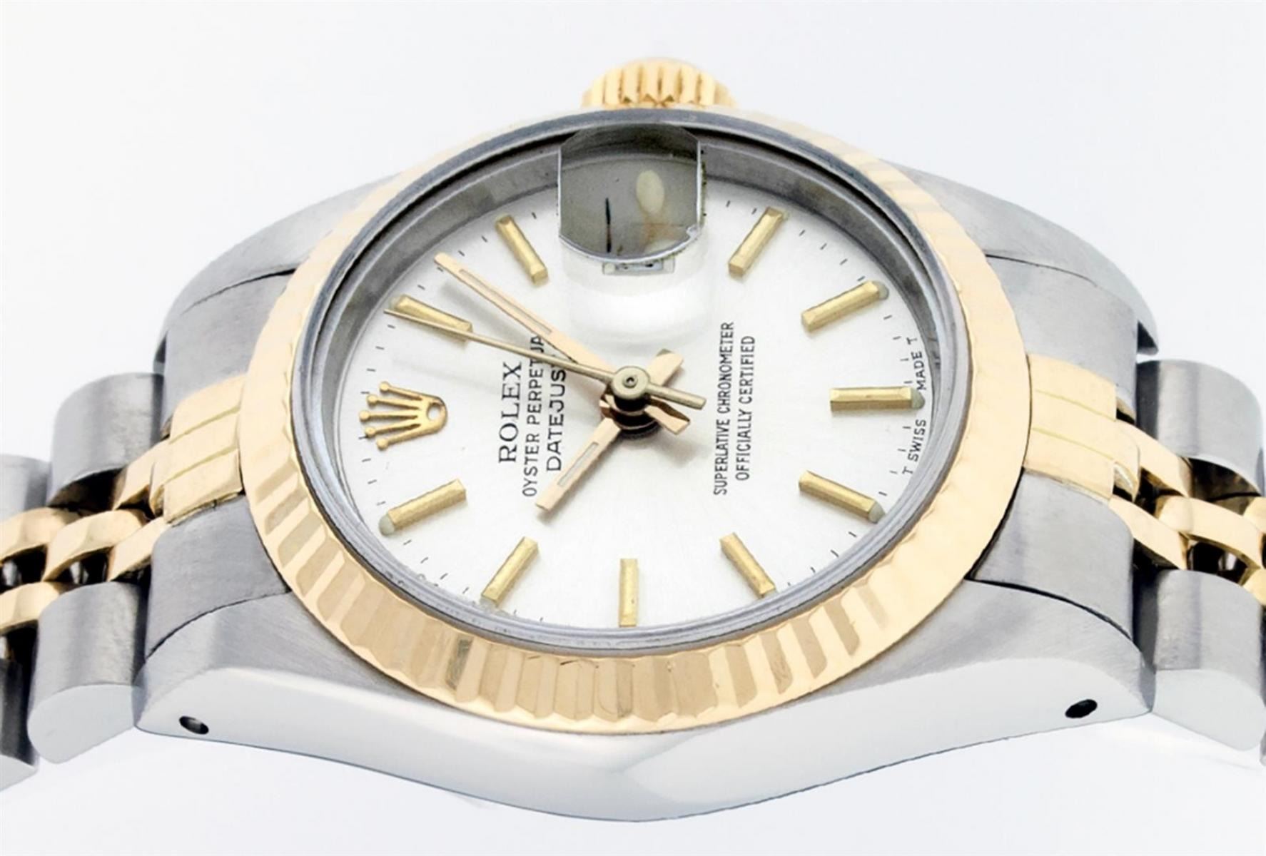 One Ladies Two Tone Yellow Gold Rolex Datejust Polished, Serviced & Electronically Tested, Yellow Gold & Stainless Steel Case: 26mm, Yellow Gold Crown, Bezel: Yellow Gold Fluted Bezel. Custom Crystal: New Acrylic Cyclops Lens. Custom Hands: New Luminescent Hands. Movement: Automatic Winding Movement. Custom Dial: White Index With Dash Track & Lumi Dots. Date Window: 3 O'Clock Position Date Display, Model: Datejust. Condition: G-6 Extra Fine. Bracelet: Two Tone Yellow Gold Yellow Gold & Stainless Steel Jubilee Band. Bright Polish. 6.0 Inch Length, Adjustable. Standard Clasp, With Rolex Logo. This Watch Has Been Serviced Time Tested And Is In Excellent Condition It Is Free Of All Scratches And Dents.