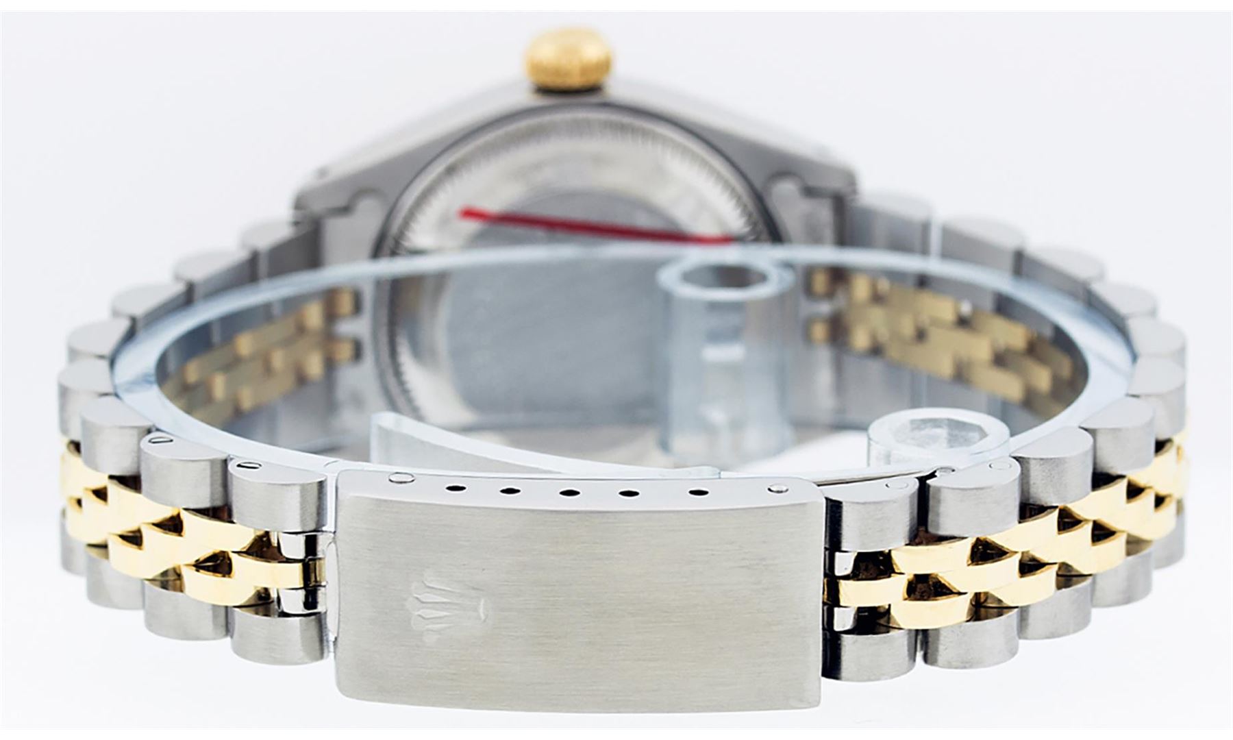 One Ladies Two Tone Yellow Gold Rolex Datejust Polished, Serviced & Electronically Tested, Yellow Gold & Stainless Steel Case: 26mm, Yellow Gold Crown, Bezel: Yellow Gold Fluted Bezel. Custom Crystal: New Acrylic Cyclops Lens. Custom Hands: New Luminescent Hands. Movement: Automatic Winding Movement. Dial: Champagne Index With Roman Track & Lumi Dots. Date Window: 3 O'Clock Position Date Display, Model: Datejust. Condition: G-6 Extra Fine. Bracelet: Two Tone Yellow Gold Yellow Gold & Stainless Steel Jubilee Band. Bright Polish. 6.0 Inch Length, Adjustable. Standard Clasp, With Rolex Logo. This Watch Has Been Serviced Time Tested And Is In Excellent Condition It Is Free Of All Scratches And Dents.