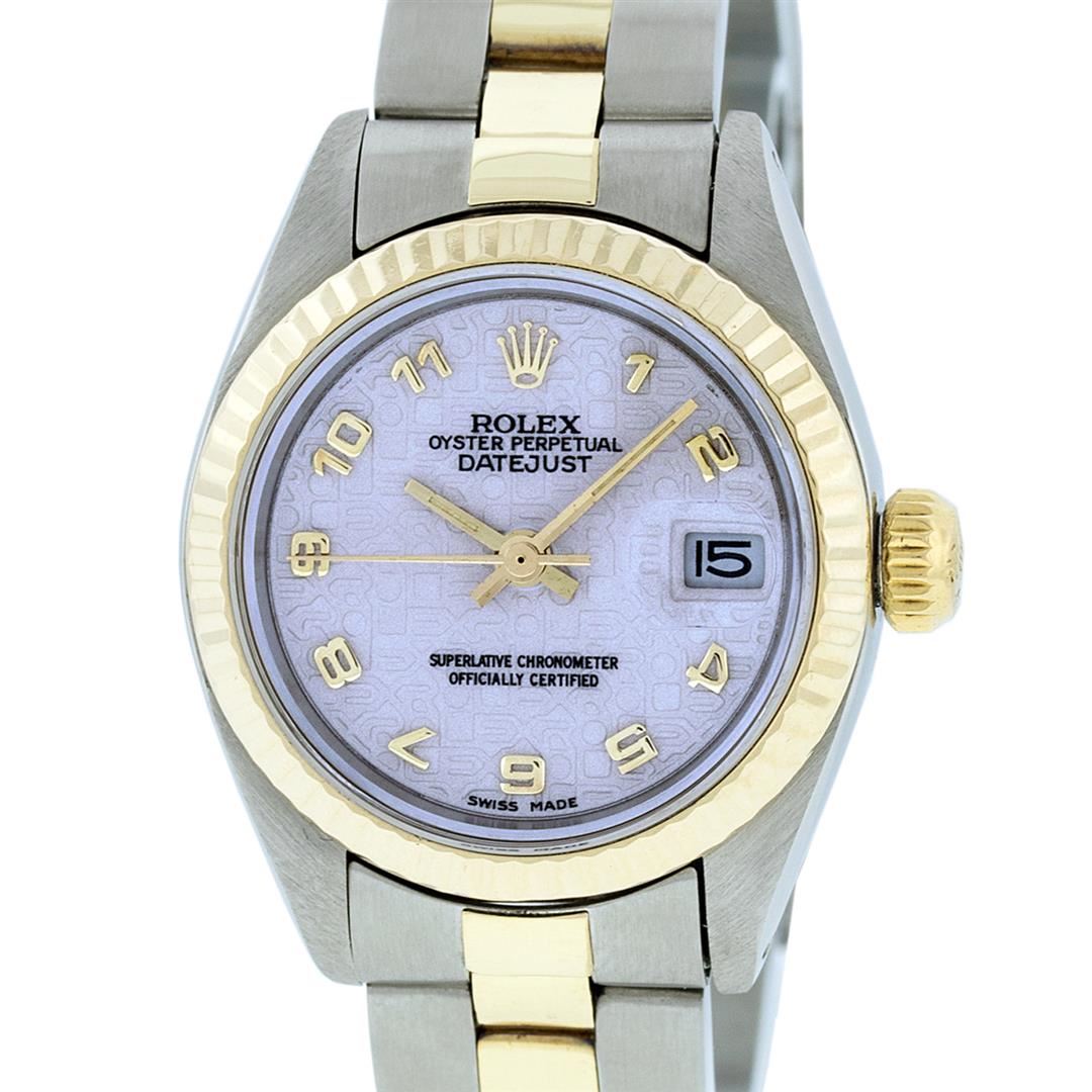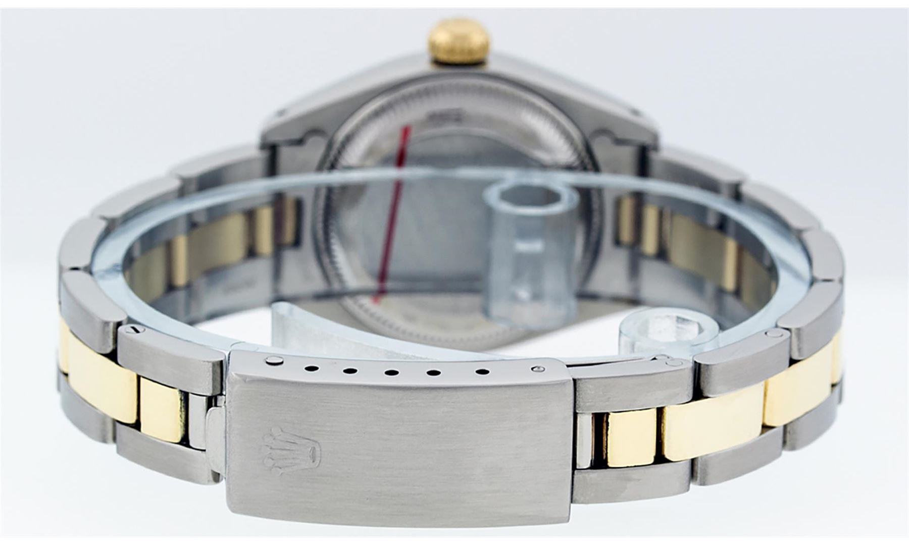 One Ladies Yellow Gold & Stainless Steel Two Tone Yellow Gold Rolex Datejust Polished, Serviced & Electronically Tested, Yellow Gold & Stainless Steel Case: 26mm, Yellow Gold Crown, Bezel: Yellow Gold Fluted Bezel. Custom Crystal: New Acrylic Cyclops Lens. Custom Hands: New Luminescent Hands. Movement: Automatic Winding Movement. Dial: Cream Jubilee With Arabic Hour Markers. Date Window: 3 O'Clock Position Date Display, Model: Datejust. Condition: G-6 Extra Fine. Bracelet: Two Tone Yellow Gold Yellow Gold & Stainless Steel Oyster Band. Bright Polish. 6.0 Inch Length, Adjustable. Standard Clasp, With Rolex Logo. This Watch Has Been Serviced Time Tested And Is In Excellent Condition It Is Free Of All Scratches And Dents.
