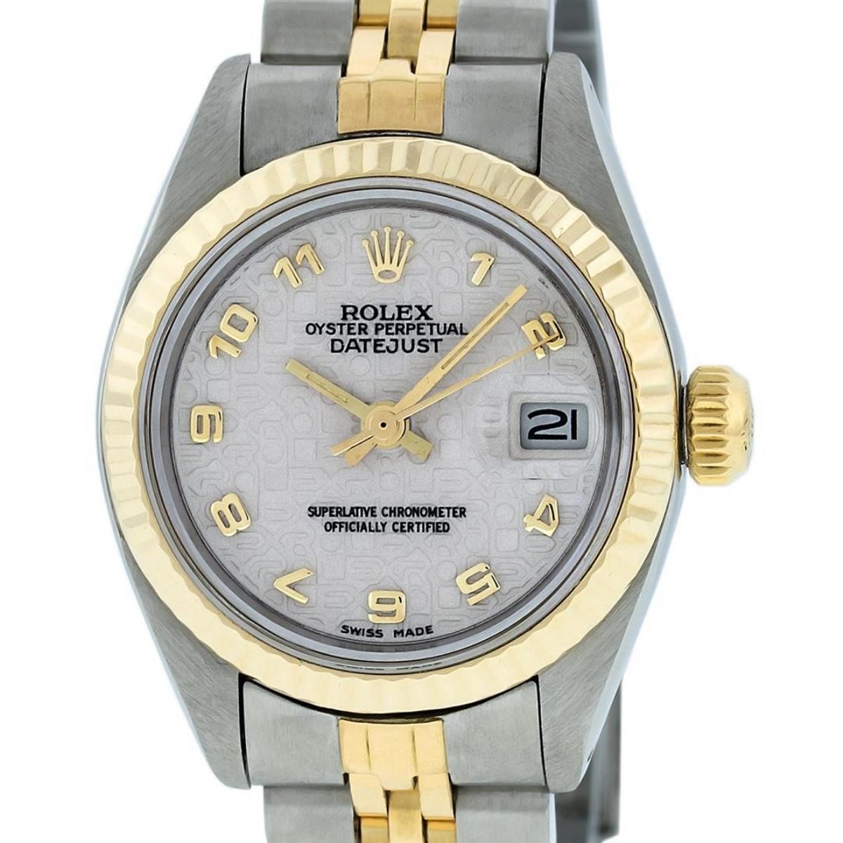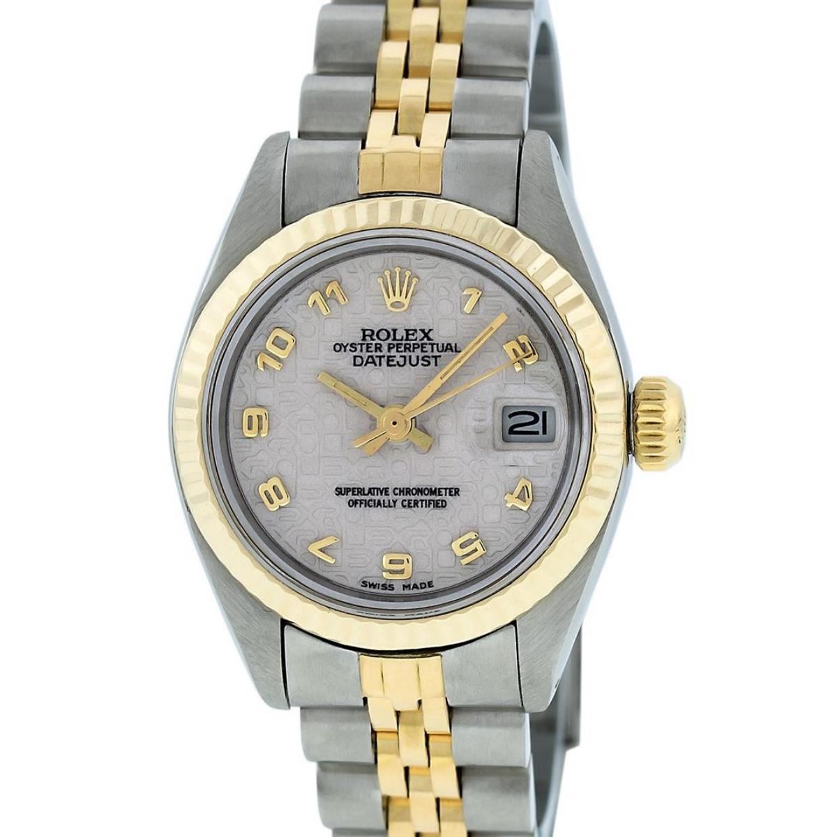 One Ladies Yellow Gold & Stainless Steel Two Tone Yellow Gold Rolex Datejust Polished, Serviced & Electronically Tested, Yellow Gold & Stainless Steel Case: 26mm, Yellow Gold Crown, Bezel: Yellow Gold Fluted Bezel. Custom Crystal: New Acrylic Cyclops Lens. Custom Hands: New Luminescent Hands. Movement: Automatic Winding Movement. Dial: Cream Jubilee With Arabic Hour Markers. Date Window: 3 O'Clock Position Date Display, Model: Datejust. Condition: G-6 Extra Fine. Bracelet: Two Tone Yellow Gold Yellow Gold & Stainless Steel Jubilee Band. Bright Polish. 6.0 Inch Length, Adjustable. Standard Clasp, With Rolex Logo. This Watch Has Been Serviced Time Tested And Is In Excellent Condition It Is Free Of All Scratches And Dents.