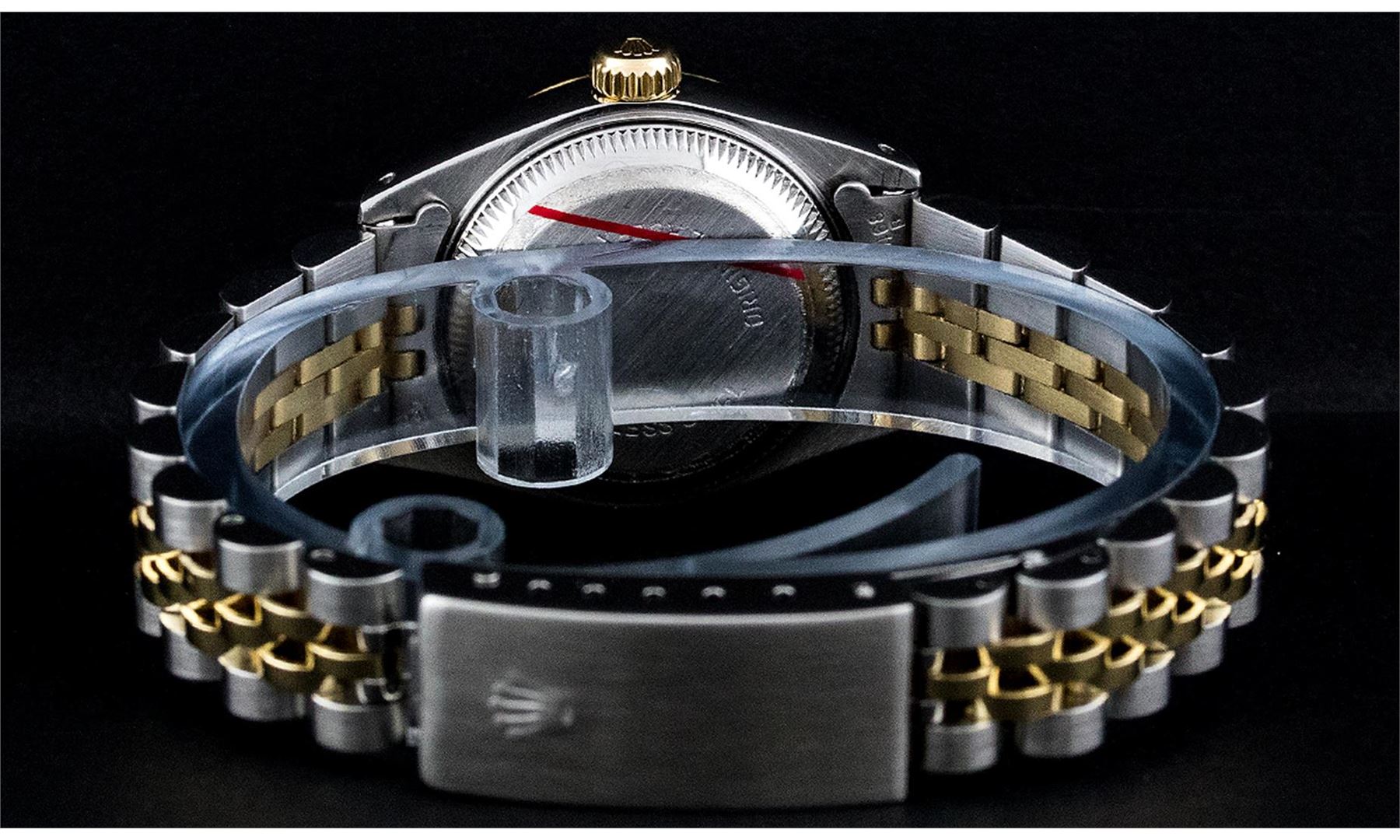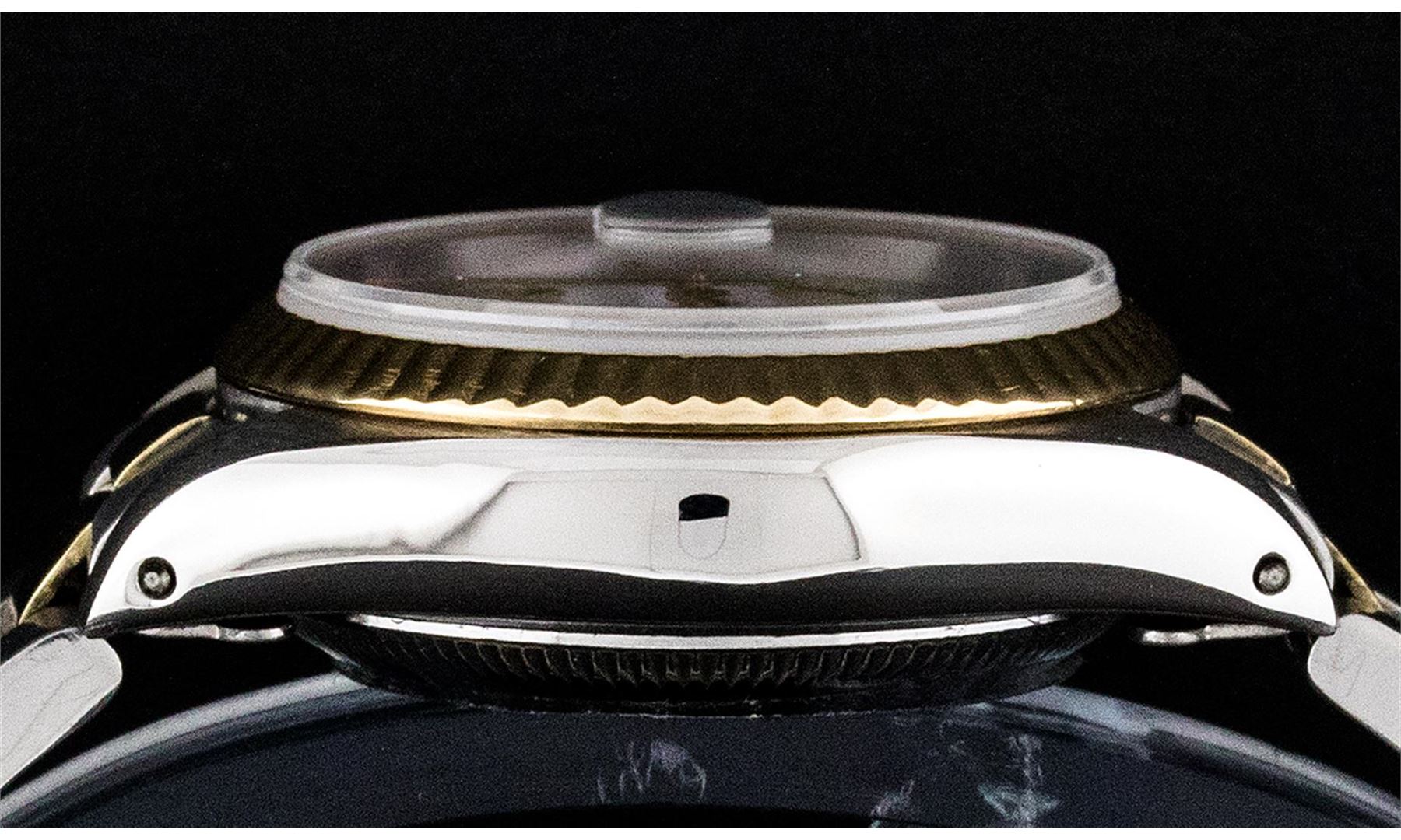 One Ladies Two Tone Yellow Gold Rolex Datejust Polished, Serviced & Electronically Tested, Yellow Gold & Stainless Steel Case: 26mm, Yellow Gold Crown, Bezel: Yellow Gold Fluted Bezel. Custom Crystal: New Acrylic Cyclops Lens. Custom Hands: New Luminescent Hands. Movement: Automatic Winding Movement. Dial: White Roman With Square Track. Date Window: 3 O'Clock Position Date Display, Model: Datejust. Condition: G-6 Extra Fine. Bracelet: Two Tone Yellow Gold Yellow Gold & Stainless Steel Jubilee Band. Bright Polish. 6.0 Inch Length, Adjustable. Standard Clasp, With Rolex Logo. This Watch Has Been Serviced Time Tested And Is In Excellent Condition It Is Free Of All Scratches And Dents.