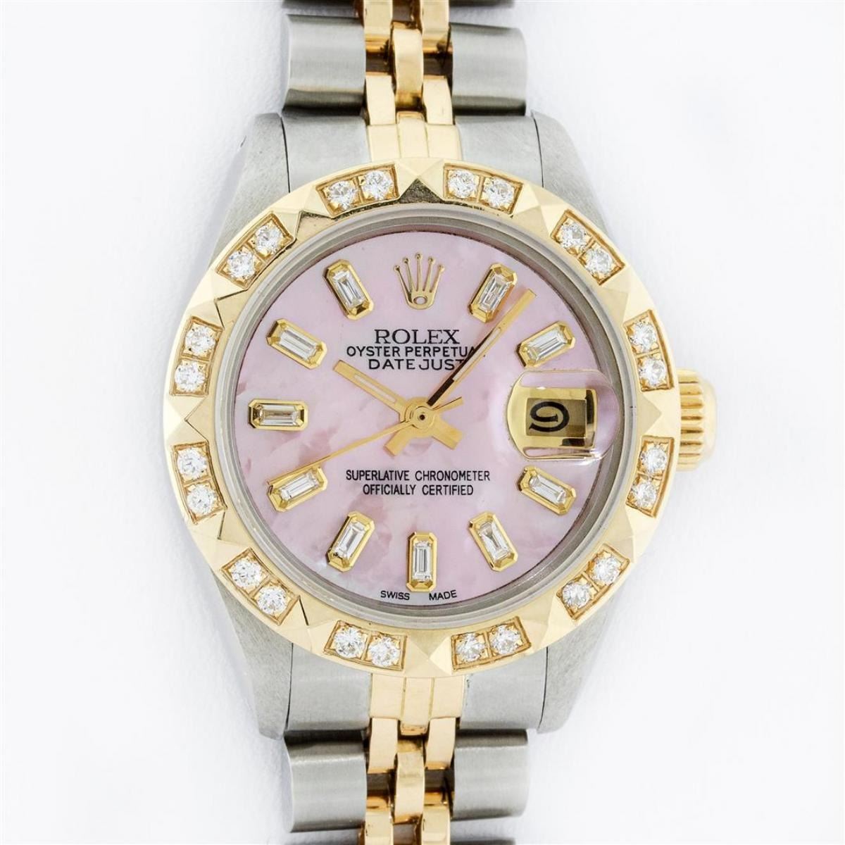 One Ladies Yellow Gold Two Tone and Stainless Steel Rolex Datejust Polished, Serviced & Electronically Tested, Yellow Gold & Stainless Steel Case: 26mm, Yellow Gold Crown, Custom Bezel: 18K Yellow Gold Pyramid Diamond Bezel, Diamond Count: 24 Diamonds Total Weight .50 Carat, Clarity: SI-VS, Color: G to H. Custom Crystal: New Scratch Resistant Synthetic Sapphire Cyclops Lens. Custom Hands: New Luminescent Hands. Movement: Automatic Winding Movement. Custom Dial: Pink Mother Of Pearl Baguette Diamond Hour Markers. 10 Baguette Diamonds In Dial, Clarity: SI-VS, Color: G to H. Date Window: 3 O'Clock Position Date Display, Model: Datejust. Condition: G-6 Extra Fine. Bracelet: Two Tone Yellow Gold & Stainless Steel Jubilee. Bright Polish. 6.0 Inch Length, Adjustable. Standard Clasp, With Rolex Logo. This Watch Has Been Serviced Time Tested And Is In Excellent Condition It Is Free Of All Scratches And Dents.