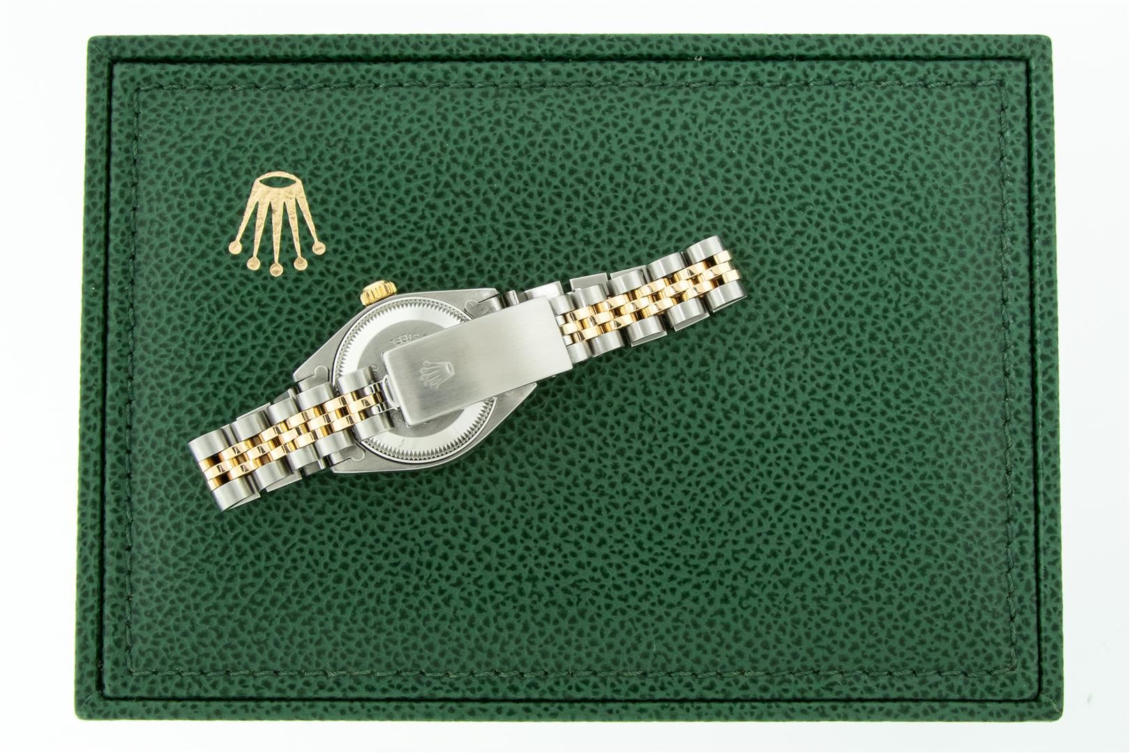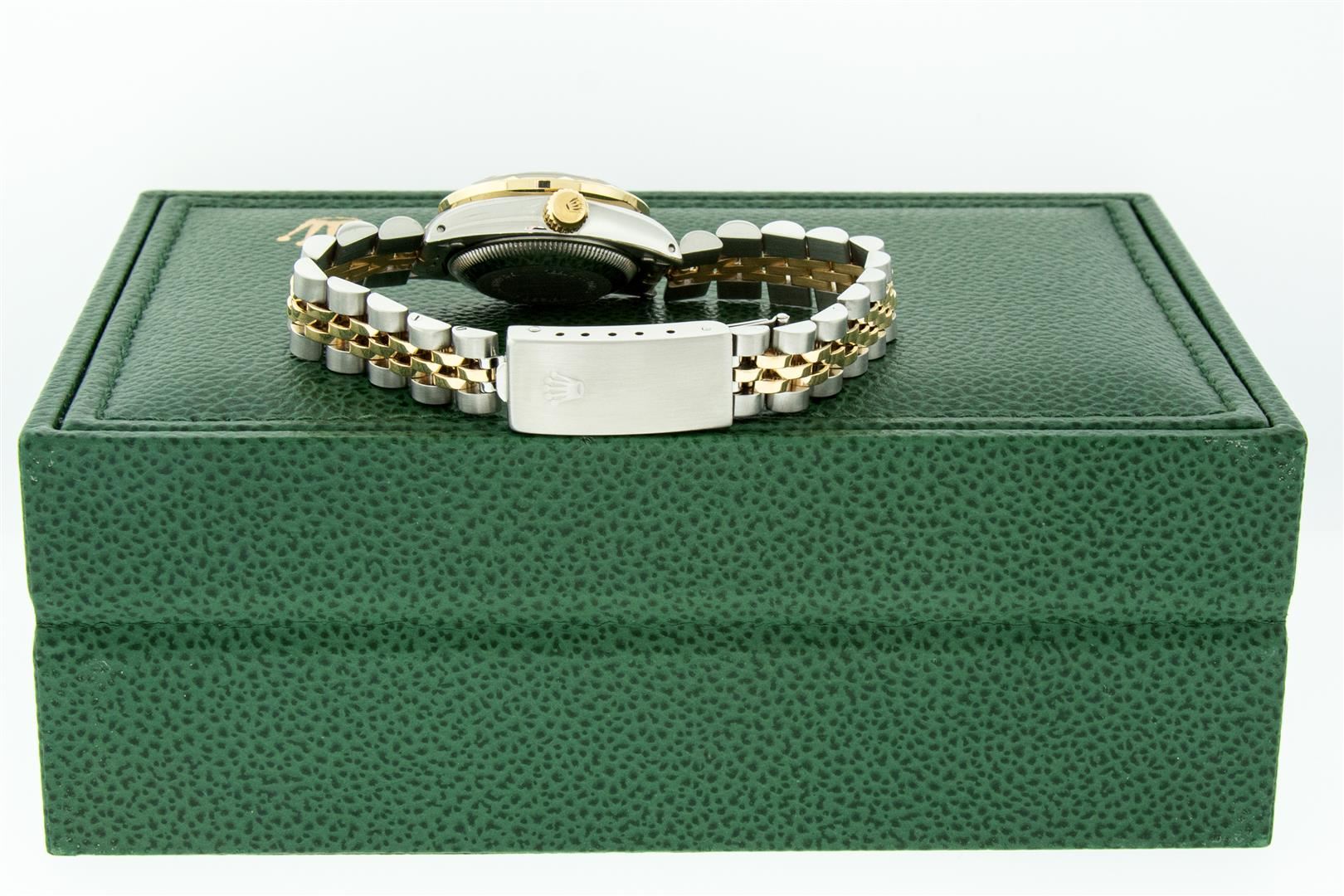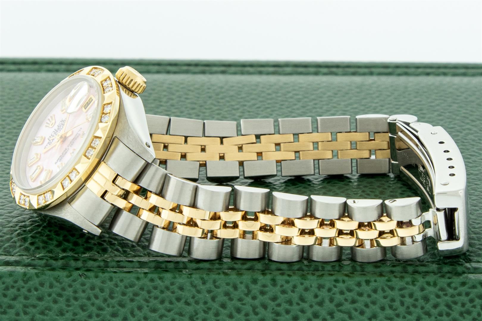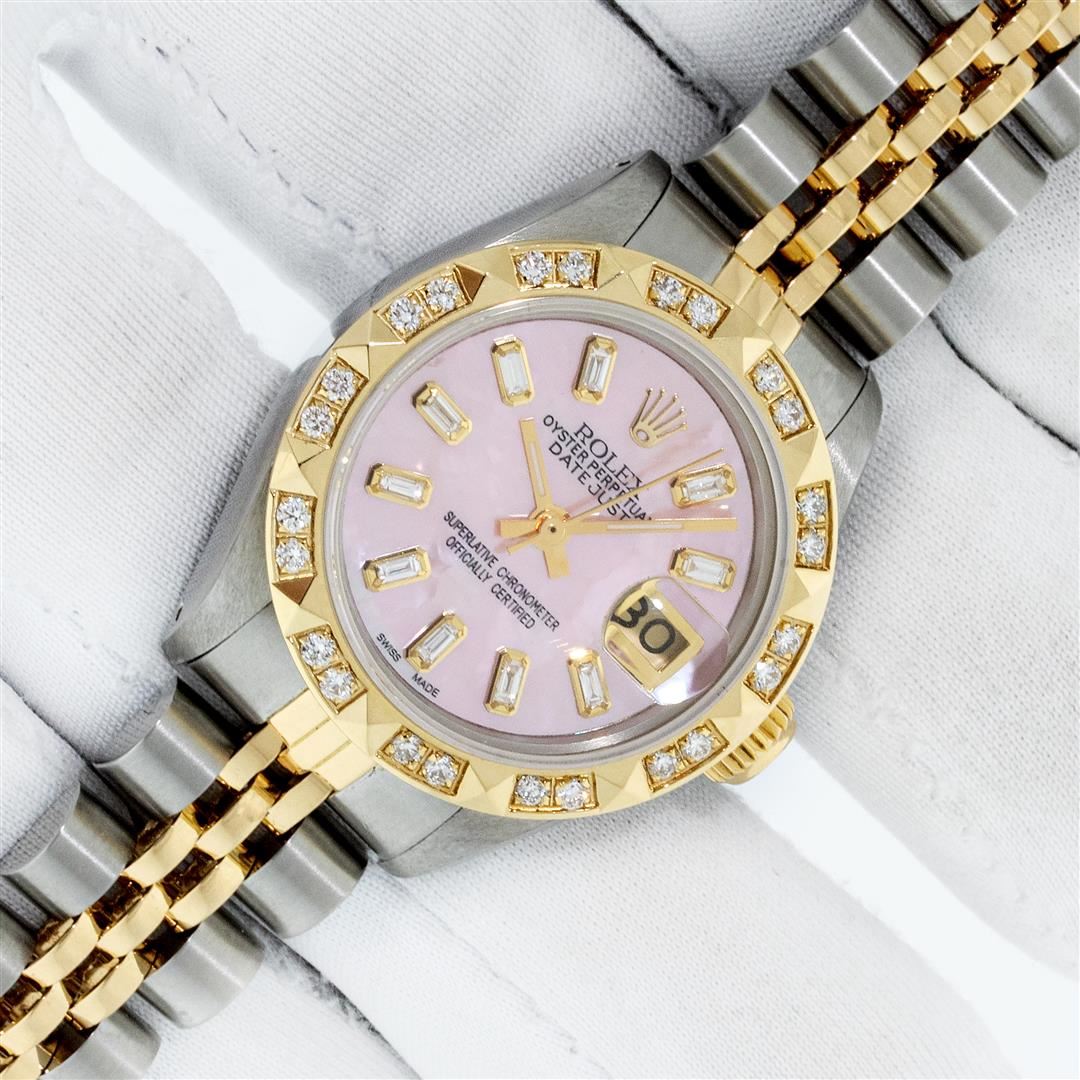 One Ladies Yellow Gold Two Tone and Stainless Steel Rolex Datejust Polished, Serviced & Electronically Tested, Yellow Gold & Stainless Steel Case: 26mm, Yellow Gold Crown, Custom Bezel: 18K Yellow Gold Pyramid Diamond Bezel, Diamond Count: 24 Diamonds Total Weight .50 Carat, Clarity: SI-VS, Color: G to H. Custom Crystal: New Scratch Resistant Synthetic Sapphire Cyclops Lens. Custom Hands: New Luminescent Hands. Movement: Automatic Winding Movement. Custom Dial: Pink Mother Of Pearl Baguette Diamond Hour Markers. 10 Baguette Diamonds In Dial, Clarity: SI-VS, Color: G to H. Date Window: 3 O'Clock Position Date Display, Model: Datejust. Condition: G-6 Extra Fine. Bracelet: Two Tone Yellow Gold & Stainless Steel Jubilee. Bright Polish. 6.0 Inch Length, Adjustable. Standard Clasp, With Rolex Logo. This Watch Has Been Serviced Time Tested And Is In Excellent Condition It Is Free Of All Scratches And Dents. This Watch Comes With A Rolex Box.