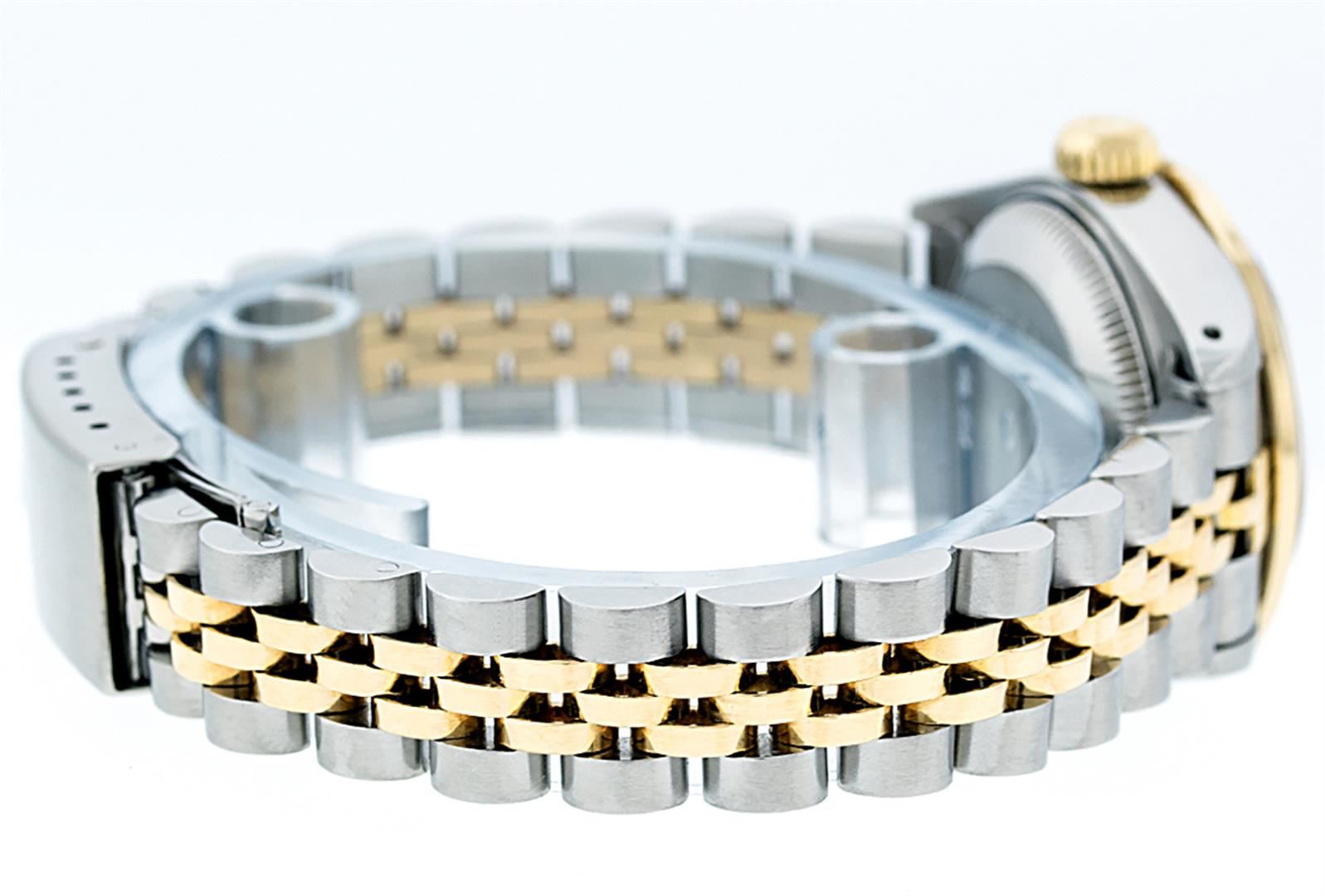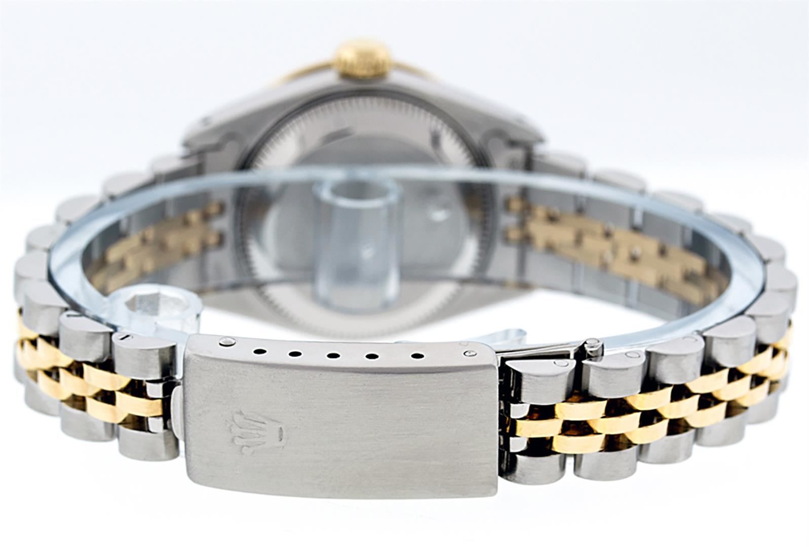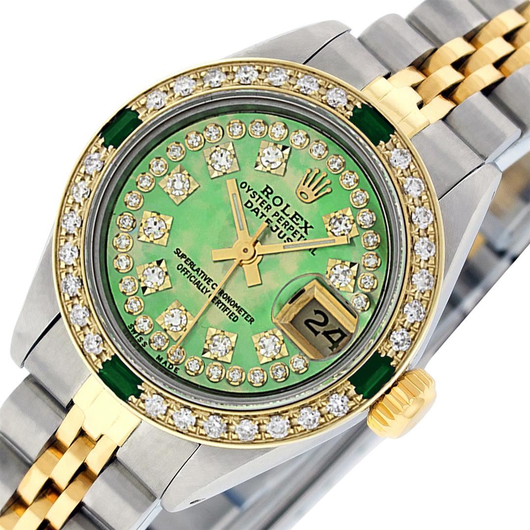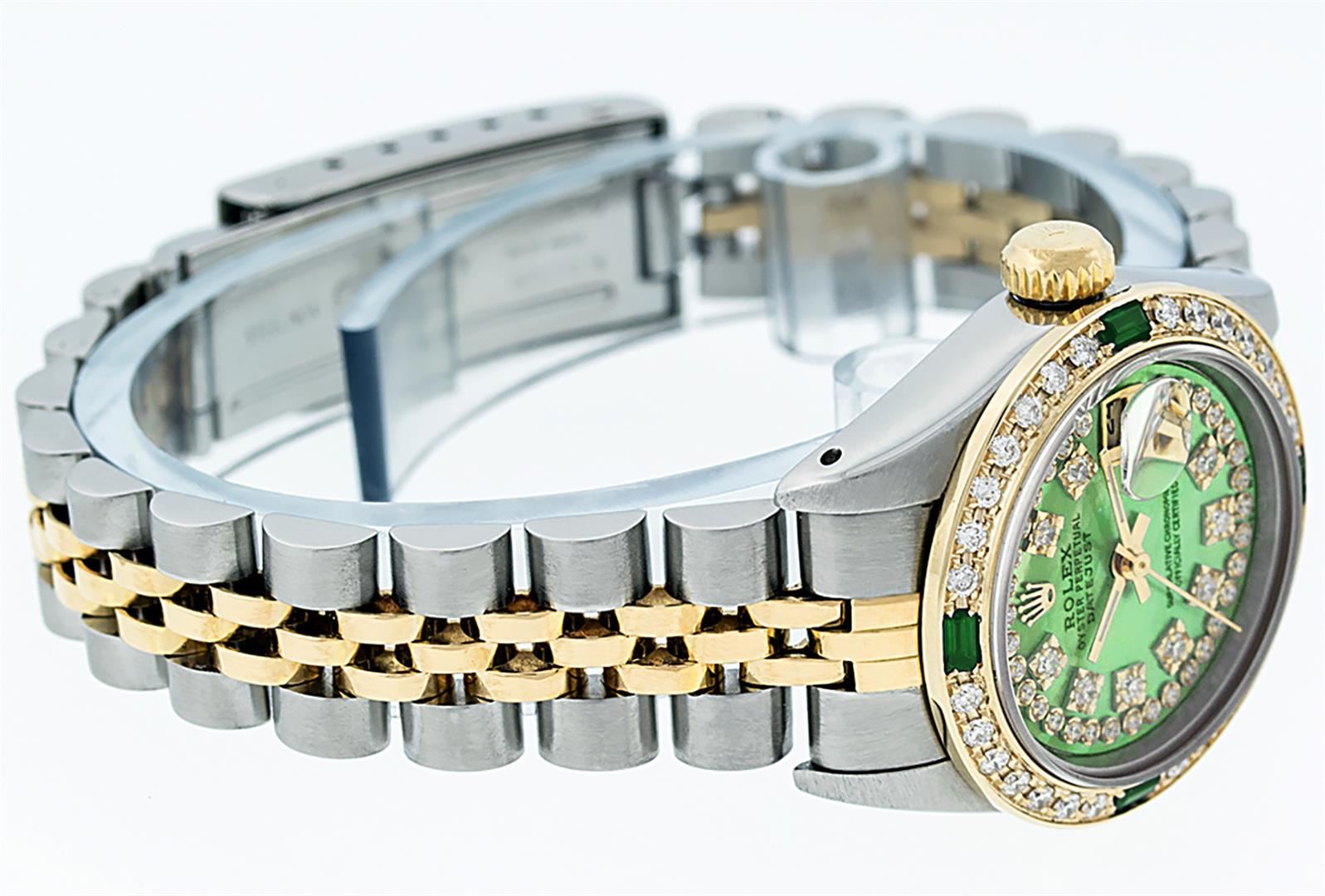 One Ladies Two Tone Rolex Datejust Polished, Serviced & Electronically Tested, Yellow Gold & Stainless Steel Case: 26mm, Yellow Gold Crown, Custom Bezel: New 18K Yellow Gold Emerald Beadset Diamond Bezel, Diamond + Gem Count: 28 Diamonds + 4 Emeralds, Total Weight .70 Carat, Clarity: SI-VS, Color: G to H. Custom Crystal: New Scratch Resisant Synthetic Sapphire Cyclops Lens. Custom Hands: New Luminescent Hands. Movement: Automatic Winding Movement. Custom Dial: Green Mother Of Pearl String Diamond Dial, Diamond Count: 43 Diamond in Dial, G To H In Color, VS Clarity. Date Window: 3 O'Clock Position Date Display, Model: Datejust, Condition: G-6 Extra Fine. Bracelet: Two Tone Yellow Gold & Stainless Steel Jubilee. Bright Polish. 6.0 Inch Length, Adjustable. Standard Clasp, With Rolex Logo. This Watch Has Been Serviced Time Tested And Is In Excellent Condition It Is Free Of All Scratches And Dents.