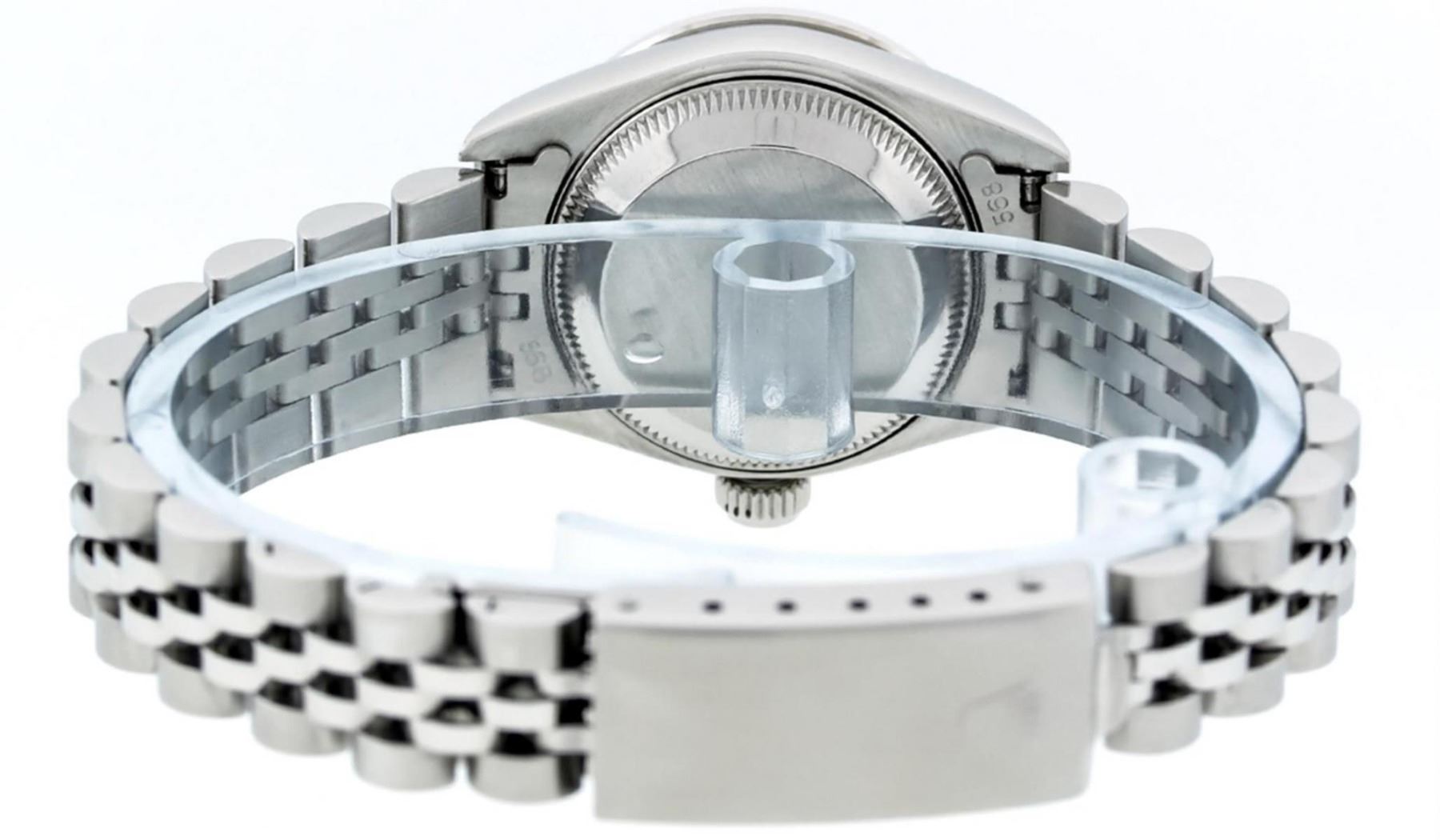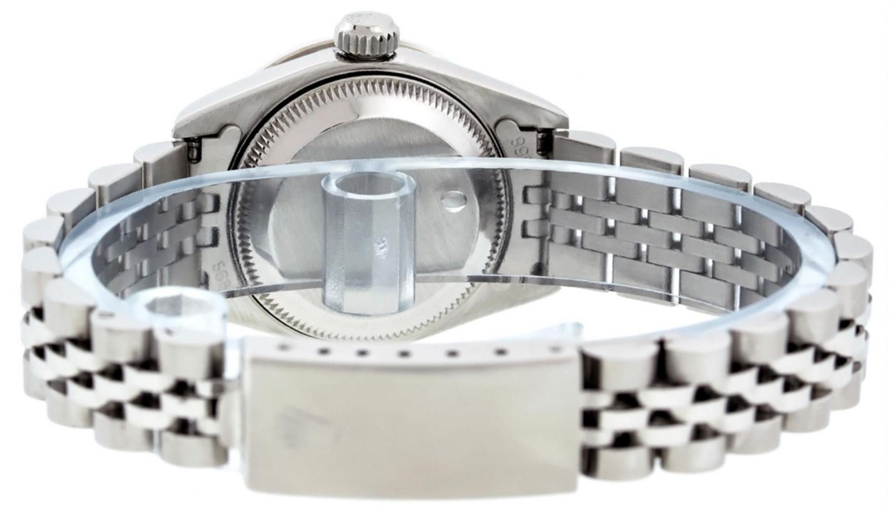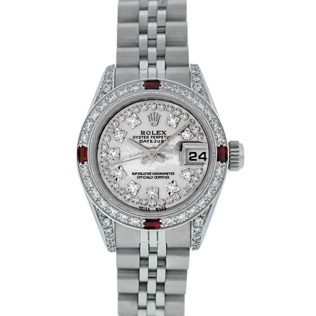 One Quickset Ladies Stainless Steel Rolex Datejust Polished Bright with Satin Finish, Serviced & Electronically Tested, Stainless Steel Case: 26mm, Stainless Steel Crown, Custom Diamond Lugs: 24 Diamonds On Lugs, Clarity: SI-VS, Color: G to H. Custom Bezel: New 18K White Gold Diamond + Ruby Beadset Diamond Bezel, Stone Count: 28 Diamonds + 4 Rubies, Total Weight .70 Carat, Clarity: SI-VS, Color: G to H. Custom Crystal: New Scratch Resistant Synthetic Sapphire Cyclops Lens. Custom Hands: New Luminescent Hands. Movement: Automatic Winding Movement. Custom Dial: Refinished Single Cut Mother Of Pearl String Diamond Dial, 43 Diamonds in Dial G To H In Color, Clarity: VS. Date Window: 3 O'Clock Position Date Display, Model: Quickset Datejust. Condition: G-6 Extra Fine. Bracelet: Stainless Steel Jubilee Band. Bright Polish & Satin Finish. 6.0 Inch Length, Adjustable. Standard Clasp, With Rolex Logo. This Watch Has Been Serviced Time Tested And Is In Excellent Condition It Is Free Of All Scratches And Dents.
