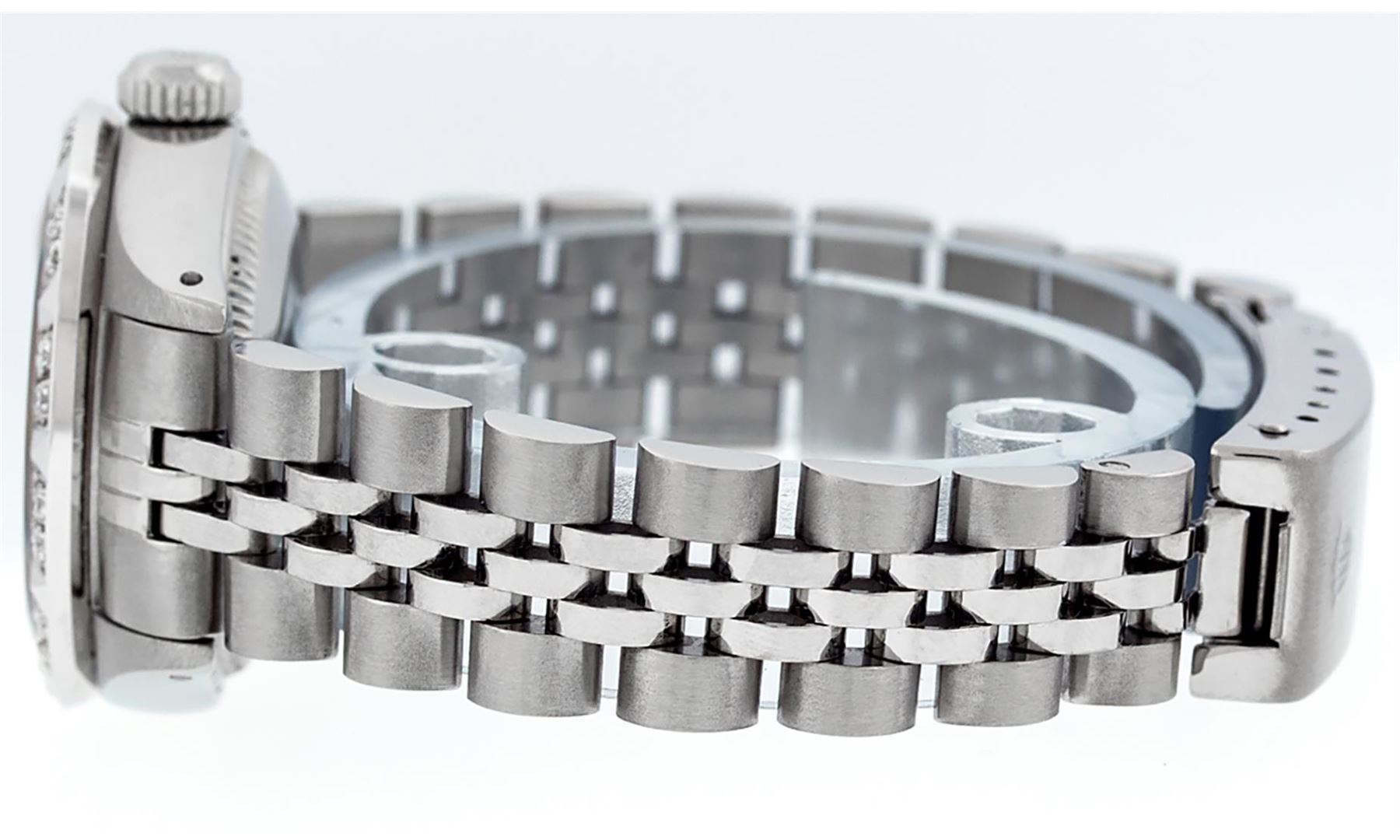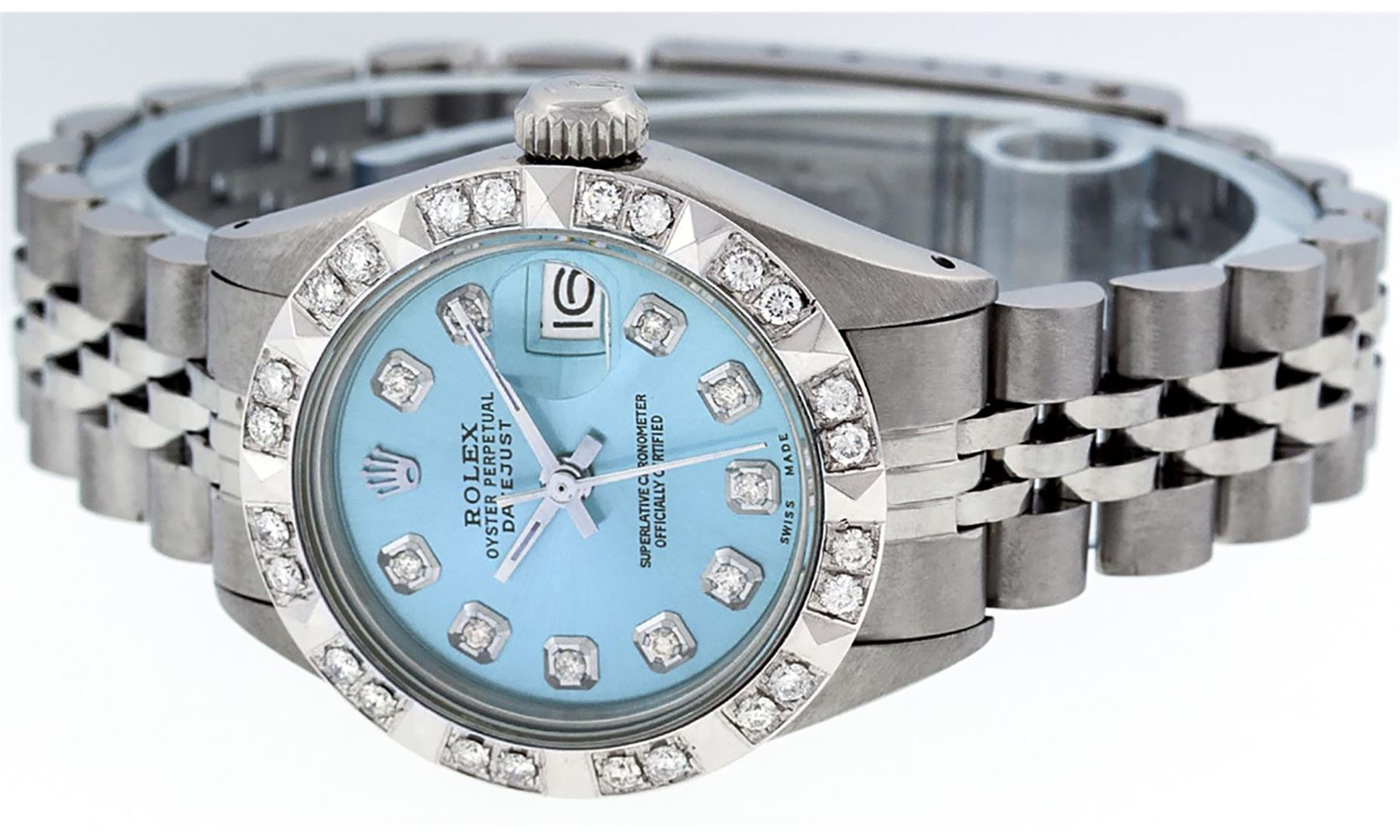 One Ladies Stainless Steel Rolex Datejust Polished Bright with Satin Finish, Serviced & Electronically Tested, Stainless Steel Case: 26mm, Stainless Steel Crown, Custom Bezel: New 18K White Gold Pyramid Diamond Bezel, Diamond Count: 24 Diamonds In Dial. Total Weight .50 Carat, Clarity: SI-VS, Color: G to H. Custom Crystal: New Scratch Resistant Synthetic Sapphire Cyclops Lens. Custom Hands: New Luminescent Hands. Movement: Automatic Winding Movement. Custom Dial: Blue Diamond Dial. Diamond Count: 10 Diamonds In Dial. Clarity: SI-VS, Color: G to H. Date Window: 3 O'Clock Position Date Display, Model: Datejust. Condition: G-6 Extra Fine. Bracelet: Stainless Steel Jubilee Band With Rolex Crown On Buckle. Bright Polish & Satin Finish. Band Length: 6.0 Inch Length, Adjustable. Standard Clasp, With Rolex Logo. This Watch Has Been Serviced Time Tested And Is In Excellent Condition It Is Free Of All Scratches And Dents.