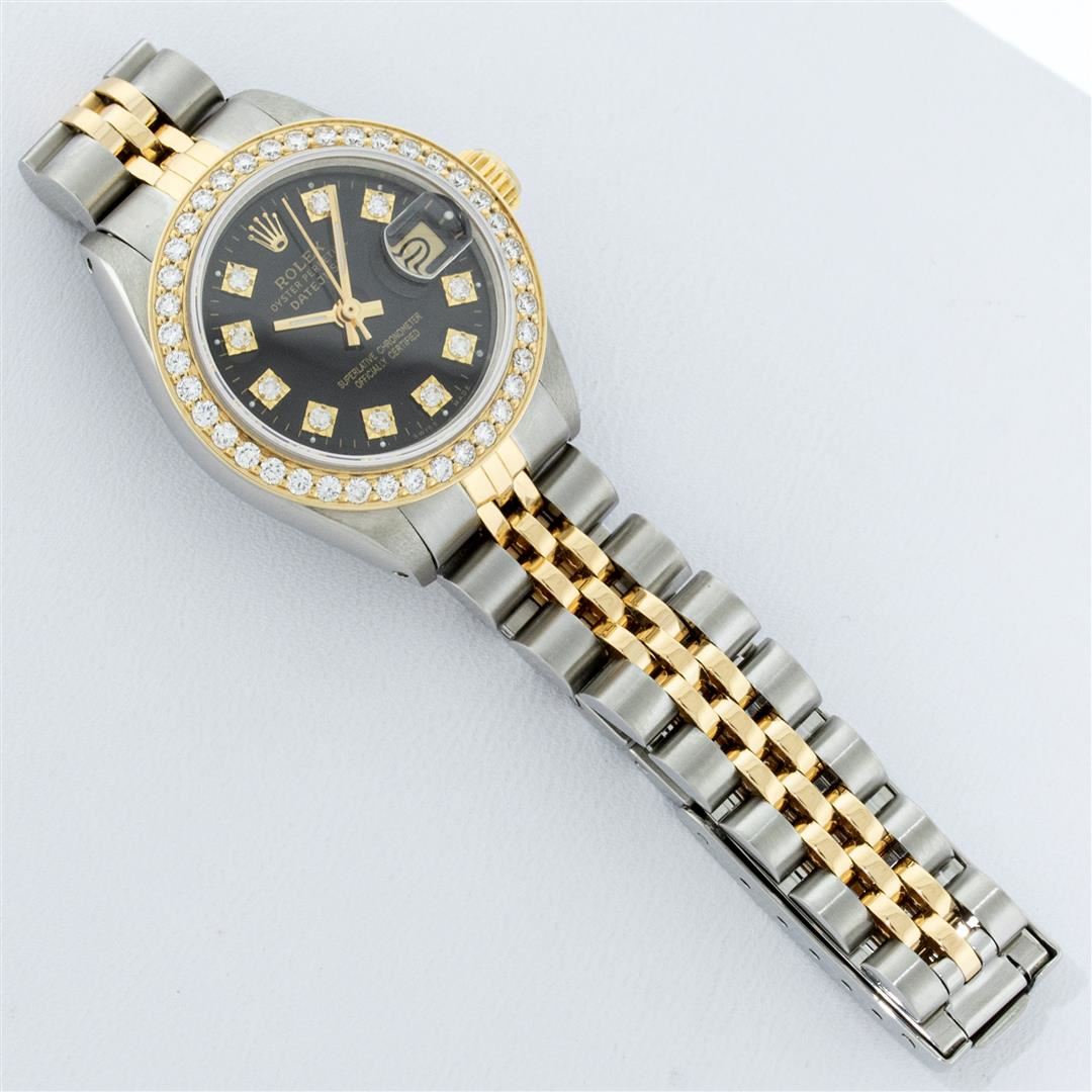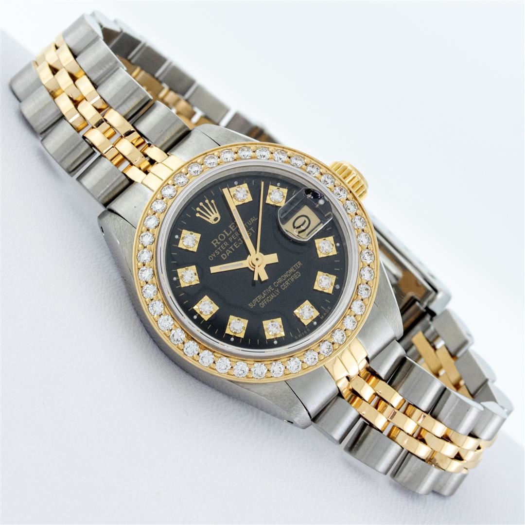 One Ladies Two Tone Rolex Datejust Polished, Serviced & Electronically Tested, Yellow Gold & Stainless Steel Case: 26mm, Yellow Gold Crown, Custom Bezel: New 18K 1ctw Yellow Gold Beadset Diamond Bezel, Diamond Count: 44 Diamonds, Total Weight 1.00 Carat, Clarity: Si-VS, Color: G to H. Custom Crystal: New Synthetic Sapphire Cyclops Lens. Custom Hands: New Luminescent Hands. Movement: Automatic Winding Movement. Custom Dial: Mother Of Pearl String Diamond Dial, Diamond Count: 43 Single Cut Diamonds in Dial, G To H In Color, VS Clarity. Date Window: 3 O'Clock Position Date Display, Model: Datejust, Condition: G-6 Extra Fine. Bracelet: Two Tone Yellow Gold & Stainless Steel Jubilee. Bright Polish. 6.0 Inch Length, Adjustable. Standard Clasp, With Rolex Logo. This Watch Has Been Serviced Time Tested And Is In Excellent Condition It Is Free Of All Scratches And Dents.