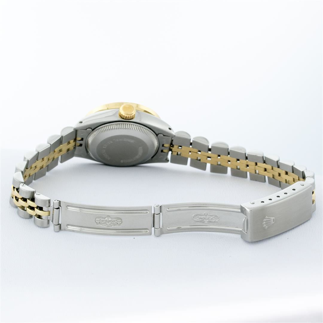 One Ladies Pre Owned Rolex Two Tone 14K Yellow Gold & Stainless Steel Rolex Polished, Serviced & Electronically Tested, Rolex 14K Yellow Gold & Stainless Steel Case: 26mm, Rolex Yellow Gold Crown, Custom Bezel: New 18K Yellow Gold Pyramid Diamond Bezel, Diamond Count: 24 Diamonds In Bezel. Total Weight .50 Carat, Clarity: SI-VS, Color: G to H. Custom Crystal: New Sapphire With Magnified Date Window. Custom Hands: New Luminescent Hands. Rolex Movement: Automatic Winding Movement 2030. Rolex Dial: Black With Index Hour Markers With Dash Track & Lumi Dots. Date Window: 3 O'Clock Position Date Display, Model: Date. Condition: G-6 Extra Fine. Rolex Bracelet: Two Tone 14K Yellow Gold & Stainless Steel Jubilee Band. Bright Polish. 6.0 Inch Length, Adjustable. Standard Clasp, With Rolex Logo. This Watch Has Been Serviced Time Tested And Is In Excellent Condition It Is Free Of All Scratches And Dents.