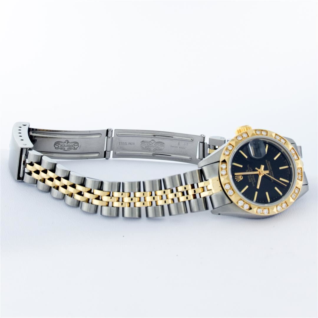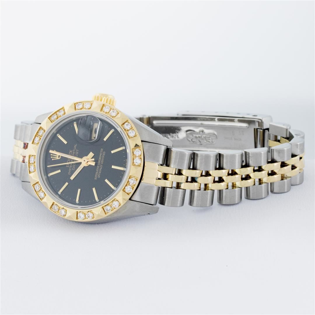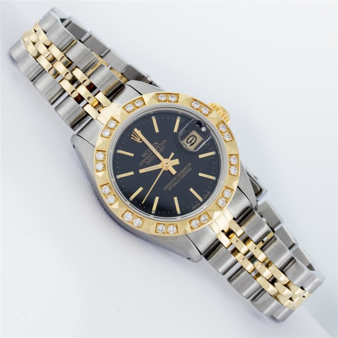 One Ladies Pre Owned Rolex Two Tone 14K Yellow Gold & Stainless Steel Rolex Polished, Serviced & Electronically Tested, Rolex 14K Yellow Gold & Stainless Steel Case: 26mm, Rolex Yellow Gold Crown, Custom Bezel: New 18K Yellow Gold Pyramid Diamond Bezel, Diamond Count: 24 Diamonds In Bezel. Total Weight .50 Carat, Clarity: SI-VS, Color: G to H. Custom Crystal: New Sapphire With Magnified Date Window. Custom Hands: New Luminescent Hands. Rolex Movement: Automatic Winding Movement 2030. Rolex Dial: Black With Index Hour Markers With Dash Track & Lumi Dots. Date Window: 3 O'Clock Position Date Display, Model: Date. Condition: G-6 Extra Fine. Rolex Bracelet: Two Tone 14K Yellow Gold & Stainless Steel Jubilee Band. Bright Polish. 6.0 Inch Length, Adjustable. Standard Clasp, With Rolex Logo. This Watch Has Been Serviced Time Tested And Is In Excellent Condition It Is Free Of All Scratches And Dents.