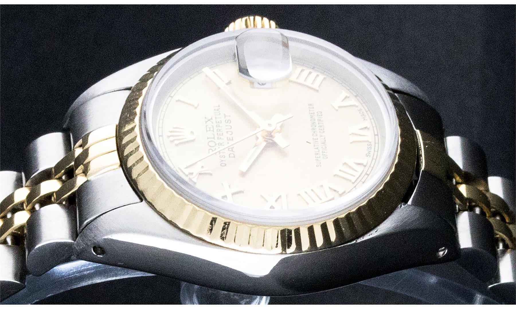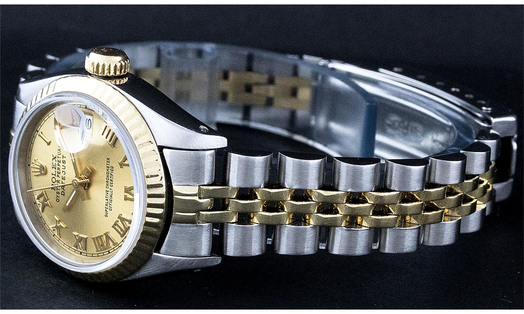 One Ladies Pre Owned Two Tone 14K Yellow Gold & Stainless Steel Rolex Polished, Serviced & Electronically Tested, Rolex Yellow Gold & Stainless Steel Case: 26mm, Rolex Yellow Gold Crown, Rolex Bezel: 14K Yellow Gold Fluted Bezel. Custom Crystal: New Plexiglass With Date Window. Hands: Luminescent Hands. Rolex Movement: Automatic Winding Movement 2030. Rolex Dial: Champagne Roman With Square Track. Date Window: 3 O'Clock Position Date Display, Model: Datejust. Condition: G-6 Extra Fine. Rolex Bracelet: Two Tone 14K Yellow Gold & Stainless Steel Jubilee Band. Bright Polish. 6.0 Inch Length, Adjustable. Standard Clasp, With Rolex Logo. This Watch Has Been Serviced Time Tested And Is In Excellent Condition It Is Free Of All Scratches And Dents.