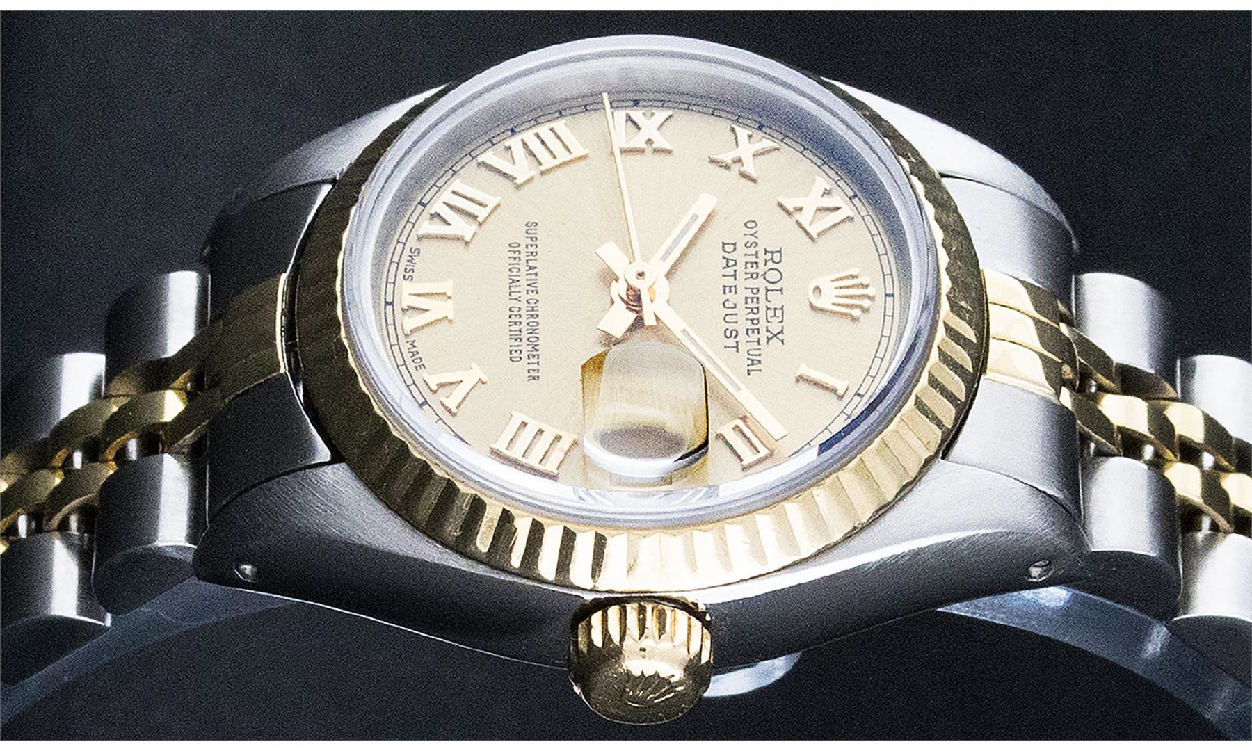 One Ladies Pre Owned Two Tone 14K Yellow Gold & Stainless Steel Rolex Polished, Serviced & Electronically Tested, Rolex Yellow Gold & Stainless Steel Case: 26mm, Rolex Yellow Gold Crown, Rolex Bezel: 14K Yellow Gold Fluted Bezel. Custom Crystal: New Plexiglass With Date Window. Hands: Luminescent Hands. Rolex Movement: Automatic Winding Movement 2030. Rolex Dial: Champagne Roman With Square Track. Date Window: 3 O'Clock Position Date Display, Model: Datejust. Condition: G-6 Extra Fine. Rolex Bracelet: Two Tone 14K Yellow Gold & Stainless Steel Jubilee Band. Bright Polish. 6.0 Inch Length, Adjustable. Standard Clasp, With Rolex Logo. This Watch Has Been Serviced Time Tested And Is In Excellent Condition It Is Free Of All Scratches And Dents.