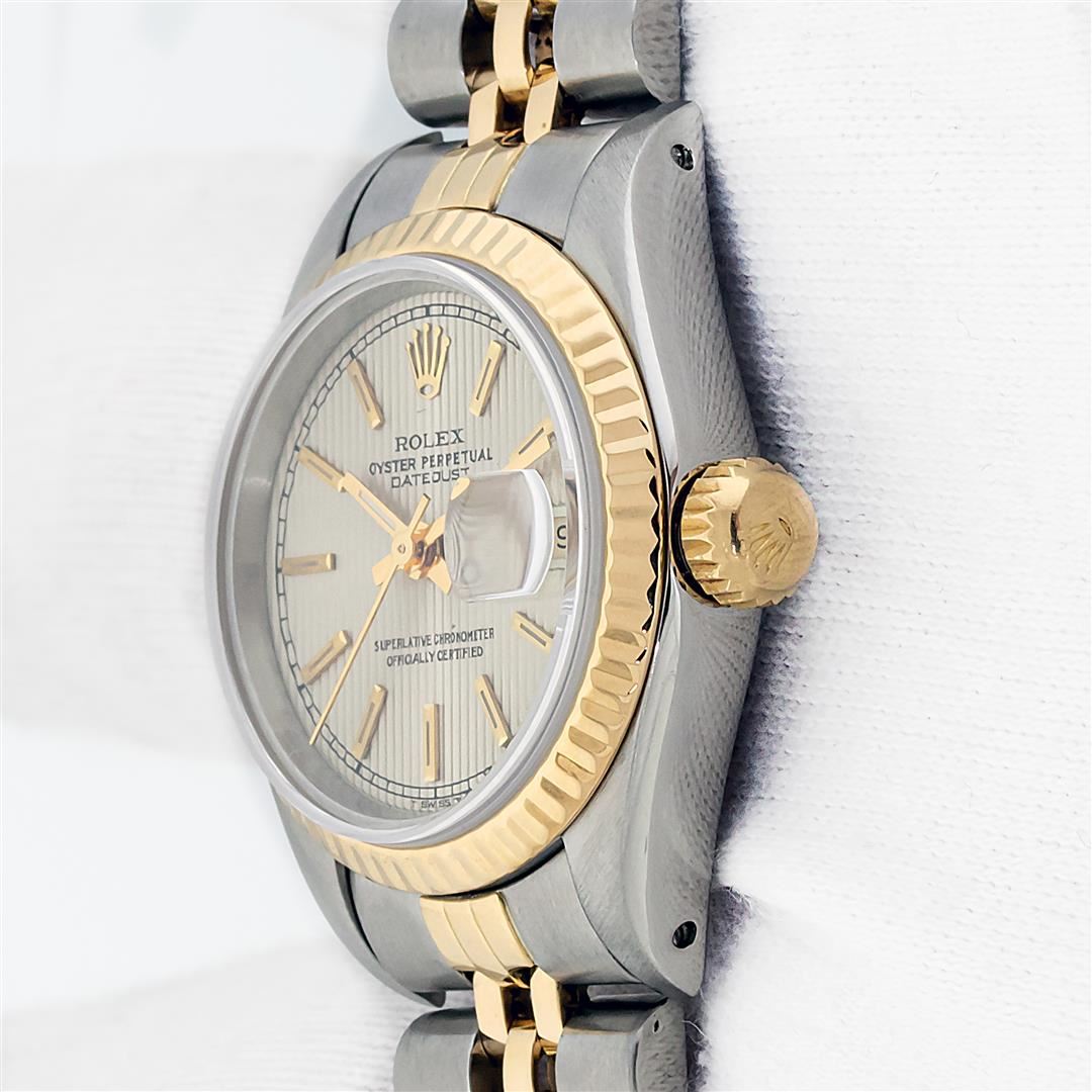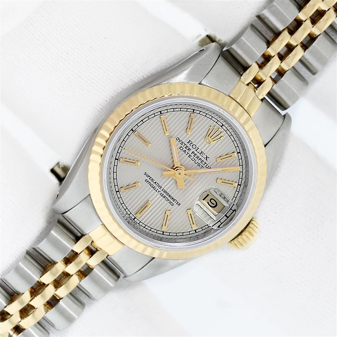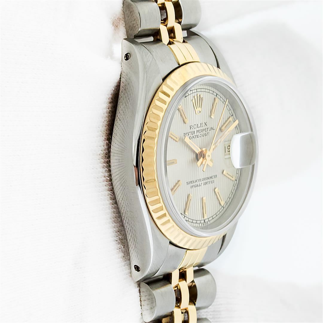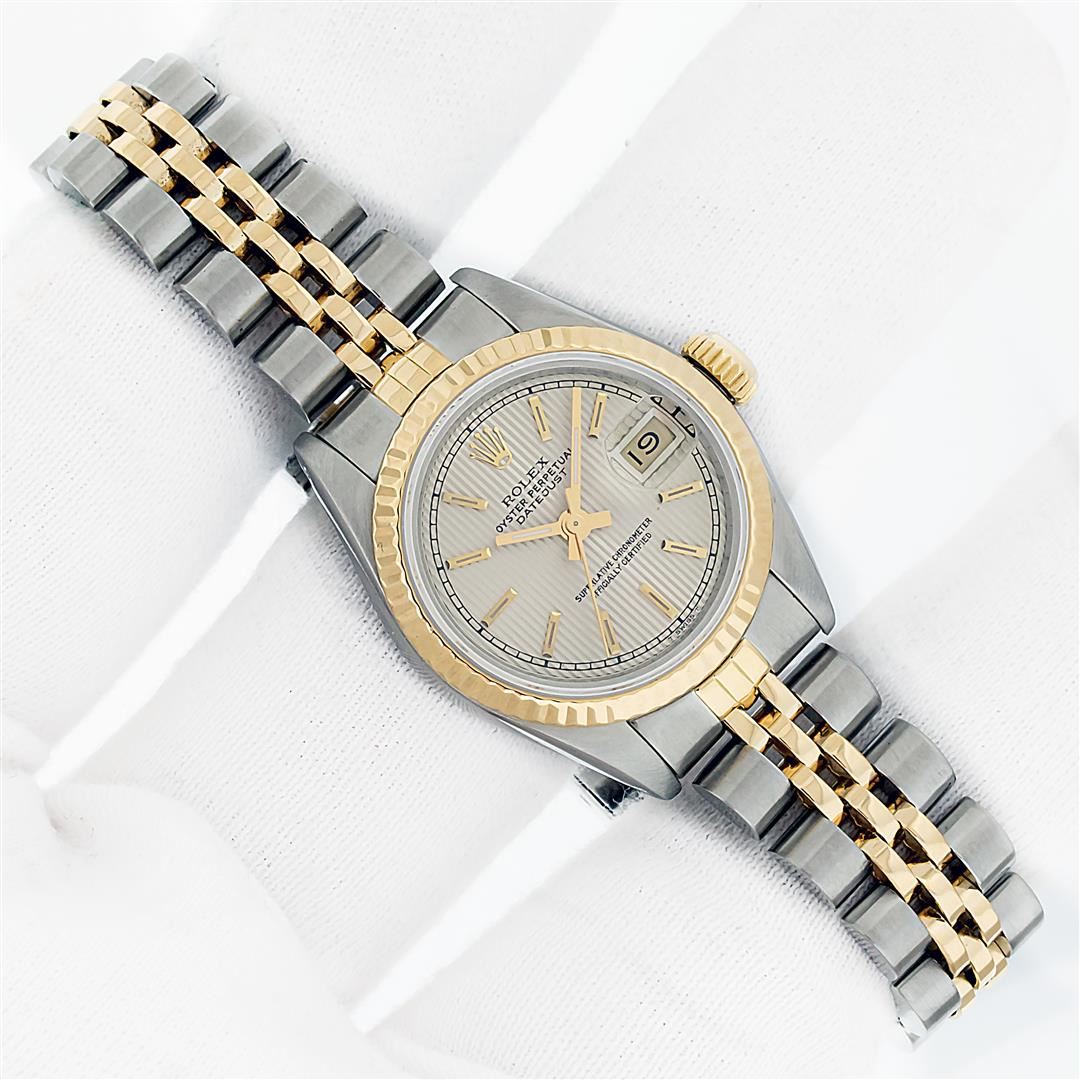 One Ladies Pre Owned Two Tone Rolex Datejust Polished, Serviced & Electronically Tested, Rolex Yellow Gold & Stainless Steel Case: 26mm, Rolex Yellow Gold Crown, Rolex Bezel: Yellow Gold Fluted Bezel. Custom Crystal: New With Cyclops Lens. Custom Hands: New Luminescent Hands. Rolex Movement: Automatic Winding Movement. Rolex Dial: Silver Index Tapestry With Square Track. Date Window: 3 O'Clock Position Date Display, Model: Datejust. Condition: G-6 Extra Fine. Rolex Bracelet: Two Tone Yellow Gold & Stainless Steel Jubilee Band. Bright Polish. 6.0 Inch Length, Adjustable. Standard Clasp, With Rolex Logo. This Watch Has Been Serviced Time Tested And Is In Excellent Condition It Is Free Of All Scratches And Dents.