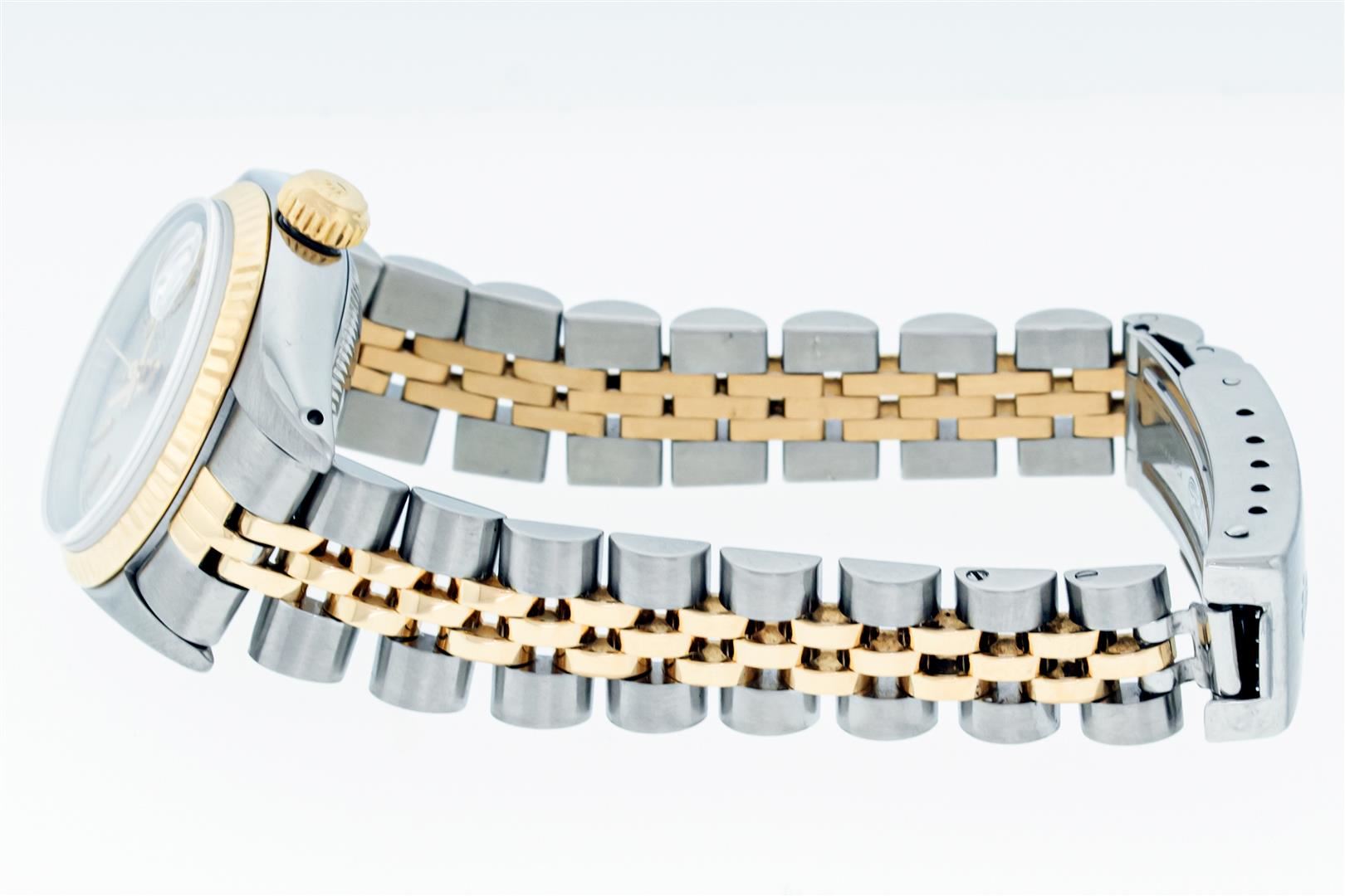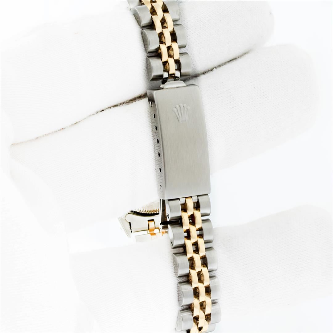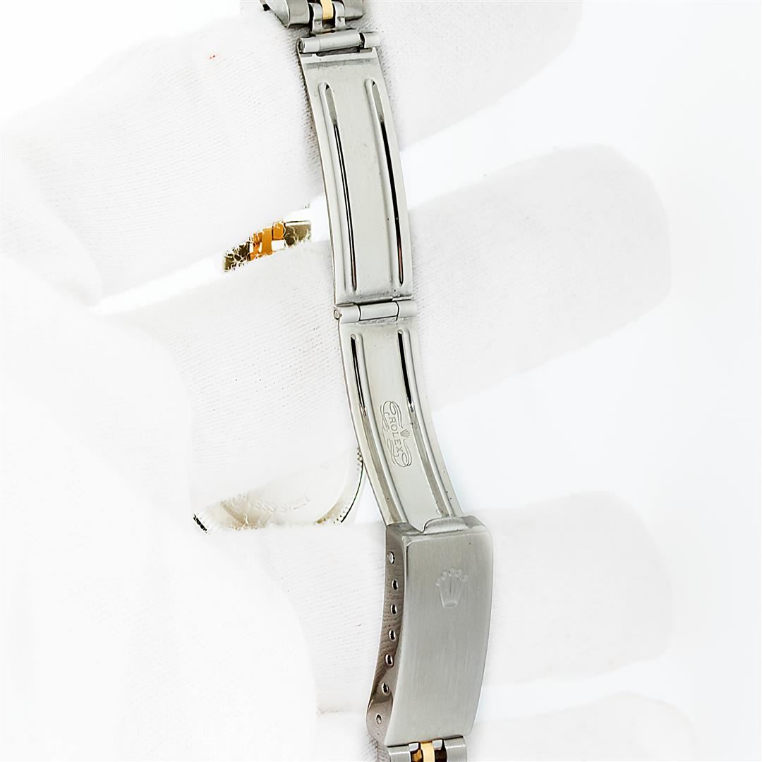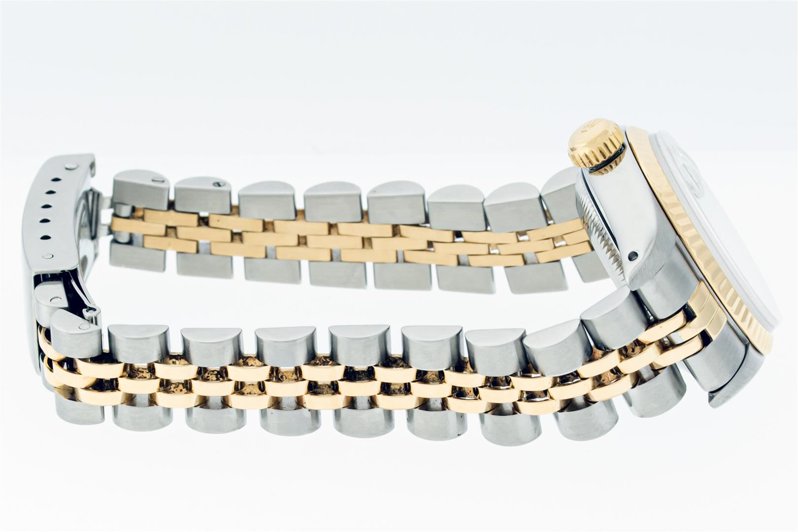 One Ladies Pre Owned Two Tone Rolex Datejust Polished, Serviced & Electronically Tested, Rolex Yellow Gold & Stainless Steel Case: 26mm, Rolex Yellow Gold Crown, Rolex Bezel: Yellow Gold Fluted Bezel. Custom Crystal: New With Cyclops Lens. Custom Hands: New Luminescent Hands. Rolex Movement: Automatic Winding Movement. Rolex Dial: Silver Index Tapestry With Square Track. Date Window: 3 O'Clock Position Date Display, Model: Datejust. Condition: G-6 Extra Fine. Rolex Bracelet: Two Tone Yellow Gold & Stainless Steel Jubilee Band. Bright Polish. 6.0 Inch Length, Adjustable. Standard Clasp, With Rolex Logo. This Watch Has Been Serviced Time Tested And Is In Excellent Condition It Is Free Of All Scratches And Dents.