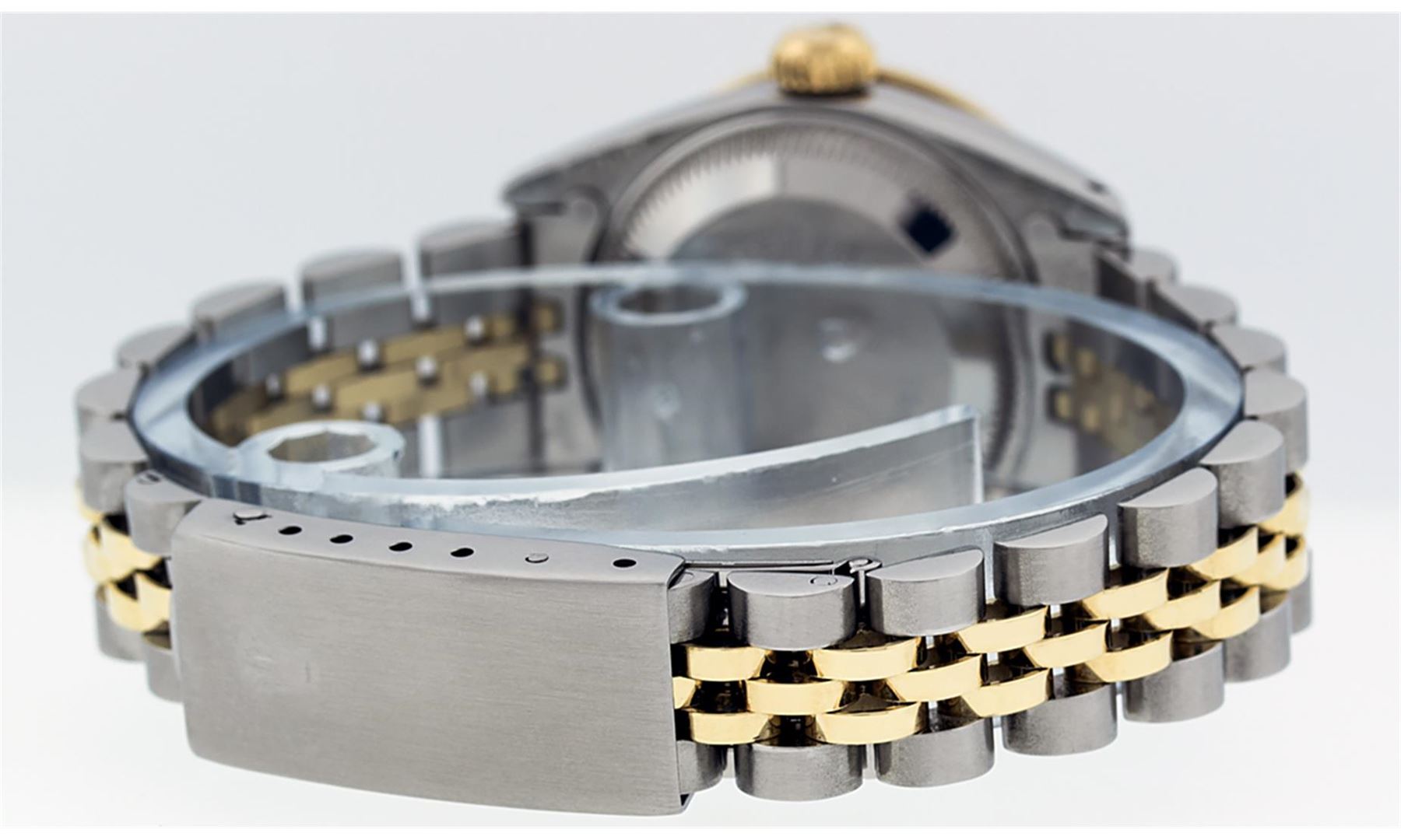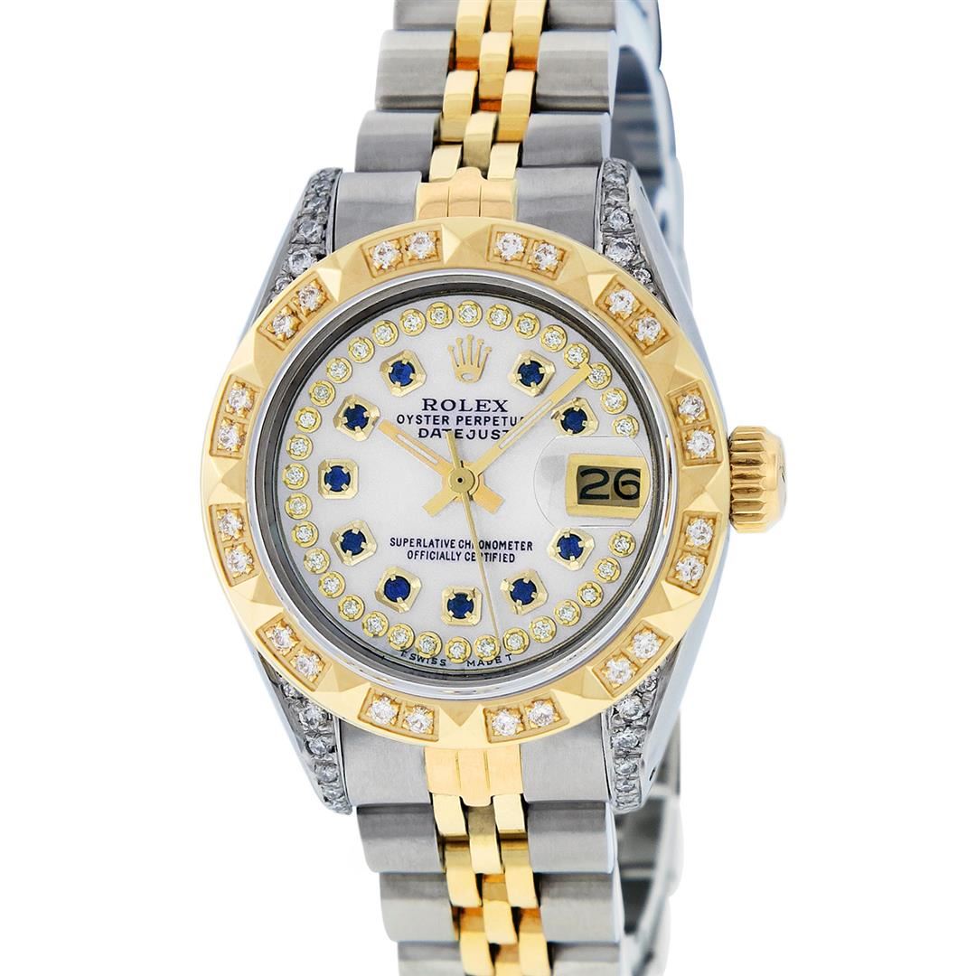 One Ladies Two Tone Rolex Datejust Polished, Serviced & Electronically Tested, Yellow Gold & Stainless Steel Case: 26mm, Yellow Gold Crown, Diamond Lugs: 24 Diamonds On Lugs, Clarity: SI-VS, Color: G to H. Custom Bezel: New 18K Yellow Gold Pyramid Diamond Bezel, Diamond Count: 24 Diamonds, Total Weight .50 Carat, Clarity: SI-VS, Color: G to H. Custom Crystal: New Scratch Resistant Synthetic Sapphire Cyclops Lens. Custom Hands: New Luminescent Hands. Movement: Automatic Winding Movement. Custom Dial: Mother Of Pearl With Sapphire Hour Markers, Stone Count: 10 Sapphires + 33 Diamonds In Dial, Clarity: SI-VS, Color: G to H. Date Window: 3 O'Clock Position Date Display, Model: Datejust. Condition: G-6 Extra Fine. Bracelet: Two Tone Yellow Gold & Stainless Steel Jubilee Band. Bright Polish. 6.0 Inch Length, Adjustable. Standard Clasp, With Rolex Logo. This Watch Has Been Serviced Time Tested And Is In Excellent Condition It Is Free Of All Scratches And Dents.
