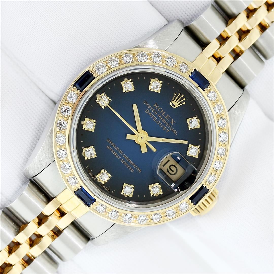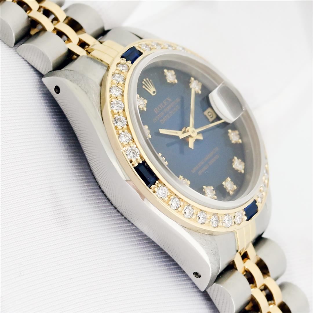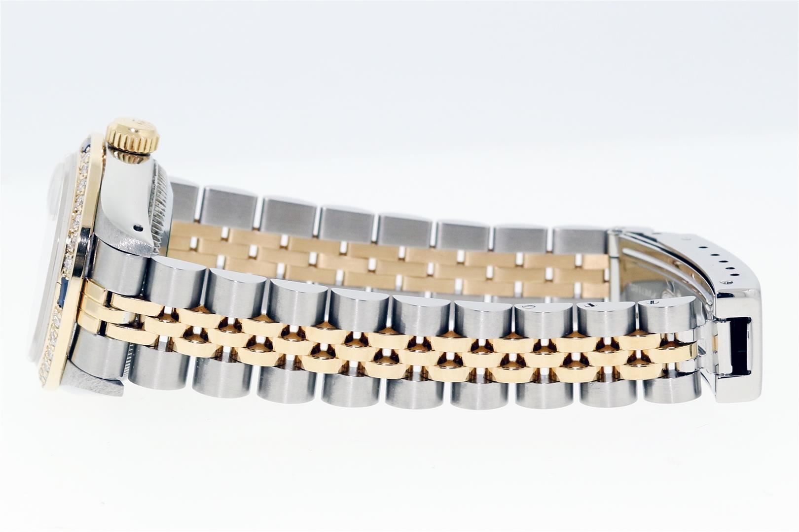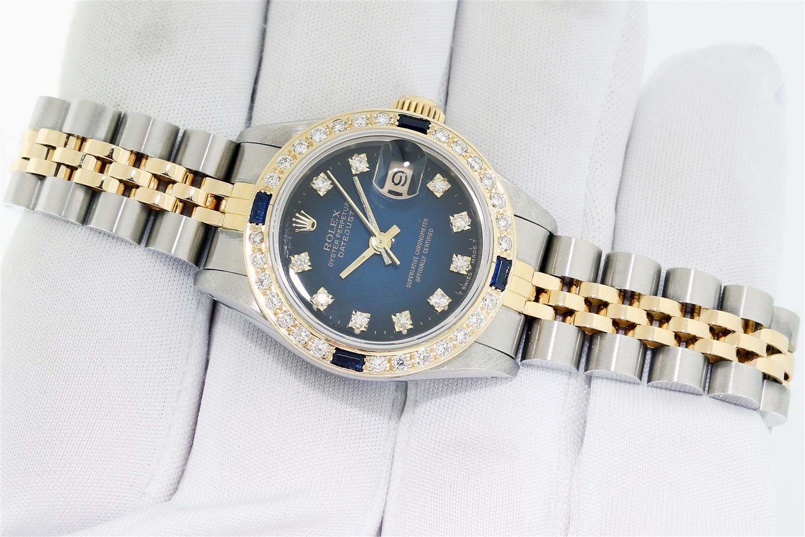 One Ladies Quickset Pre Owned Two Tone 18K Yellow Gold & Stainless Steel Rolex Datejust Polished, Serviced & Electronically Tested, Rolex Yellow Gold & Stainless Steel Case: 26mm, Rolex Yellow Gold Crown, Custom Bezel: New 18K Yellow Gold Sapphire Diamond