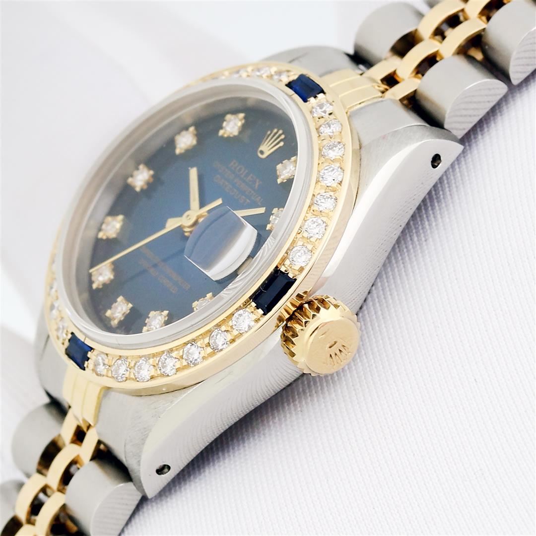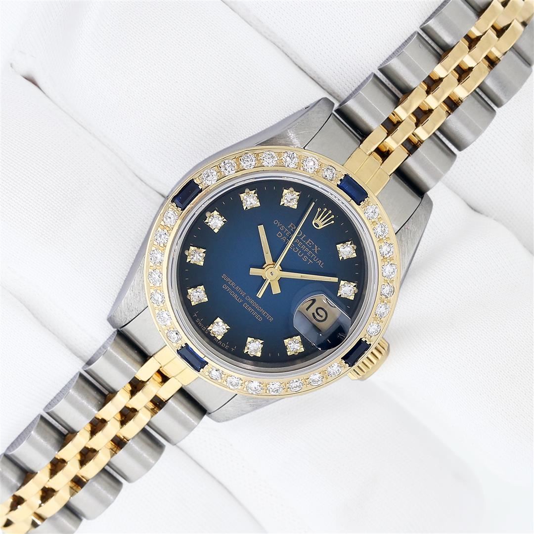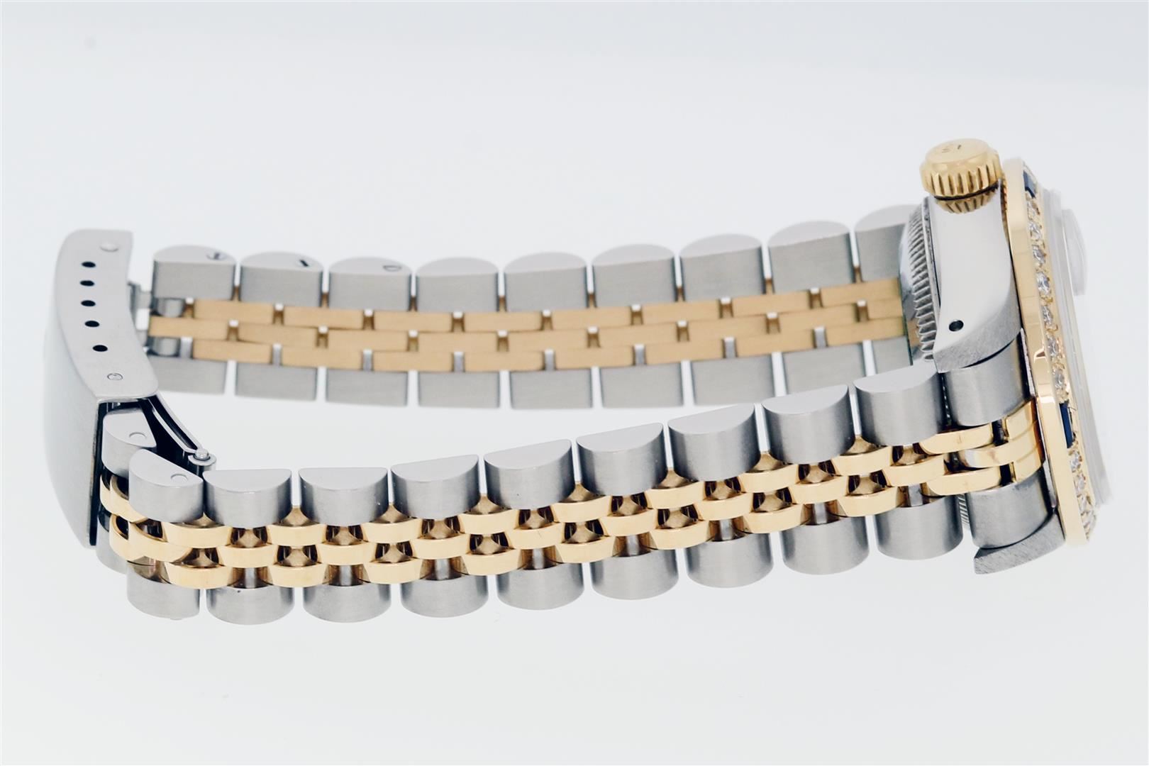 One Ladies Quickset Pre Owned Two Tone 18K Yellow Gold & Stainless Steel Rolex Datejust Polished, Serviced & Electronically Tested, Rolex Yellow Gold & Stainless Steel Case: 26mm, Rolex Yellow Gold Crown, Custom Bezel: New 18K Yellow Gold Sapphire Diamond