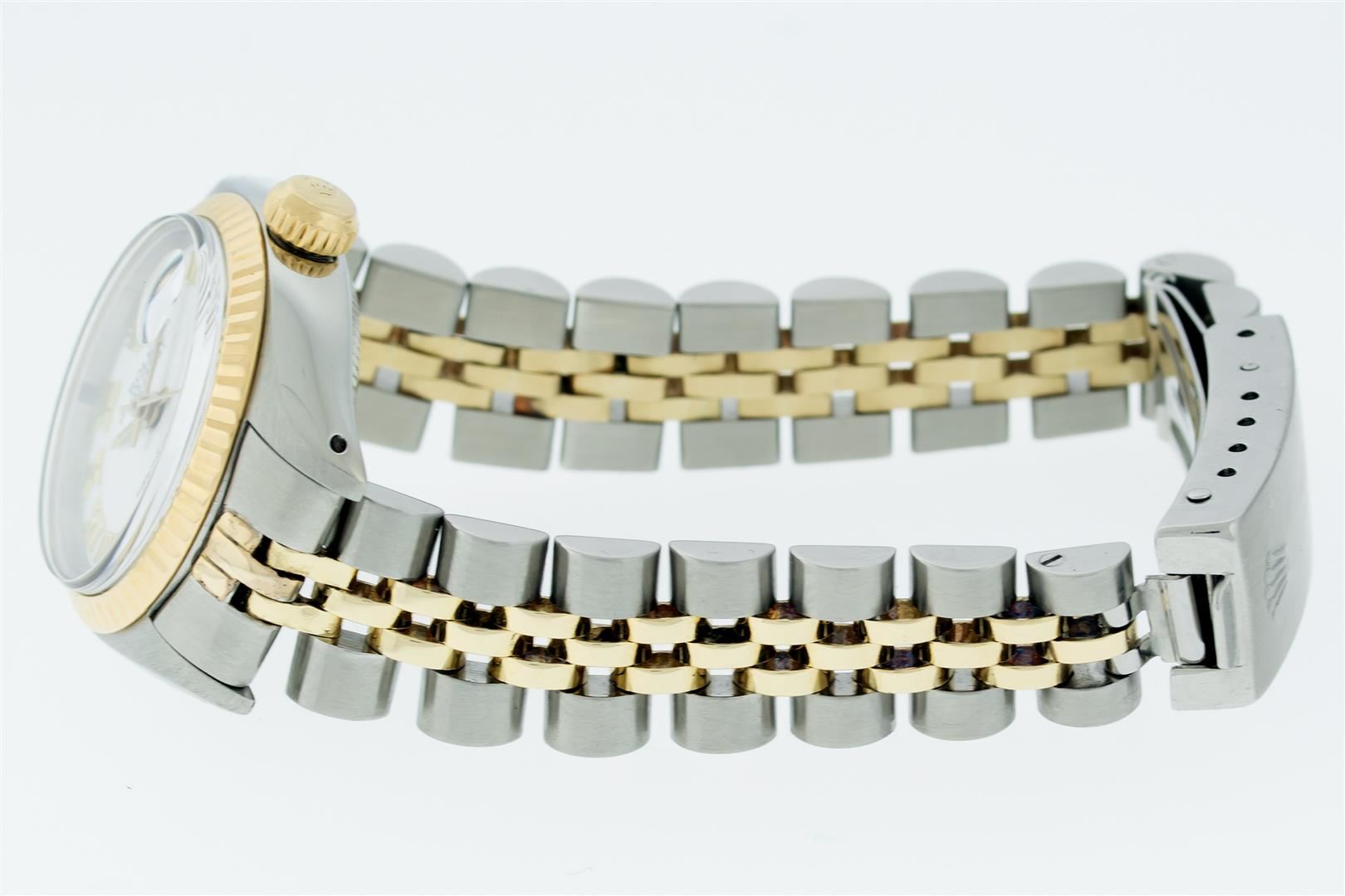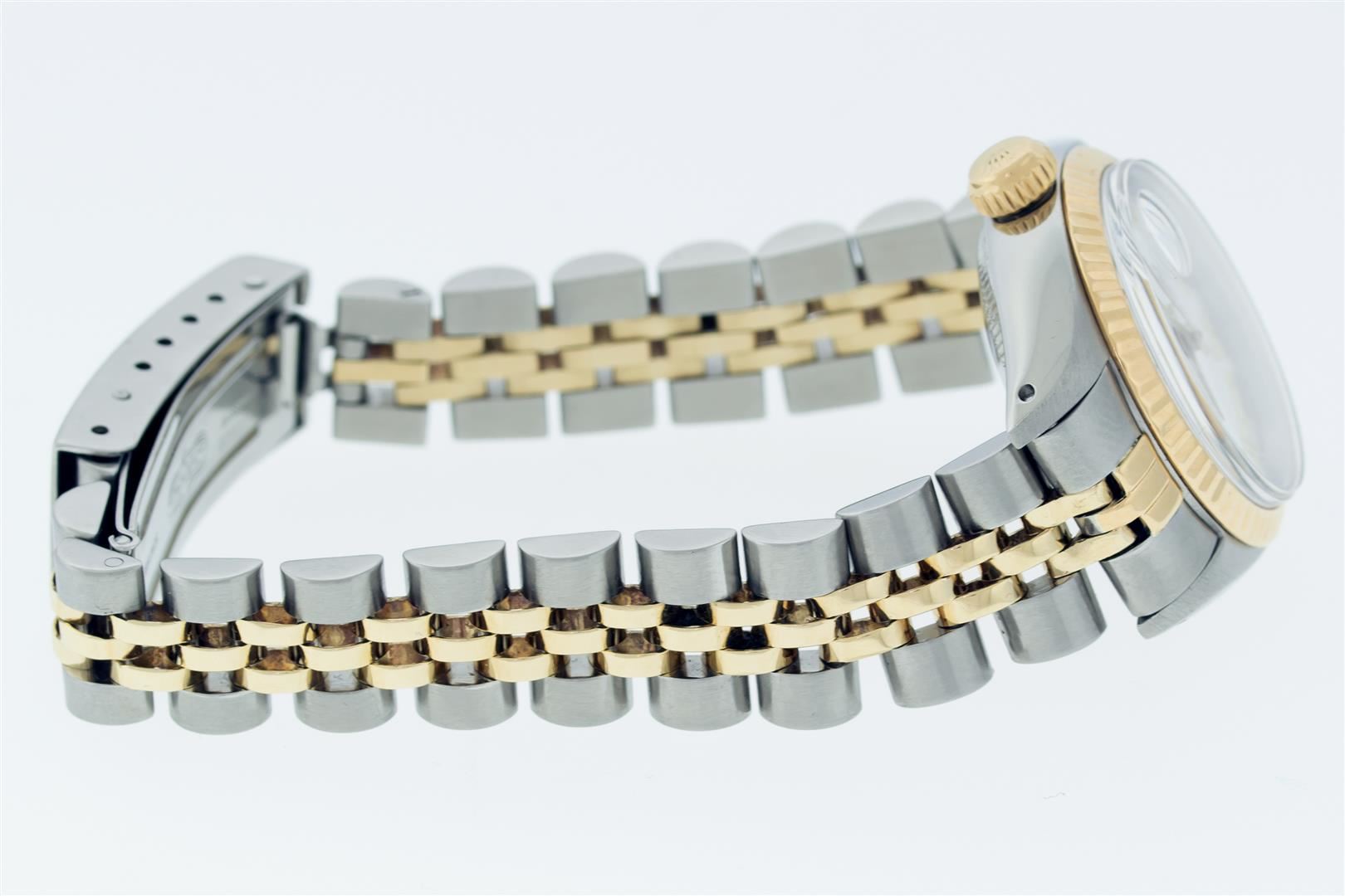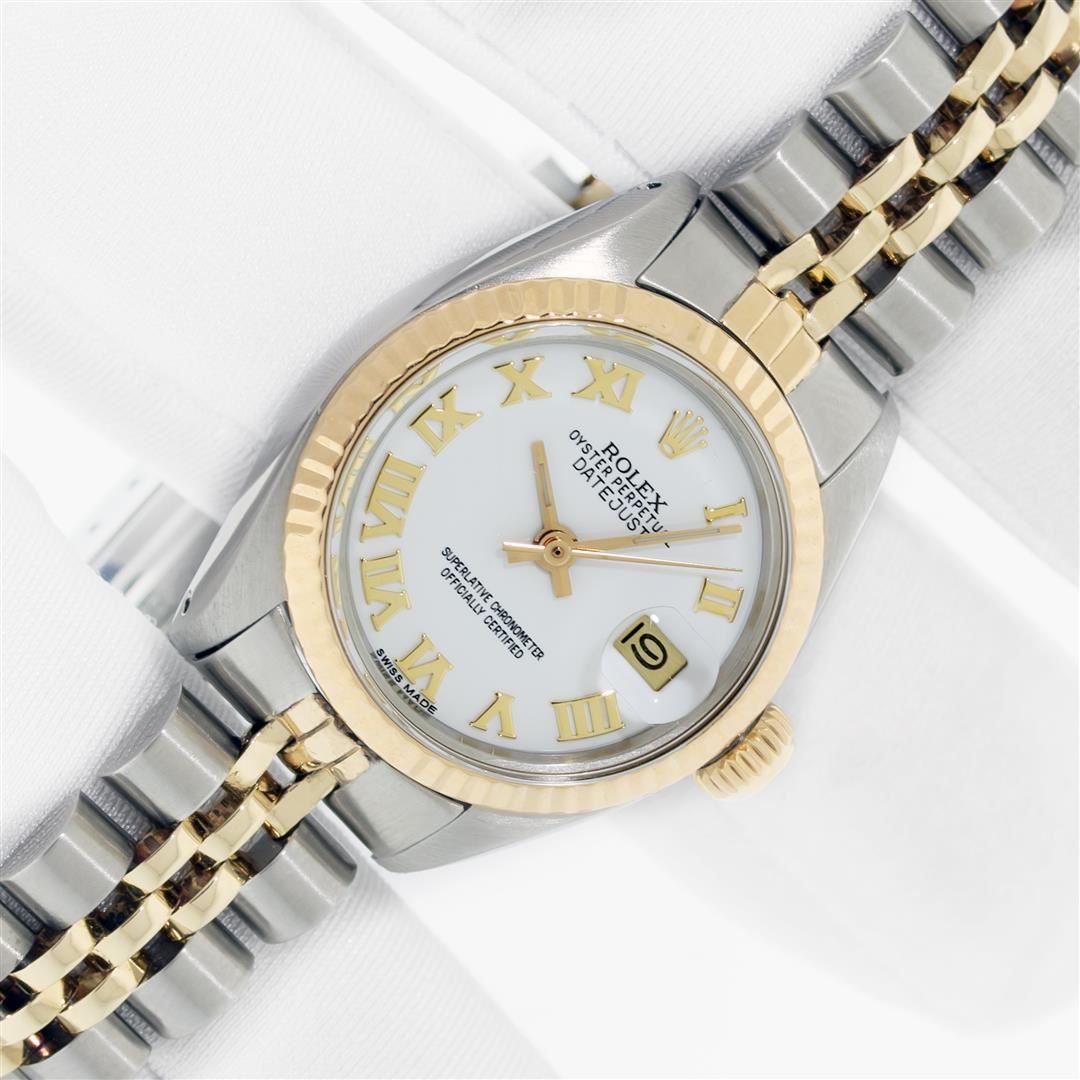Rolex Ladies Pre Owned 18K Yellow Gold and Stainless Steel Two Tone Wristwatch Polished Bright with Satin Finish, Serviced & Electronically Tested, Rolex Stainless Steel Case: 26mm, Rolex Yellow Gold Crown, Rolex Bezel: Rolex 18K Yellow Gold Fluted Bezel. Crystal: Sapphire With Magnified Date Window. Hands: Non luminous hands. Rolex Movement: Quickset Automatic Winding Movement. Rolex Dial: White Dial With Roman Hour Markers, Date Window: 3 O'Clock Position Date Display, Model: Quickset Datejust, Condition: G-6 Extra Fine. Rolex Bracelet: Stainless Steel and 18K Yellow Gold Jubilee Band. Bright Polish & Satin Finish. 6.0 Inch Length, Adjustable. Standard Clasp, With Rolex Logo. This Watch Has Been Serviced Time Tested And Is In Excellent Condition It Is Free Of All Scratches And Dents.