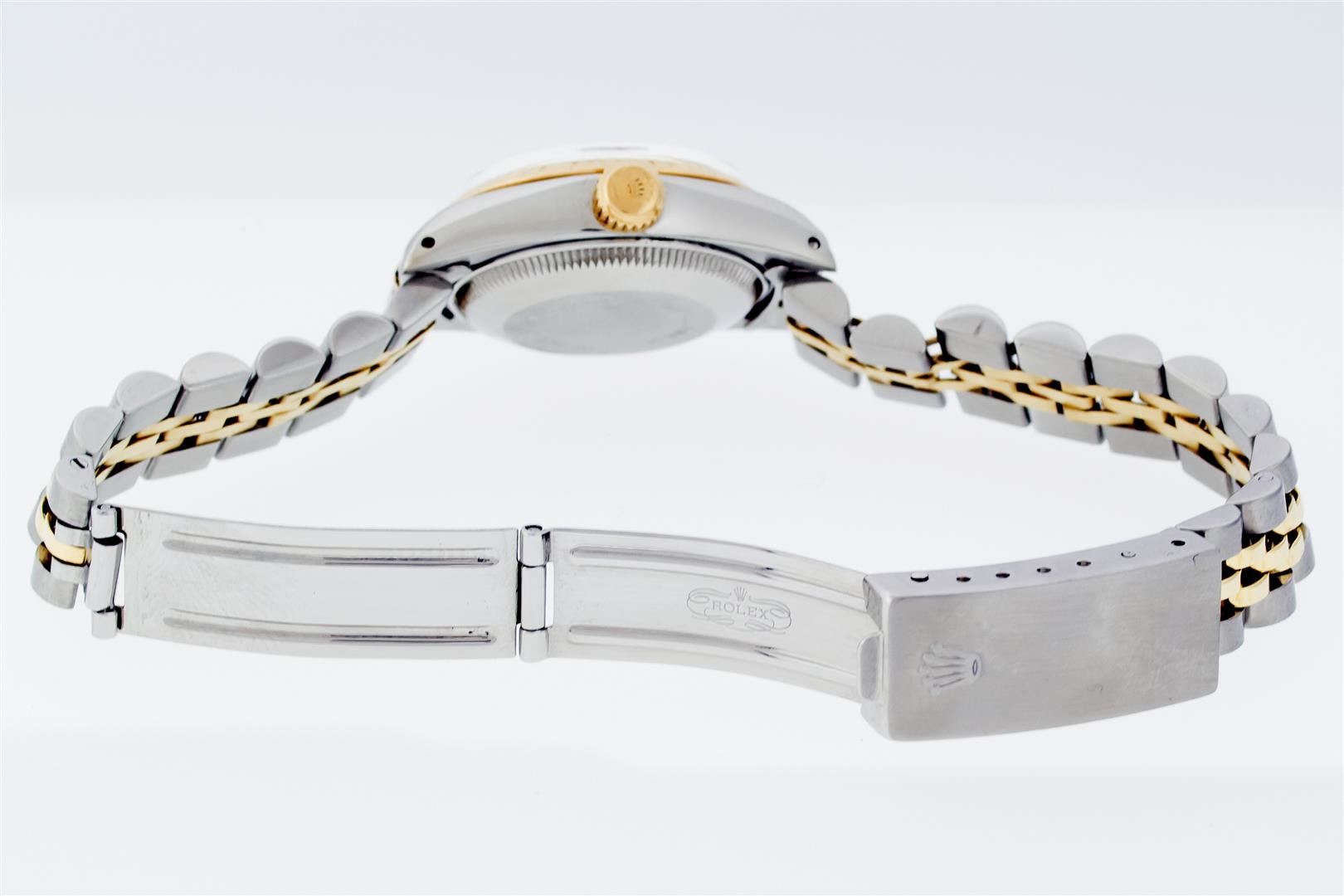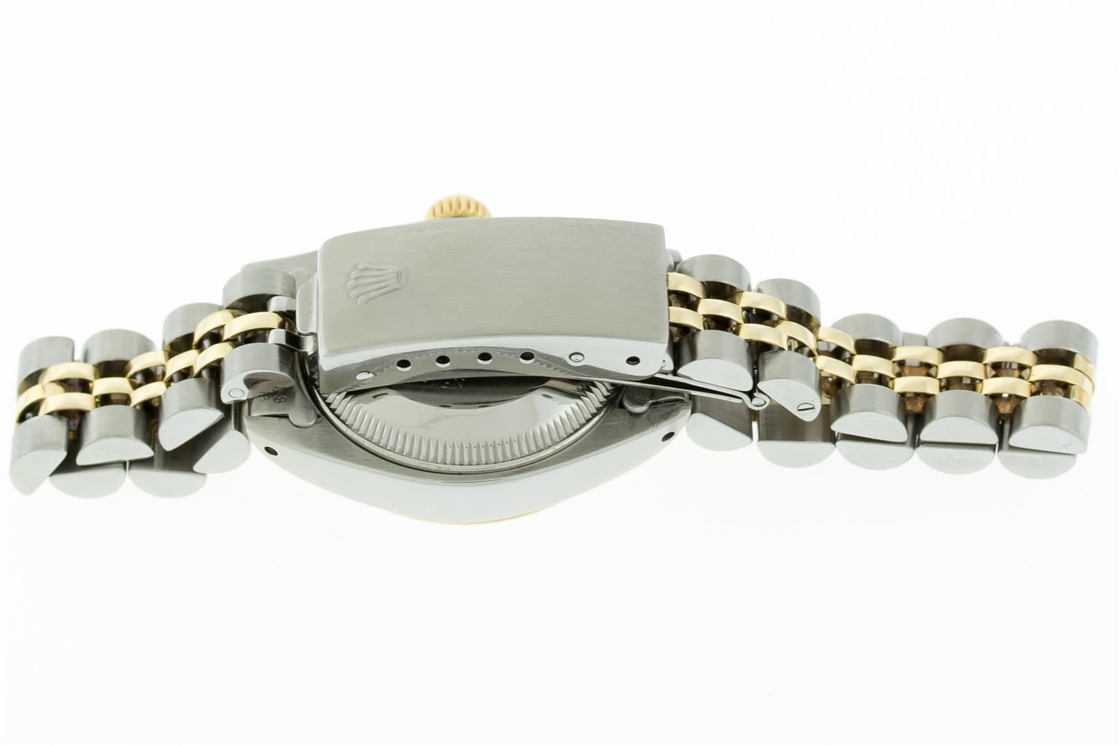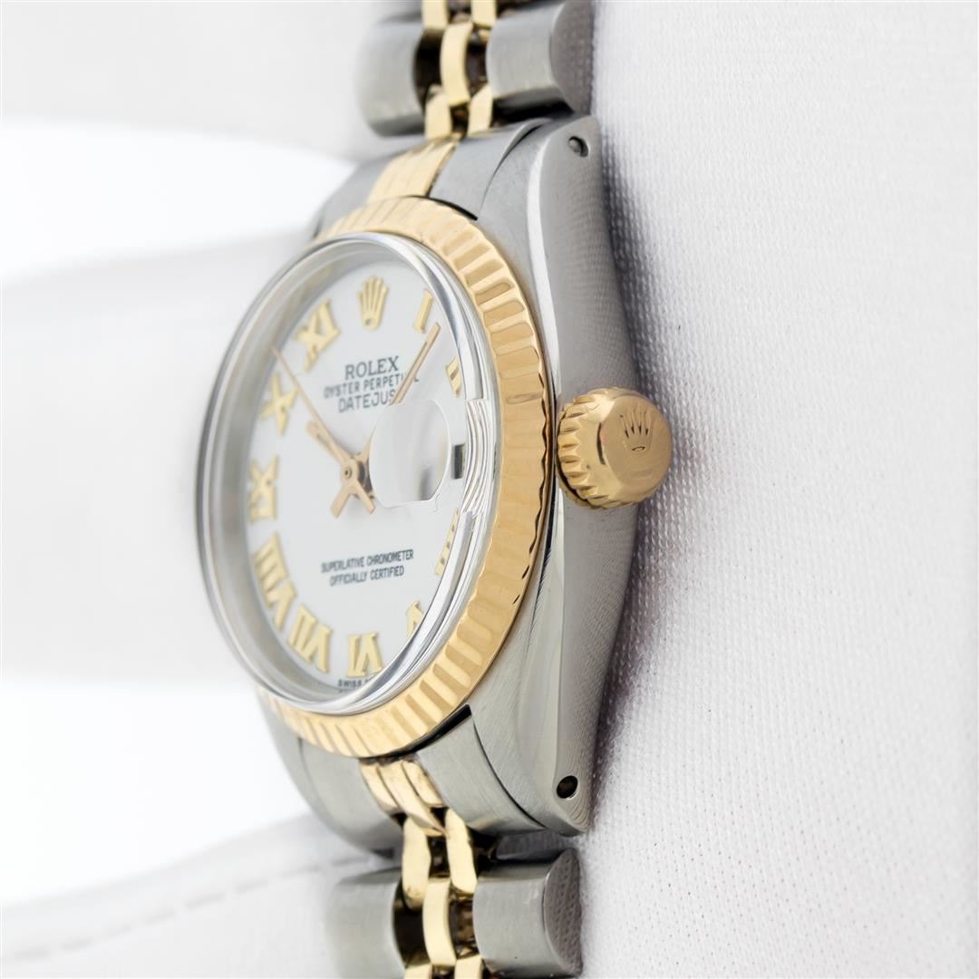 Rolex Ladies Pre Owned 18K Yellow Gold and Stainless Steel Two Tone Wristwatch Polished Bright with Satin Finish, Serviced & Electronically Tested, Rolex Stainless Steel Case: 26mm, Rolex Yellow Gold Crown, Rolex Bezel: Rolex 18K Yellow Gold Fluted Bezel. Crystal: Sapphire With Magnified Date Window. Hands: Non luminous hands. Rolex Movement: Quickset Automatic Winding Movement. Rolex Dial: White Dial With Roman Hour Markers, Date Window: 3 O'Clock Position Date Display, Model: Quickset Datejust, Condition: G-6 Extra Fine. Rolex Bracelet: Stainless Steel and 18K Yellow Gold Jubilee Band. Bright Polish & Satin Finish. 6.0 Inch Length, Adjustable. Standard Clasp, With Rolex Logo. This Watch Has Been Serviced Time Tested And Is In Excellent Condition It Is Free Of All Scratches And Dents.