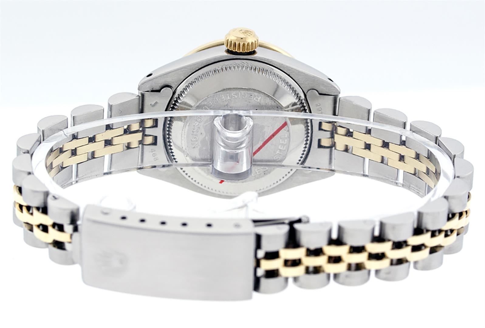 One Ladies Two Tone Rolex Datejust Polished, Serviced & Electronically Tested, Yellow Gold & Stainless Steel Case: 26mm, Yellow Gold Crown, Custom Bezel: New 18K Yellow Gold Emerald Beadset Diamond Bezel, Diamond + Gem Count: 28 Diamonds + 4 Emeralds Total Weight .70 Carat, Clarity: SI-VS, Color: G to H. Custom Crystal: New Scratch Resistant Synthetic Sapphire Cyclops Lens. Custom Hands: New Luminescent Hands. Movement: Automatic Winding Movement. Custom Dial: White Set With Diamond Hour Markers & Dash Track, Diamond Count: 10 Diamond in Dial, G To H In Color, SI-VS Clarity. Date Window: 3 O'Clock Position Date Display, Model: Datejust, Condition: G-6 Extra Fine. Bracelet: Two Tone Yellow Gold & Stainless Steel Jubilee Band. Bright Polish. 6.0 Inch Length, Adjustable. Standard Clasp, With Rolex Logo. This Watch Has Been Serviced Time Tested And Is In Excellent Condition It Is Free Of All Scratches And Dents.