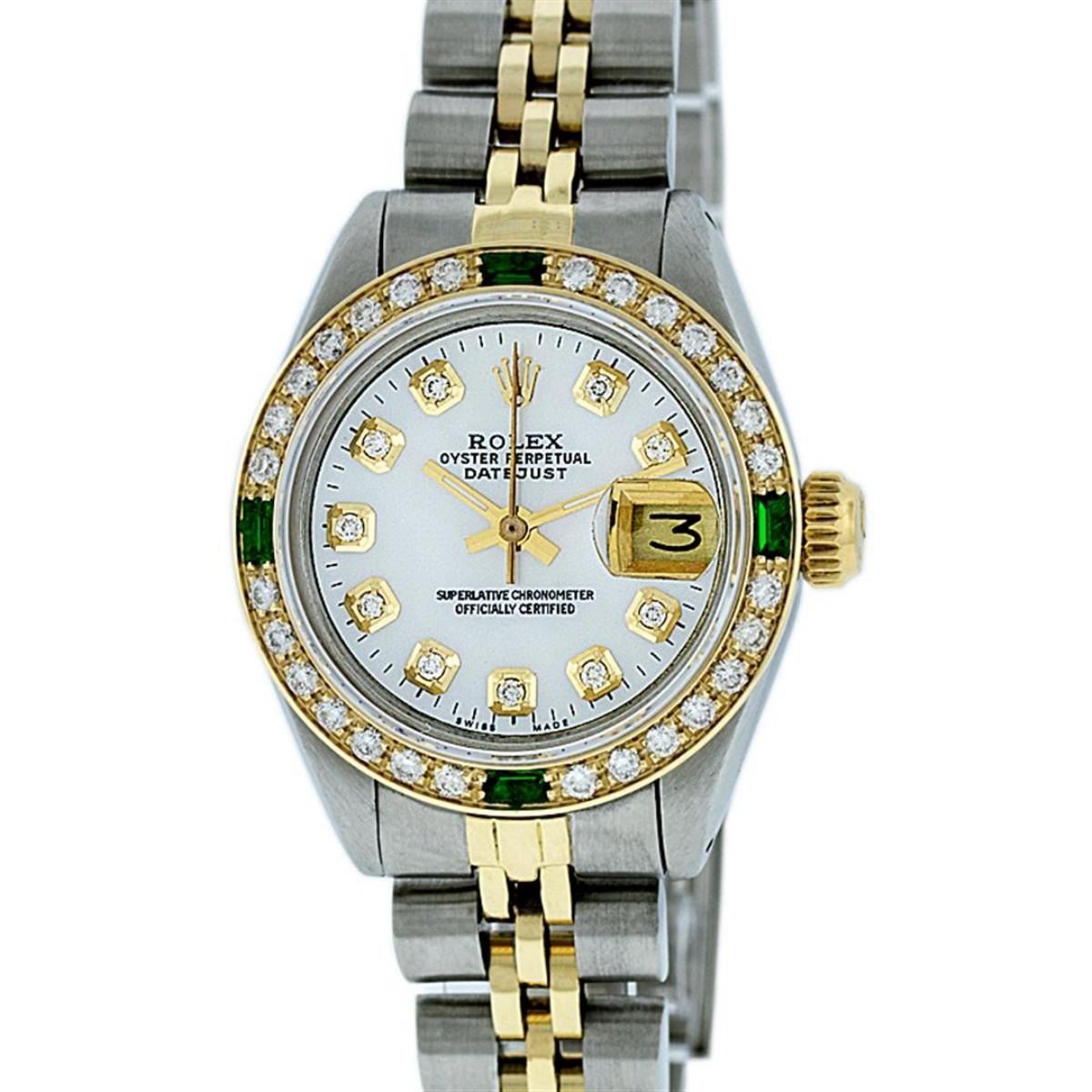 One Ladies Two Tone Rolex Datejust Polished, Serviced & Electronically Tested, Yellow Gold & Stainless Steel Case: 26mm, Yellow Gold Crown, Custom Bezel: New 18K Yellow Gold Emerald Beadset Diamond Bezel, Diamond + Gem Count: 28 Diamonds + 4 Emeralds Total Weight .70 Carat, Clarity: SI-VS, Color: G to H. Custom Crystal: New Scratch Resistant Synthetic Sapphire Cyclops Lens. Custom Hands: New Luminescent Hands. Movement: Automatic Winding Movement. Custom Dial: White Set With Diamond Hour Markers & Dash Track, Diamond Count: 10 Diamond in Dial, G To H In Color, SI-VS Clarity. Date Window: 3 O'Clock Position Date Display, Model: Datejust, Condition: G-6 Extra Fine. Bracelet: Two Tone Yellow Gold & Stainless Steel Jubilee Band. Bright Polish. 6.0 Inch Length, Adjustable. Standard Clasp, With Rolex Logo. This Watch Has Been Serviced Time Tested And Is In Excellent Condition It Is Free Of All Scratches And Dents.