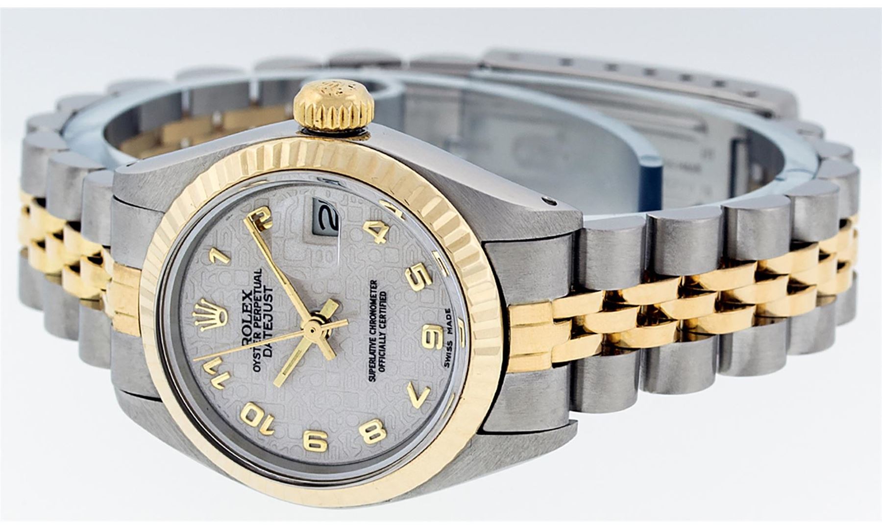 One Ladies Pre Owned 14K Yellow Gold & Stainless Steel Two Tone Rolex Polished, Serviced & Electronically Tested, 14K Yellow Gold & Stainless Steel Case: 26mm, Yellow Gold Crown, Bezel: 14K Yellow Gold Fluted Bezel. Crystal: Plexiglass With Date Window. Hands: Luminescent Hands. Rolex Movement: Automatic Winding Movement 2030. Rolex Dial: Cream Jubilee With Arabic Hour Markers. Date Window: 3 O'Clock Position Date Display, Model: Date. Condition: G-6 Extra Fine. Rolex Bracelet: Two Tone 14K Yellow Gold & Stainless Steel Jubilee Band. Bright Polish. 6.0 Inch Length, Adjustable. Standard Clasp, With Rolex Logo. This Watch Has Been Serviced Time Tested And Is In Excellent Condition It Is Free Of All Scratches And Dents.