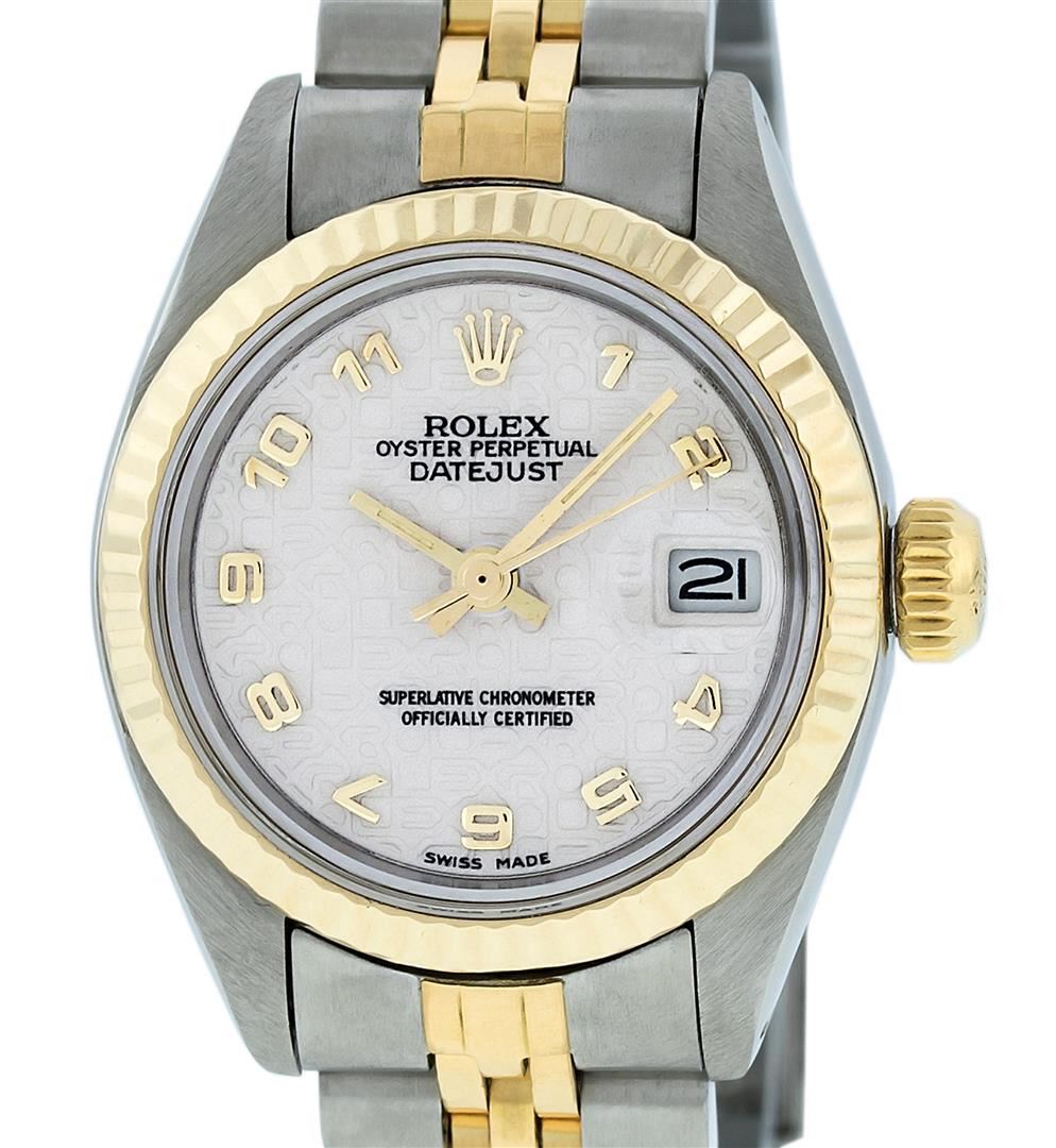One Ladies Pre Owned 14K Yellow Gold & Stainless Steel Two Tone Rolex Polished, Serviced & Electronically Tested, 14K Yellow Gold & Stainless Steel Case: 26mm, Yellow Gold Crown, Bezel: 14K Yellow Gold Fluted Bezel. Crystal: Plexiglass With Date Window. Hands: Luminescent Hands. Rolex Movement: Automatic Winding Movement 2030. Rolex Dial: Cream Jubilee With Arabic Hour Markers. Date Window: 3 O'Clock Position Date Display, Model: Date. Condition: G-6 Extra Fine. Rolex Bracelet: Two Tone 14K Yellow Gold & Stainless Steel Jubilee Band. Bright Polish. 6.0 Inch Length, Adjustable. Standard Clasp, With Rolex Logo. This Watch Has Been Serviced Time Tested And Is In Excellent Condition It Is Free Of All Scratches And Dents.