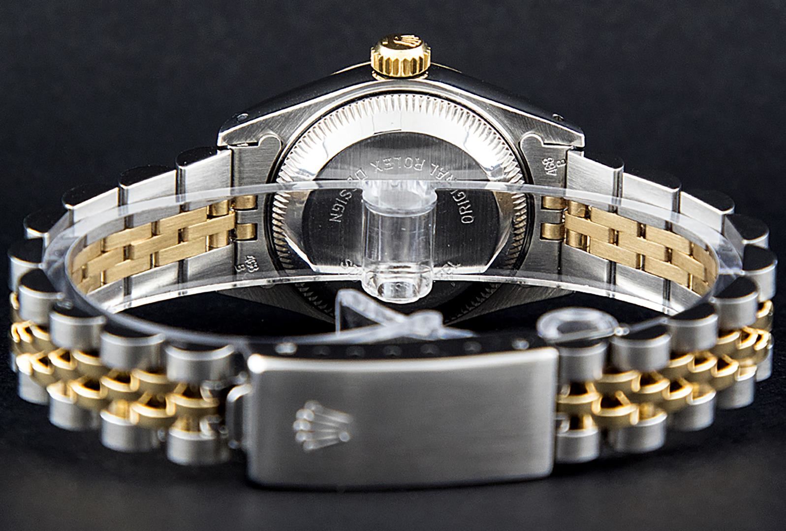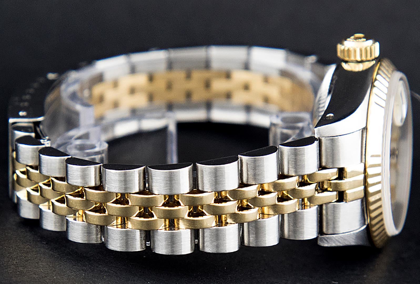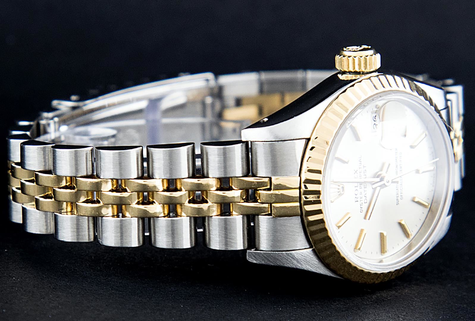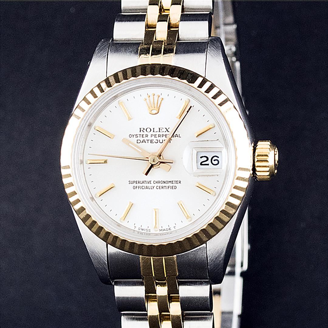 One Ladies Pre Owned Two Tone 14K Yellow Gold And Stainless Steel Rolex Polished, Serviced & Electronically Tested, Rolex Yellow Gold & Stainless Steel Case: 26mm, Rolex Yellow Gold Crown, Rolex Bezel: 14K Yellow Gold Fluted Bezel. Custom Crystal: New Plexiglass With Date Window. Hands: Luminescent Hands. Rolex Movement: Automatic Winding Movement 2030. Custom Dial: White Index With Dash Track. Date Window: 3 O'Clock Position Date Display, Model: Datejust. Condition: G-6 Extra Fine. Rolex Bracelet: Two Tone 14K Yellow Gold & Stainless Steel Jubilee Band. Bright Polish. 6.0 Inch Length, Adjustable. Standard Clasp, With Rolex Logo. This Watch Has Been Serviced Time Tested And Is In Excellent Condition It Is Free Of All Scratches And Dents.