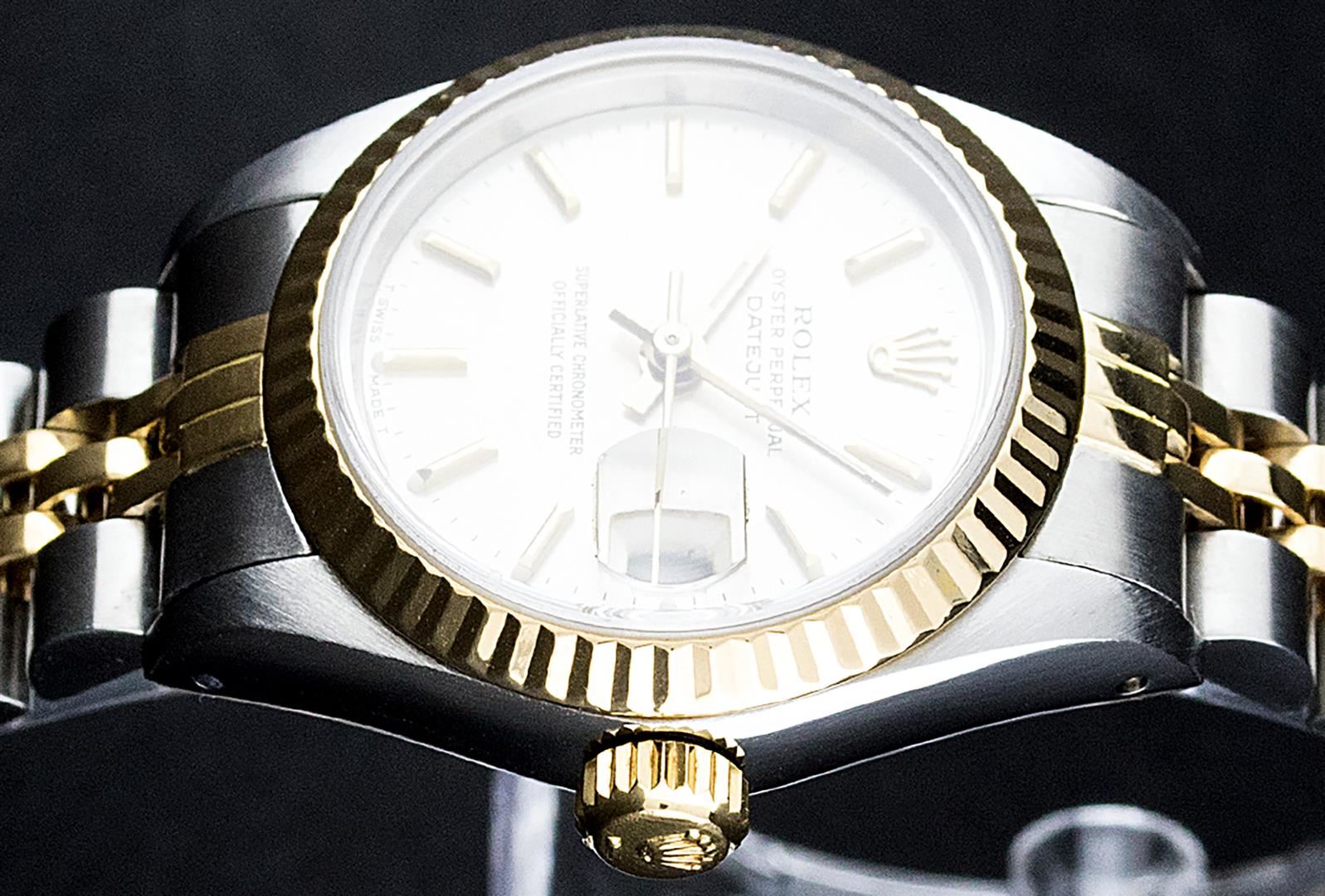 One Ladies Pre Owned Two Tone 14K Yellow Gold And Stainless Steel Rolex Polished, Serviced & Electronically Tested, Rolex Yellow Gold & Stainless Steel Case: 26mm, Rolex Yellow Gold Crown, Rolex Bezel: 14K Yellow Gold Fluted Bezel. Custom Crystal: New Plexiglass With Date Window. Hands: Luminescent Hands. Rolex Movement: Automatic Winding Movement 2030. Custom Dial: White Index With Dash Track. Date Window: 3 O'Clock Position Date Display, Model: Datejust. Condition: G-6 Extra Fine. Rolex Bracelet: Two Tone 14K Yellow Gold & Stainless Steel Jubilee Band. Bright Polish. 6.0 Inch Length, Adjustable. Standard Clasp, With Rolex Logo. This Watch Has Been Serviced Time Tested And Is In Excellent Condition It Is Free Of All Scratches And Dents.