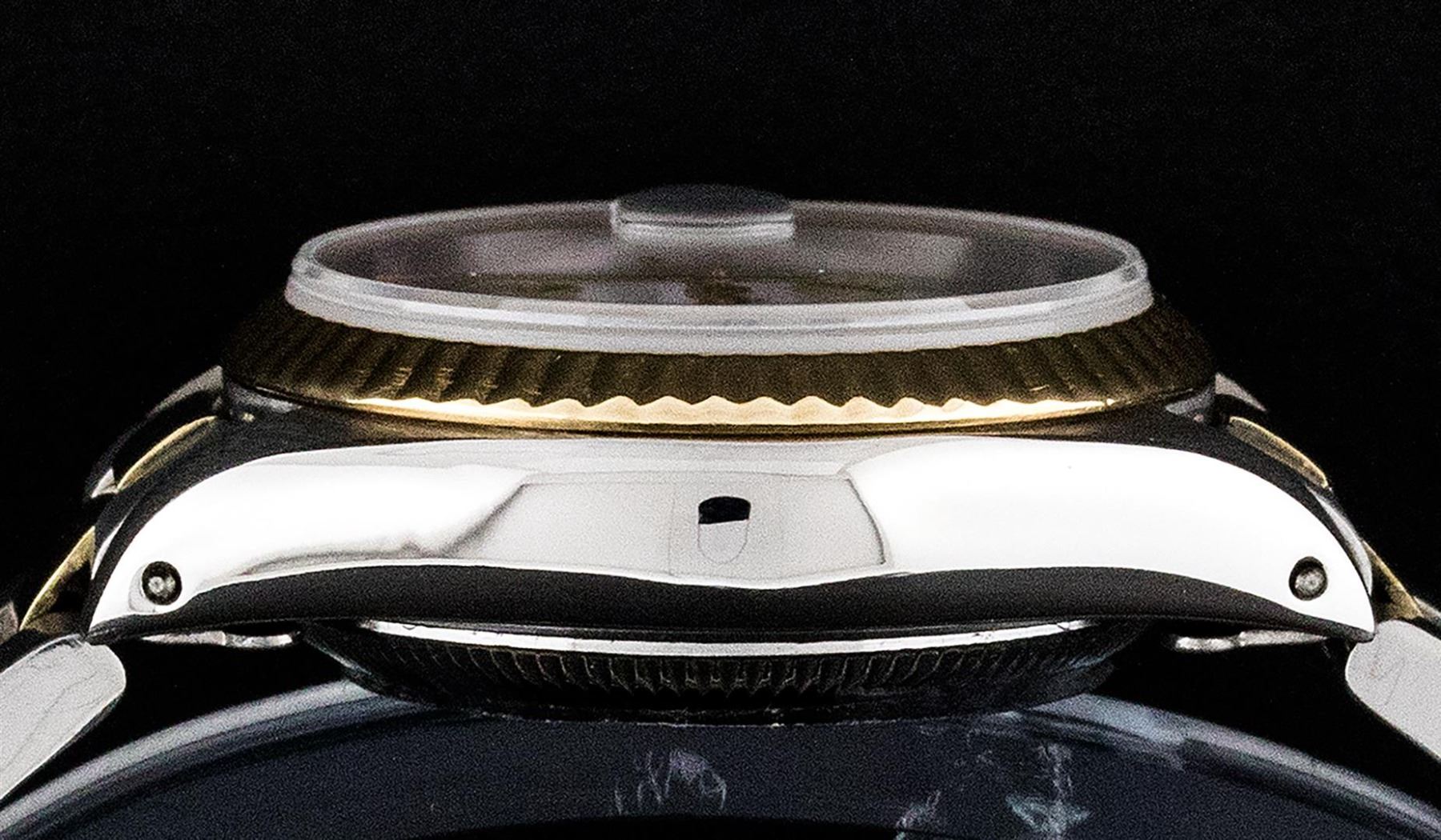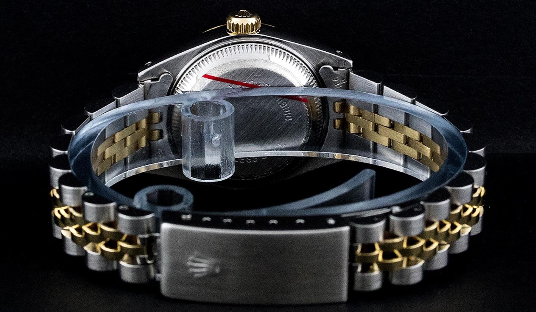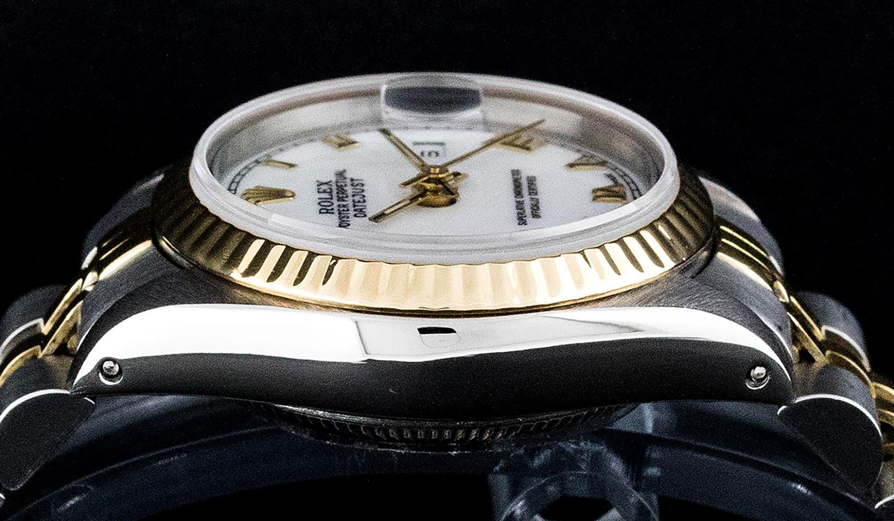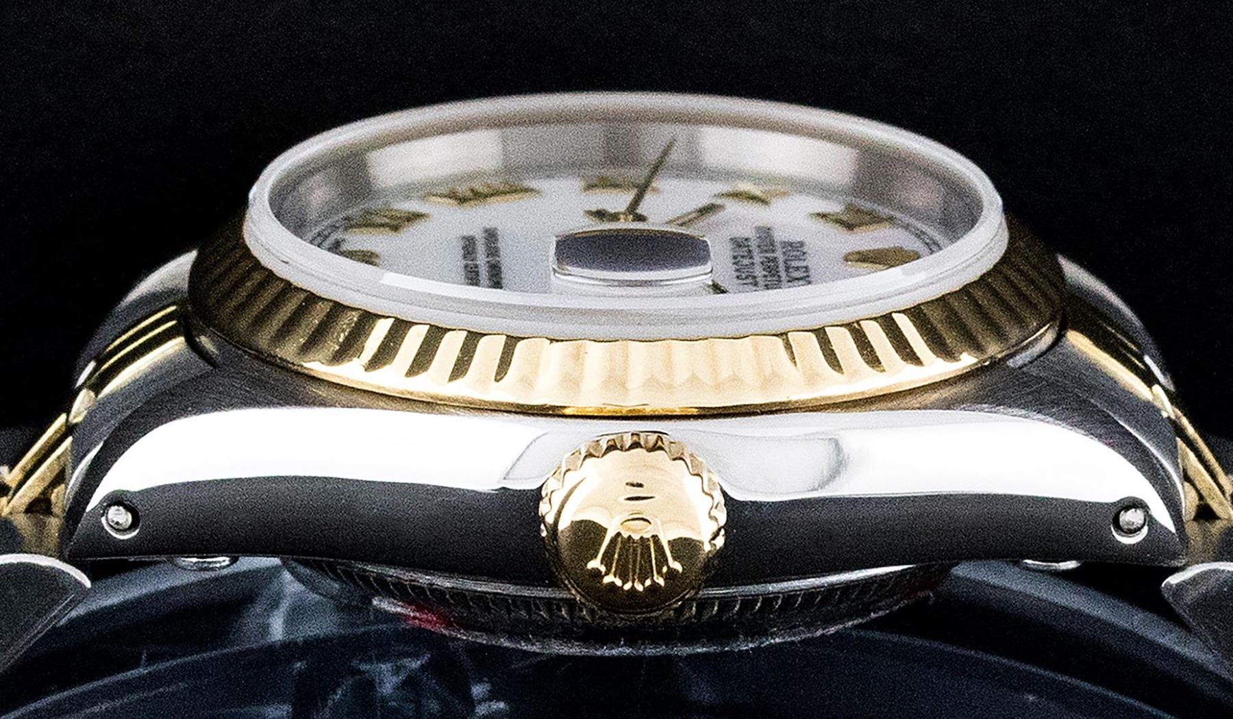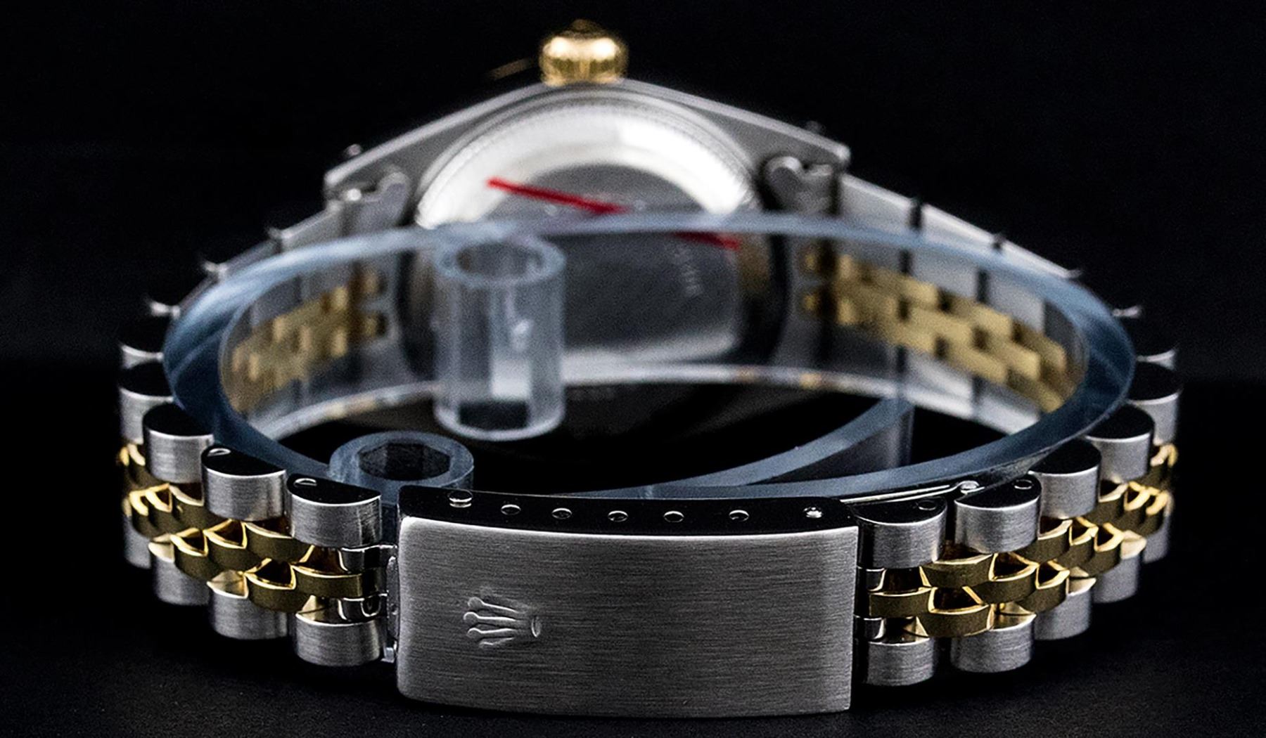 One Ladies Pre Owned Two Tone 14K Yellow Gold & Stainless Steel Rolex Datejust Polished, Serviced & Electronically Tested, Yellow Gold & Stainless Steel Case: 26mm, Yellow Gold Crown, Bezel: 14K Yellow Gold Fluted Bezel. Custom Crystal: New Plexiglass With Date Window. Hands: Luminescent Hands. Rolex Movement: Automatic Winding Movement 2030. Rolex Dial: White Roman With Square Track. Date Window: 3 O'Clock Position Date Display, Model: Datejust. Condition: G-6 Extra Fine. Bracelet: Two Tone 14K Yellow Gold & Stainless Steel Jubilee Band. Bright Polish. 6.0 Inch Length, Adjustable. Standard Clasp, With Rolex Logo. This Watch Has Been Serviced Time Tested And Is In Excellent Condition It Is Free Of All Scratches And Dents.
