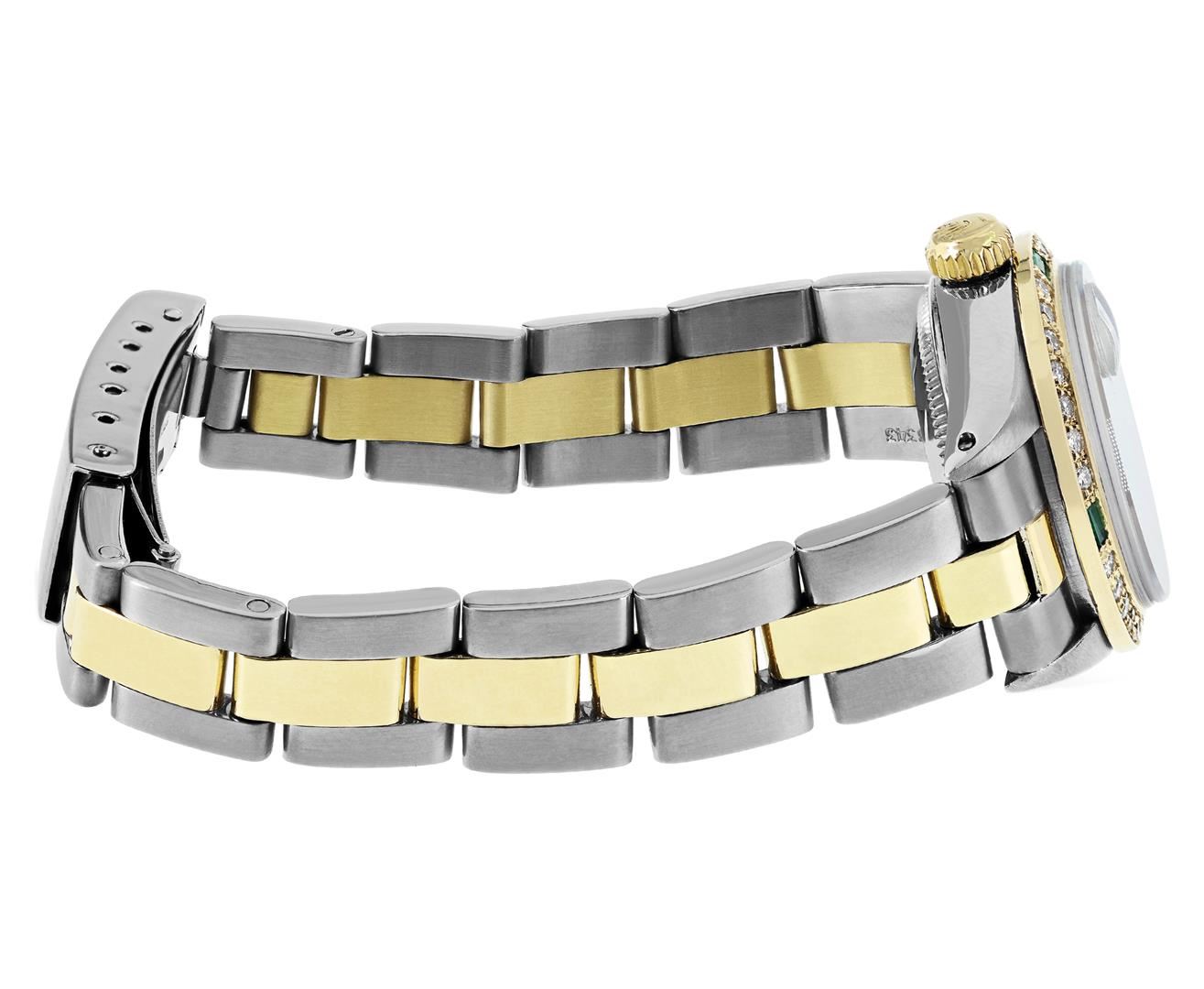 One Rolex Ladies Pre Owned Two Tone Yellow Gold & Stainless Steel Rolex Date Watch Polished, Serviced & Electronically Tested, Rolex Yellow Gold & Stainless Steel Case: 26mm, Rolex Yellow Gold Crown. Custom Bezel: New 18K Yellow Gold Emerald Beadset Diamo