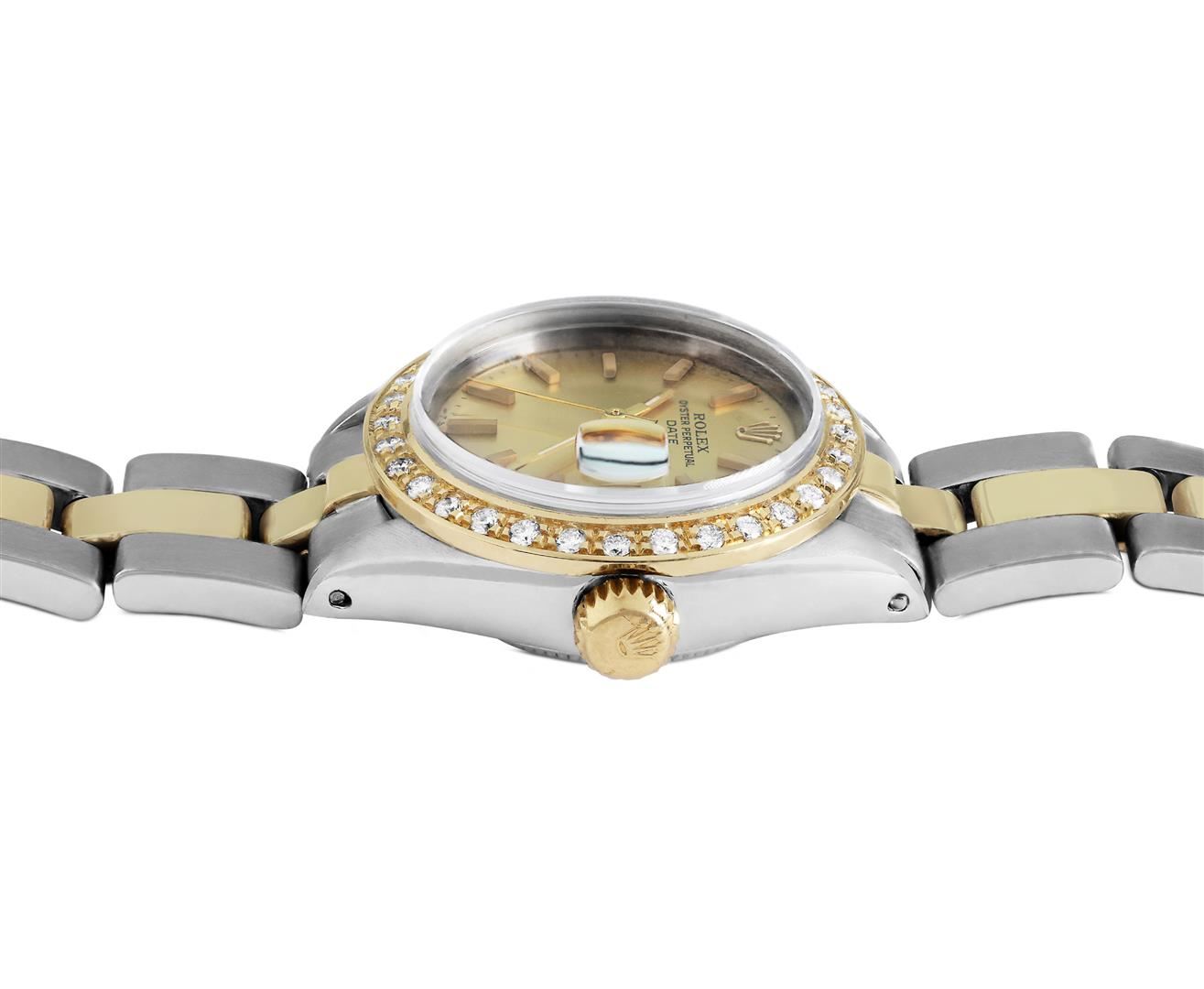 One Rolex Ladies Pre Owned Two Tone 14K Yellow Gold & Stainless Steel Rolex Date Watch Polished, Serviced & Electronically Tested, Rolex Yellow Gold & Stainless Steel Case: 26mm, Rolex Yellow Gold Crown. Custom Bezel: New 18K Yellow Gold Beadset Diamond B