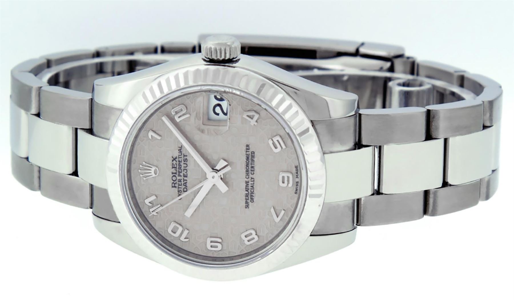 One Womens Midsize Stainless Steel Rolex Datejust Polished, Serviced & Electronically Tested, Rolex Stainless Steel Case Case: 31mm, Rolex Stainless Steel Crown, Rolex Bezel: 18K White Gold Fluted Bezel, Crystal: Sapphire With Cyclops Lens. Hands: White Hands. Rolex Movement: Automatic Winding Movement Caliber 2235. Rolex Dial: Cream Jubilee Dial With Arabic Hour Markers, Date Window: 3 O'Clock Position Date Display, Quickset, Model: Midsize Datejust. Condition: G-6 Extra Fine. Rolex Bracelet: Stainless Steel Oyster Band. Bright Polish. 6.0 Inch Length, Adjustable. Standard Clasp, With Rolex Logo. This Pre Owned Watch Has Been Serviced Time Tested And Is In Excellent Condition It Is Free Of All Scratches And Dents.