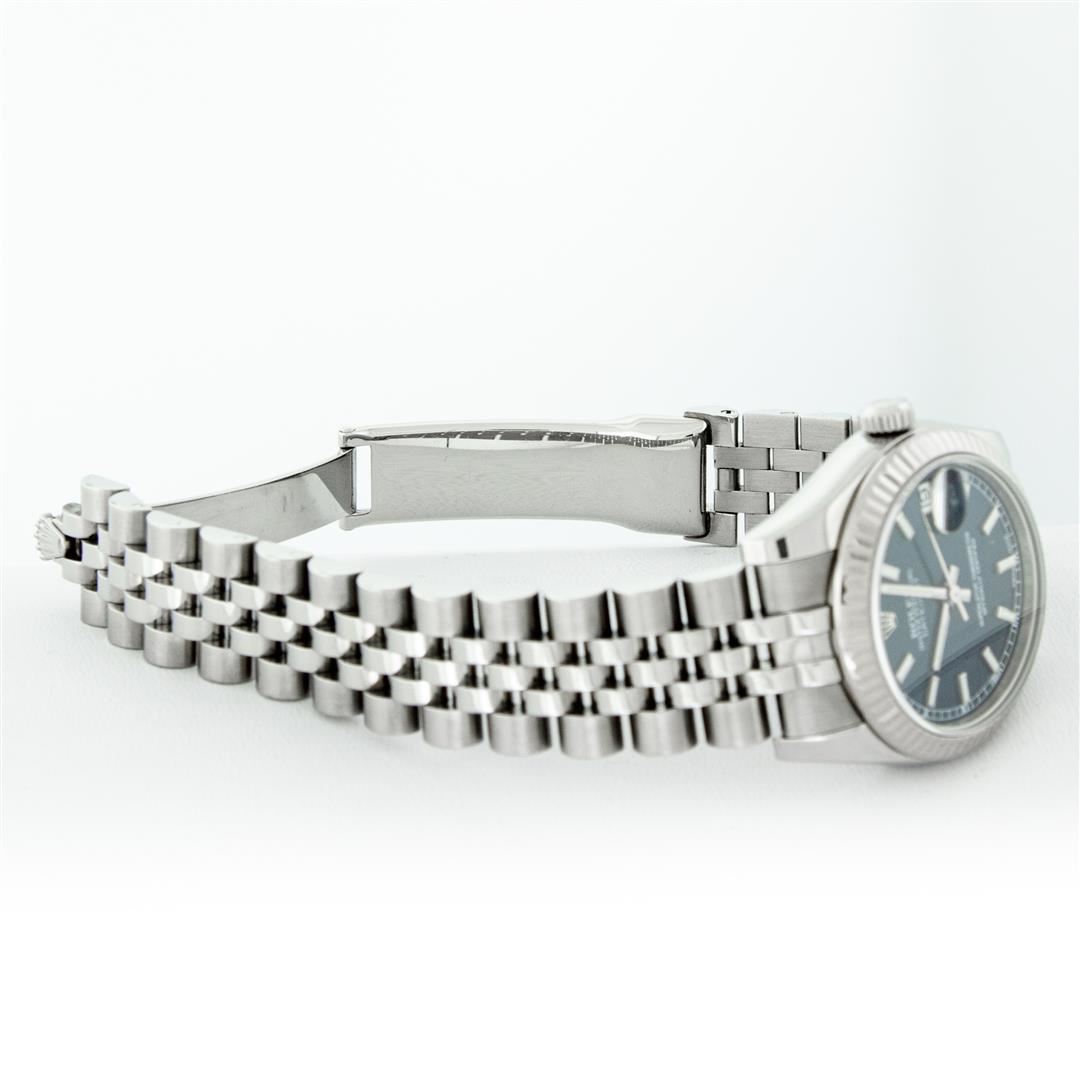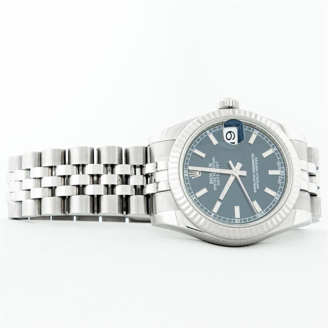One Women's Midsize Stainless Steel Rolex Datejust Polished, Serviced & Electronically Tested, Stainless Steel Case Case: 31mm, Stainless Steel Crown, Bezel: 18K White Gold Fluted Bezel, Crystal: Sapphire With Magnified Date Window. Hands: Luminescent Hands. Rolex Movement: Automatic Winding Movement Caliber 2235. Rolex Dial: Blue Index Dial With Square Roman Track, Date Window: 3 O'Clock Position Date Display, Quickset, Model: Sapphire Quickset Midsize Datejust. Condition: G-6 Extra Fine. Rolex Bracelet: Stainless Steel Jubilee Band With Hidden Clasp. Bright Polish. 6.0 Inch Length, Adjustable. Hidden Clasp, With Rolex Logo. This Pre Owned Watch Has Been Serviced Time Tested And Is In Excellent Condition It Is Free Of All Scratches And Dents.