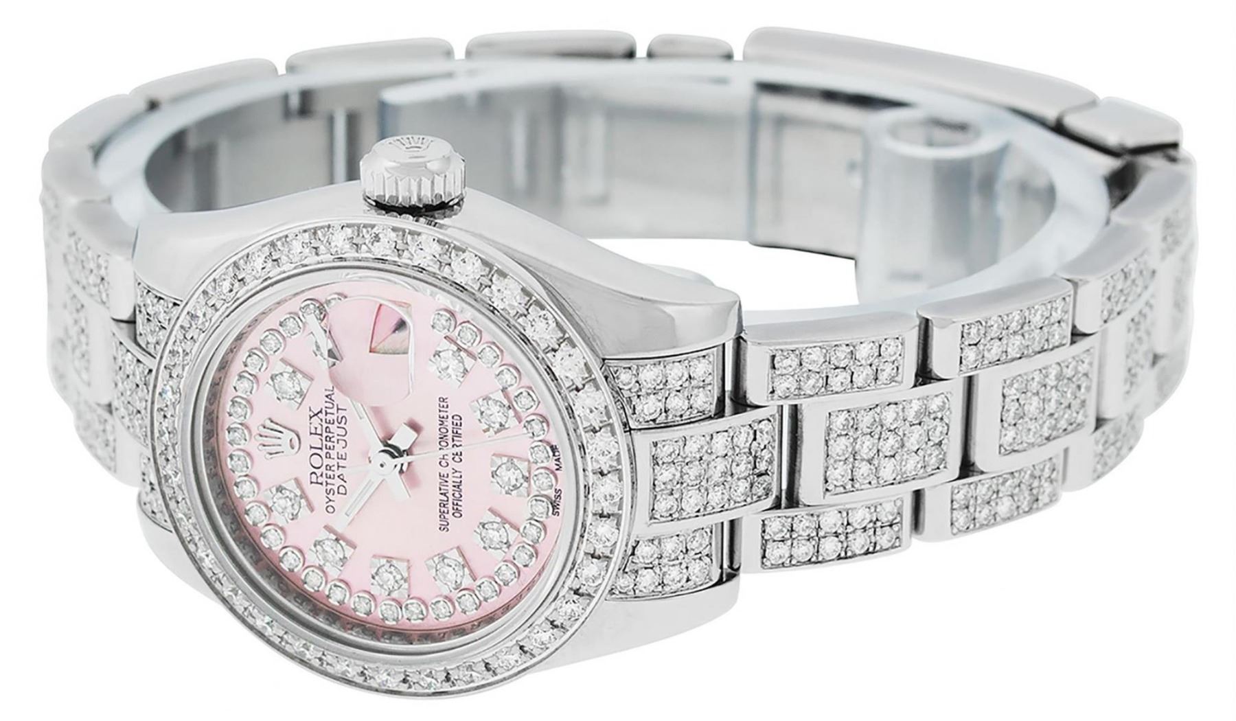 One Quickset Ladies Stainless Steel Rolex Datejust Polished Bright with Satin Finish, Serviced & Electronically Tested, Stainless Steel Case: 26mm, Stainless Steel Crown, Custom Bezel: New 18K White Gold Beadset Diamond Bezel, Stone Count: 32 Diamonds On Bezel, Total Bezel Weight .70 Carat, Clarity: SI-VS, Color: G to H. Custom Crystal: New Scratch Resistant Synthetic Sapphire Cyclops Lens. Custom Hands: New Luminescent Hands. Movement: Automatic Winding Movement. Custom Dial: Refinished Pink Single Cut Diamond Dial, Stone Count: 43 Diamonds On Dial, G To H In Color, Clarity: VS. Date Window: 3 O'Clock Position Date Display, Model: 179160 Quickset Datejust. Condition: G-6 Extra Fine. Bracelet: Stainless Steel Oyster Band With Custom Added Diamonds On Band, Band Diamond Carat Weight: 4.10ctw, Color: G to H, Clarity: SI-VS2, Bright Polish & Satin Finish. 6.0 Inch Length, Adjustable. Standard Clasp, With Rolex Logo. This Watch Has Been Serviced Time Tested And Is In Excellent Condition It Is Free Of All Scratches And Dents. This Watch Comes With Rolex Box.