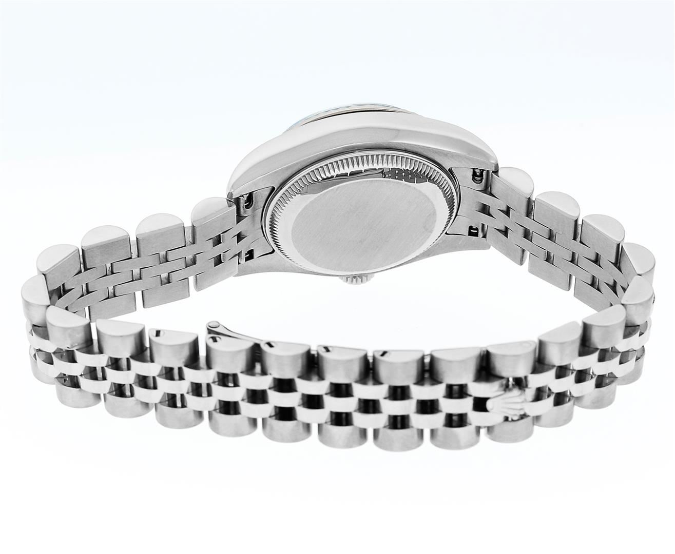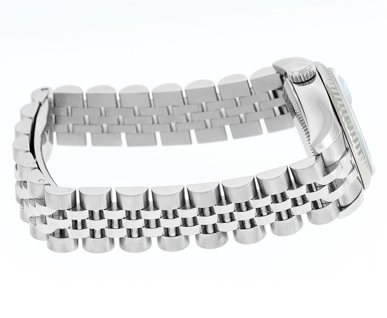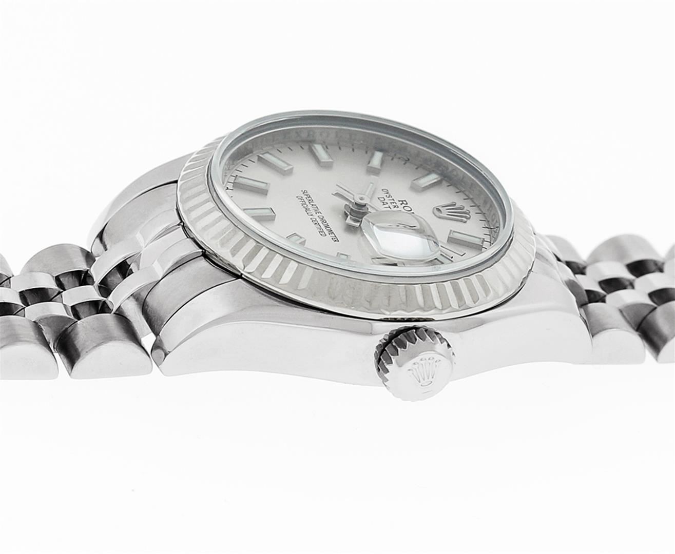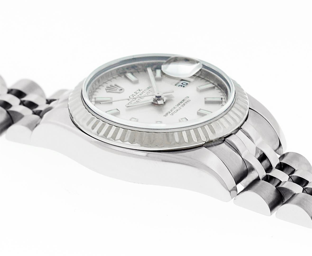 One New Style Ladies Pre Owned Quickset Stainless Steel Rolex Datejust Polished Bright with Satin Finish, Serviced & Electronically Tested, Rolex Stainless Steel Case: 26mm. Rolex Stainless Steel Crown, Rolex Bezel: 18K White Gold Fluted Bezel. Crystal: Sapphire With Magnified Date Window. Hands: Lumi Hands. Rolex Movement: Quickset Automatic Winding Movement 2235. Rolex Dial: White Index With Dash Track. Date Window: 3 O'Clock Position Date Display, Model: Sapphire Quickset Datejust. Condition: G-6 Extra Fine. Rolex Bracelet: Stainless Steel Jubilee Band With Hidden Clasp. Bright Polish & Satin Finish. 6.0 Inch Length, Adjustable. Hidden Clasp, With Rolex Logo. This Watch Has Been Serviced Time Tested And Is In Excellent Condition It Is Free Of All Scratches And Dents.